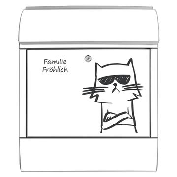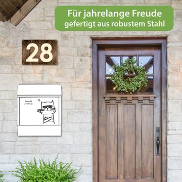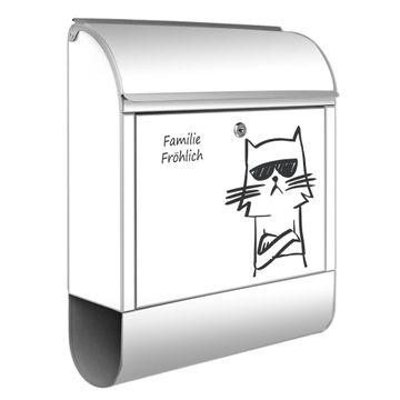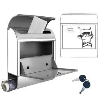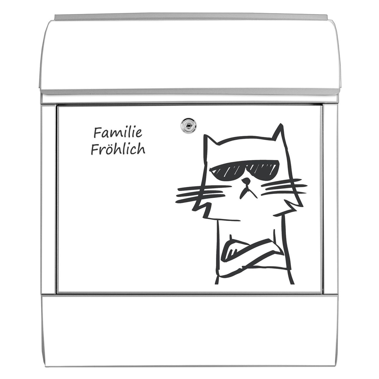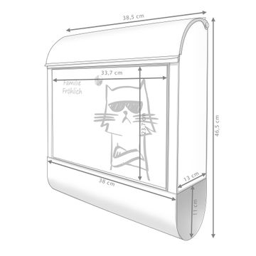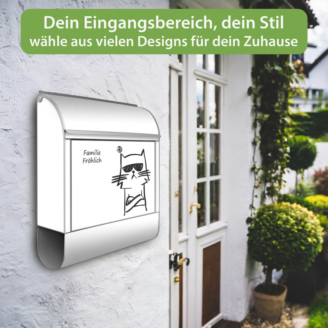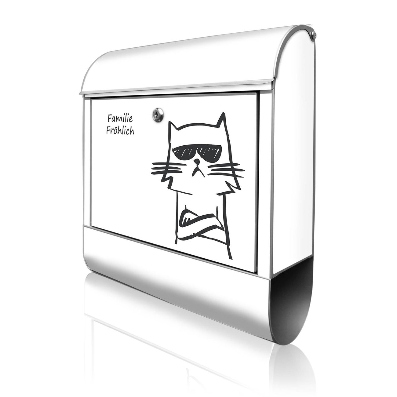 DESIGN: Der Postkasten mit Motiv Motiv Coole Katze hat ein sehr ansprechendes und ausgefallenes Design, damit entlocken Sie Ihren Nachbarn und dem Postboten ein Lächeln. Heben Sie Sich von der tristen grauen Masse ab, ohne auf Funktionalität zu verzichten. DETAILS: Der Postkasten besteht aus pulverbeschichtetem Stahl. Er ist 38x46x12,5cm groß. Das Motiv besteht aus einer wetter- und UV-resistenten Folie, die mit einem Schutzlaminat überzogen ist, sodass der Briefkasten zusätzlich vor Kratzern geschützt ist. Der Briefkasten wird mit Montagematerial, zusätzlich zwei Schlüssel sowie einer Bohrschablone geliefert. NUTZEN: Sie können diesen Briefkasten sowohl als Wandbriefkasten montieren oder einen passenden Ständer kaufen und als Standbriefkasten einbetonieren. Die Größe bietet genügend Platz für Sendungen aller Art, der Einwurf fasst auch größere A4 Sendungen. BANJADO: Ihr Briefkasten wird in Sachsen in einer kleinen Manufaktur von Hand veredelt. Die Motivfolie ist lösungsmittelfrei und schutzlaminiert für einen langen Halt. Wir legen großen Wert auf die Verbindung von Funktionalität und Design. Sie erhalten Handarbeit aus Sachsen.