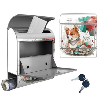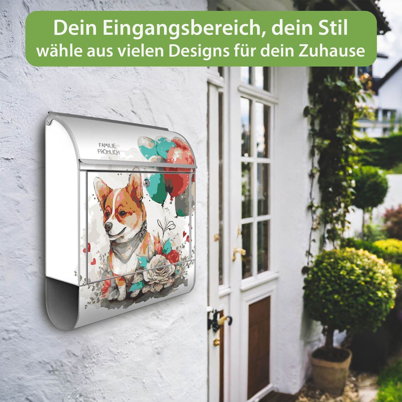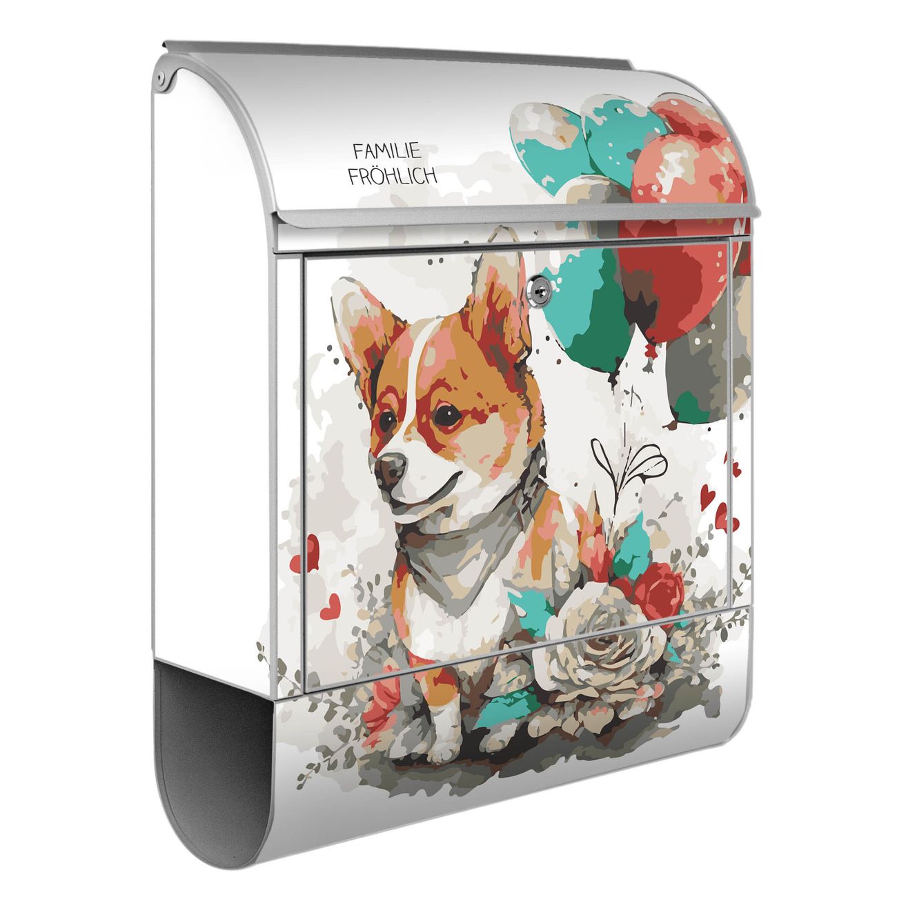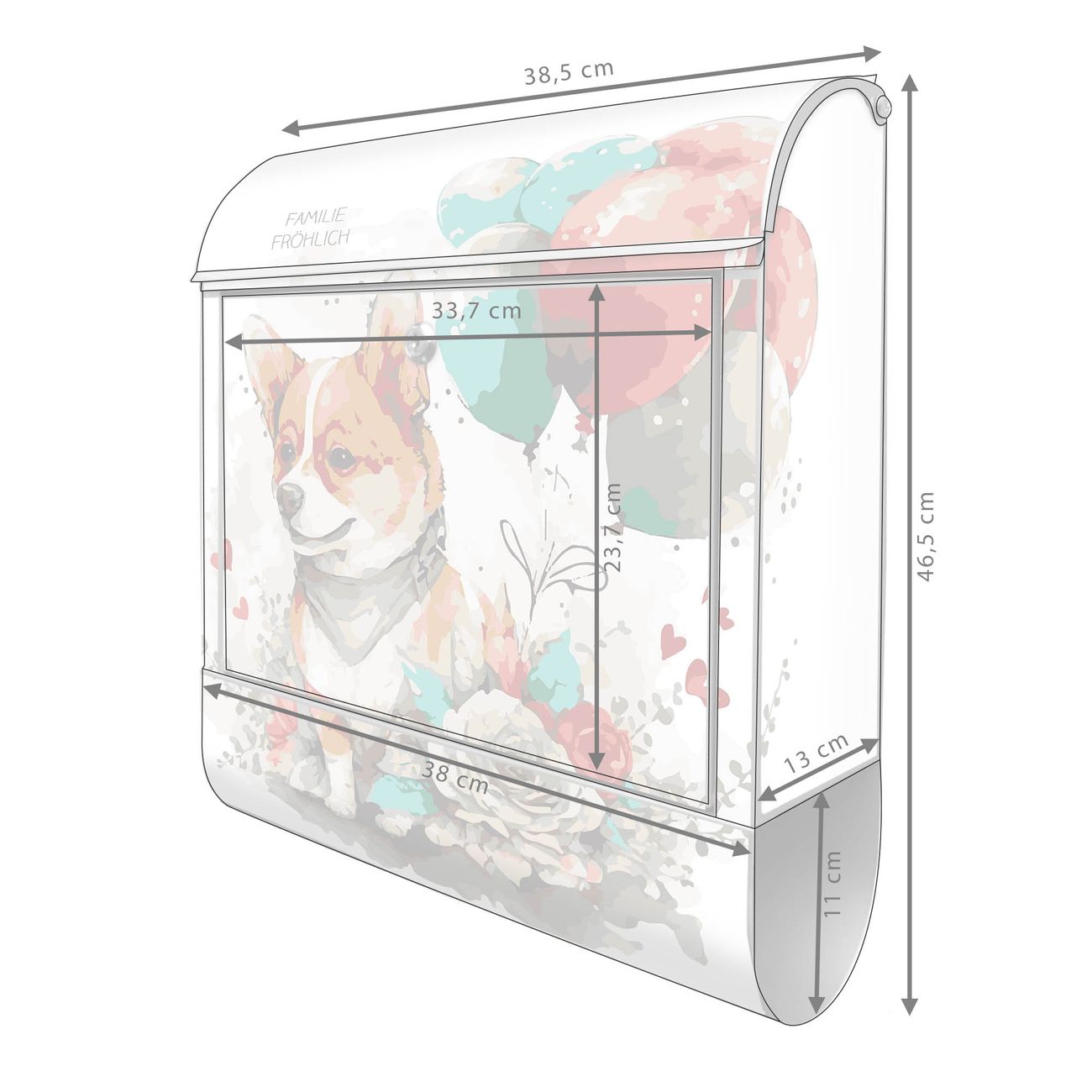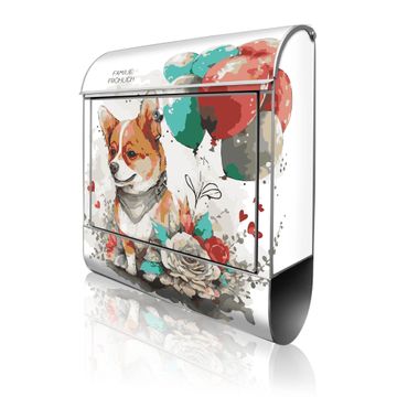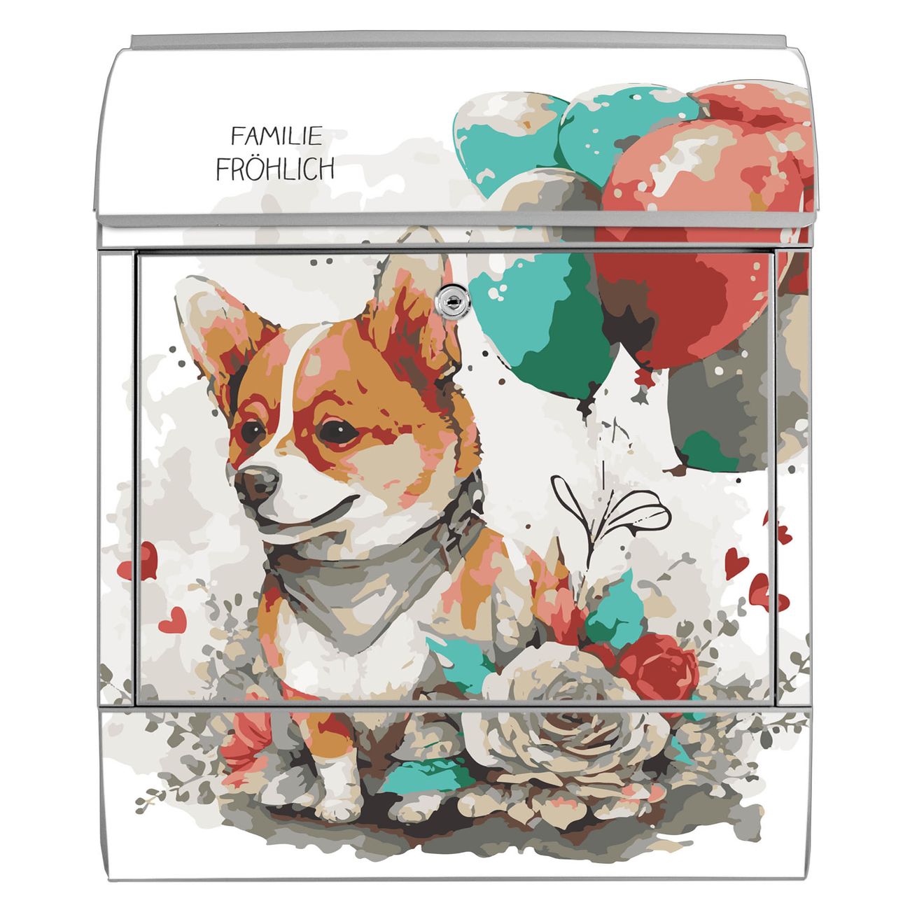 Großer Stahl Briefkasten Motiv Corgi mit Ballons Aquarell