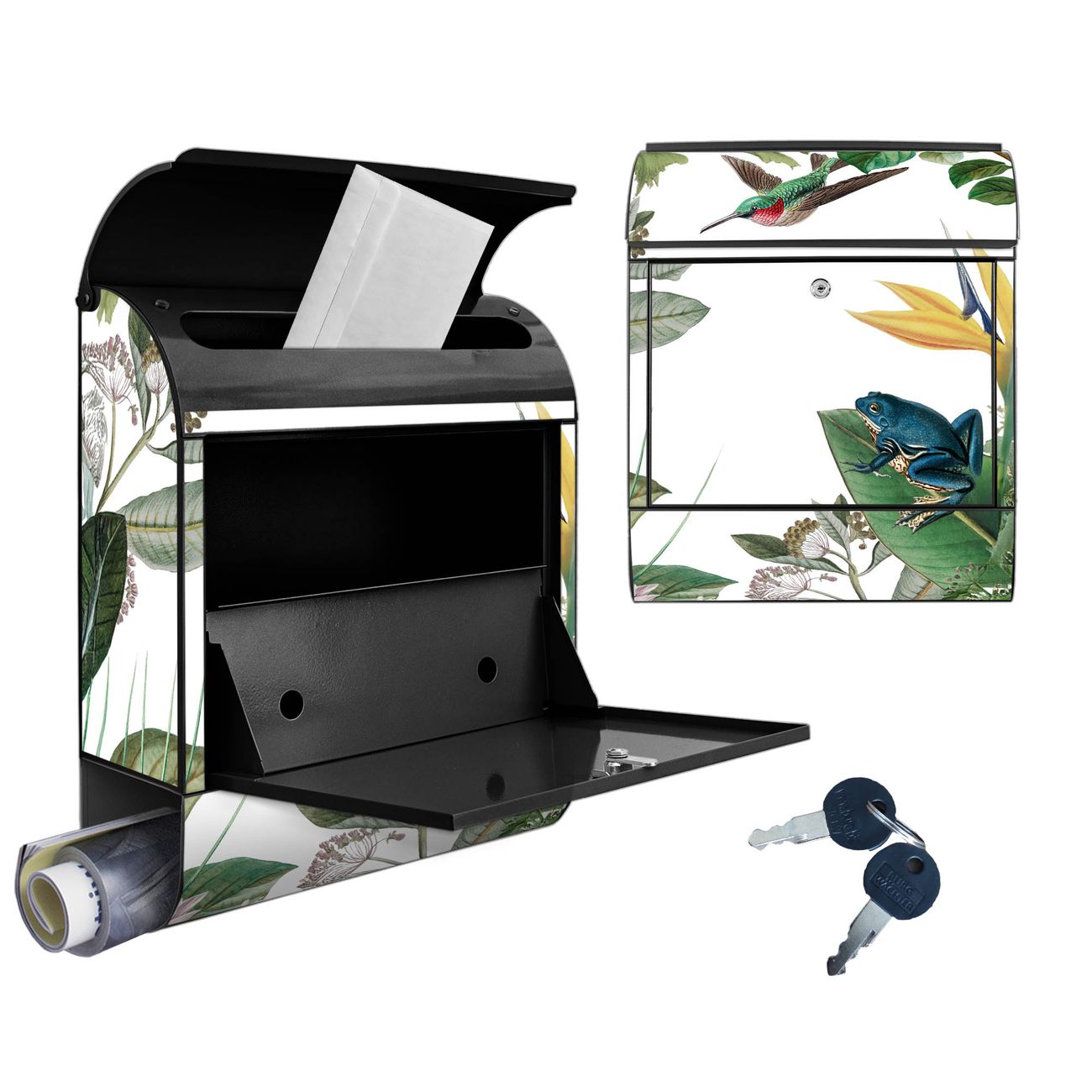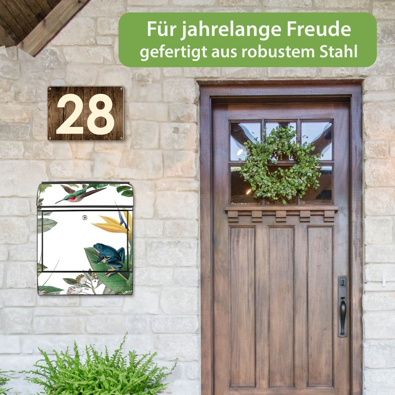DESIGN: Der Postkasten mit Motiv Motiv Exotisches Paradies hat ein sehr ansprechendes und ausgefallenes Design, damit entlocken Sie Ihren Nachbarn und dem Postboten ein Lächeln. Heben Sie Sich von der tristen grauen Masse ab, ohne auf Funktionalität zu verzichten. DETAILS: Der Postkasten besteht aus pulverbeschichtetem Stahl. Er ist 38x46x12,5cm groß. Das Motiv besteht aus einer wetter- und UV-resistenten Folie, die mit einem Schutzlaminat überzogen ist, sodass der Briefkasten zusätzlich vor Kratzern geschützt ist. Der Briefkasten wird mit Montagematerial, zusätzlich zwei Schlüssel sowie einer Bohrschablone geliefert. NUTZEN: Sie können diesen Briefkasten sowohl als Wandbriefkasten montieren oder einen passenden Ständer kaufen und als Standbriefkasten einbetonieren. Die Größe bietet genügend Platz für Sendungen aller Art, der Einwurf fasst auch größere A4 Sendungen. BANJADO: Ihr Briefkasten wird in Sachsen in einer kleinen Manufaktur von Hand veredelt. Die Motivfolie ist lösungsmittelfrei und schutzlaminiert für einen langen Halt. Wir legen großen Wert auf die Verbindung von Funktionalität und Design. Sie erhalten Handarbeit aus Sachsen.