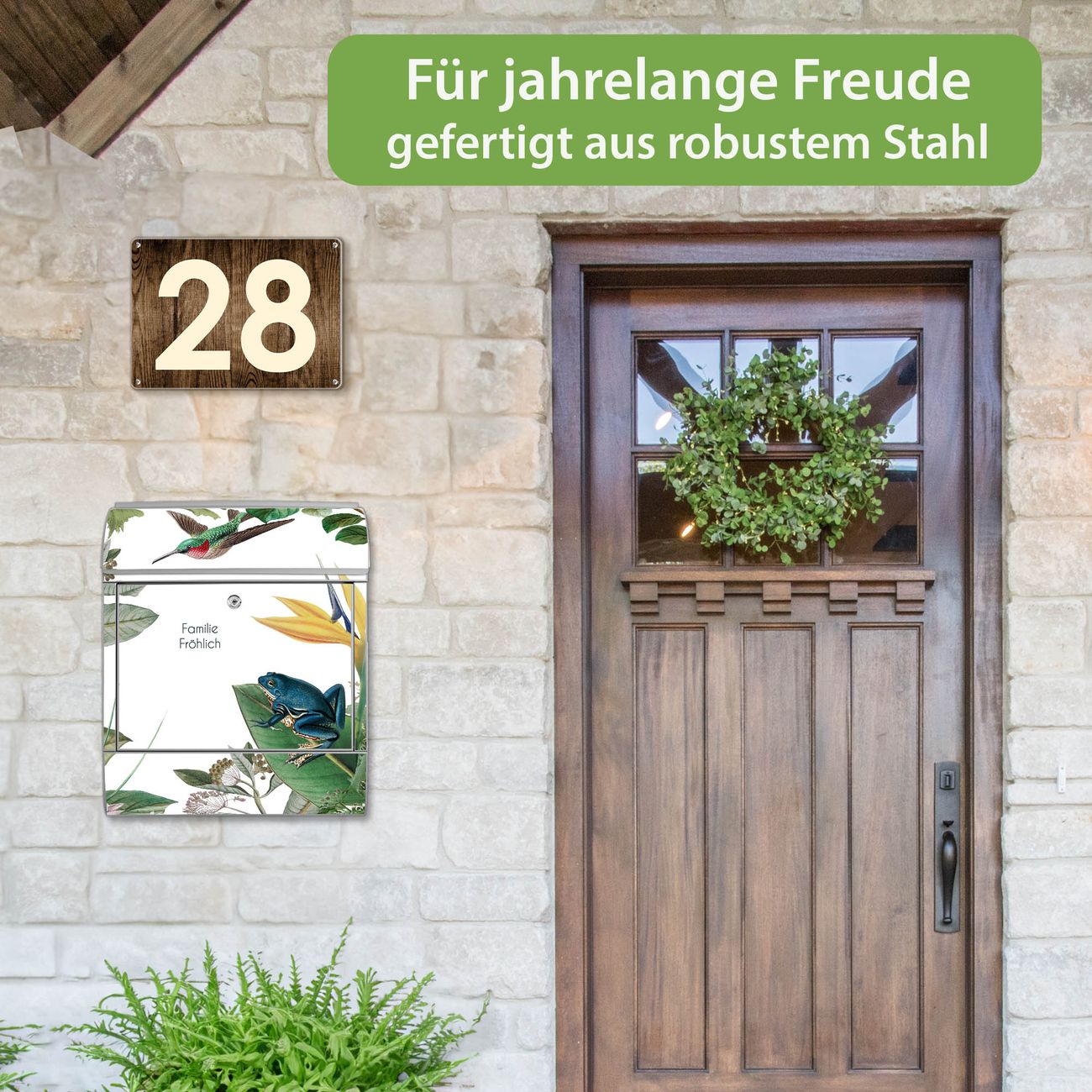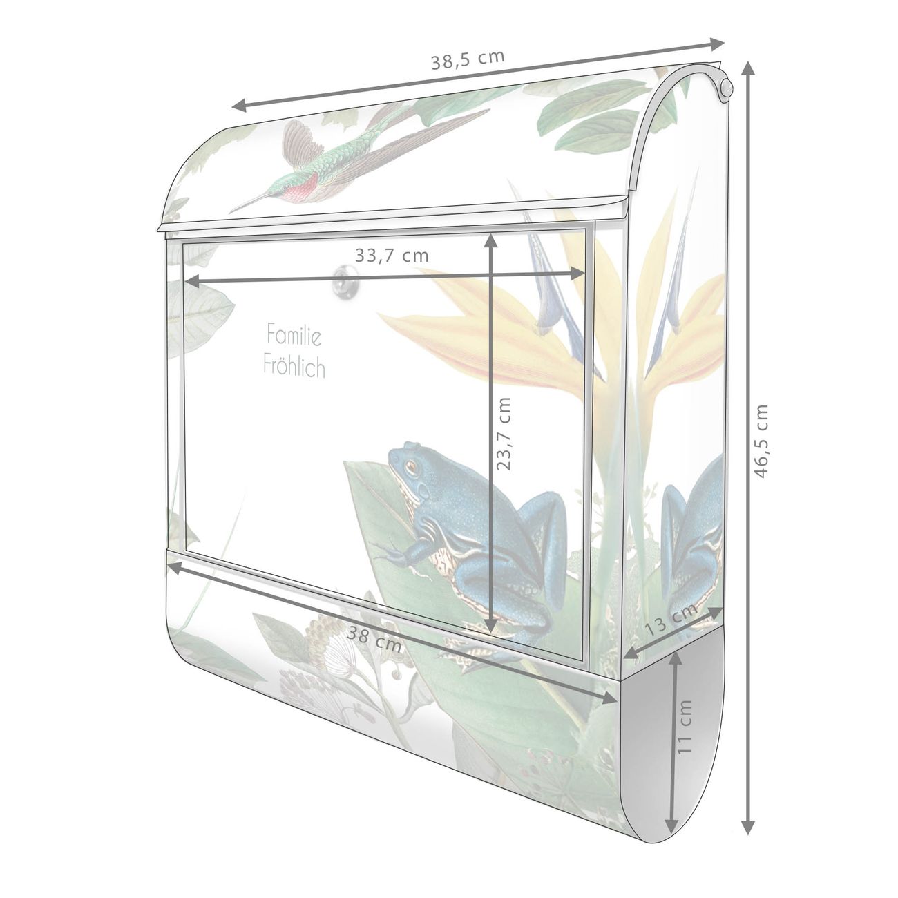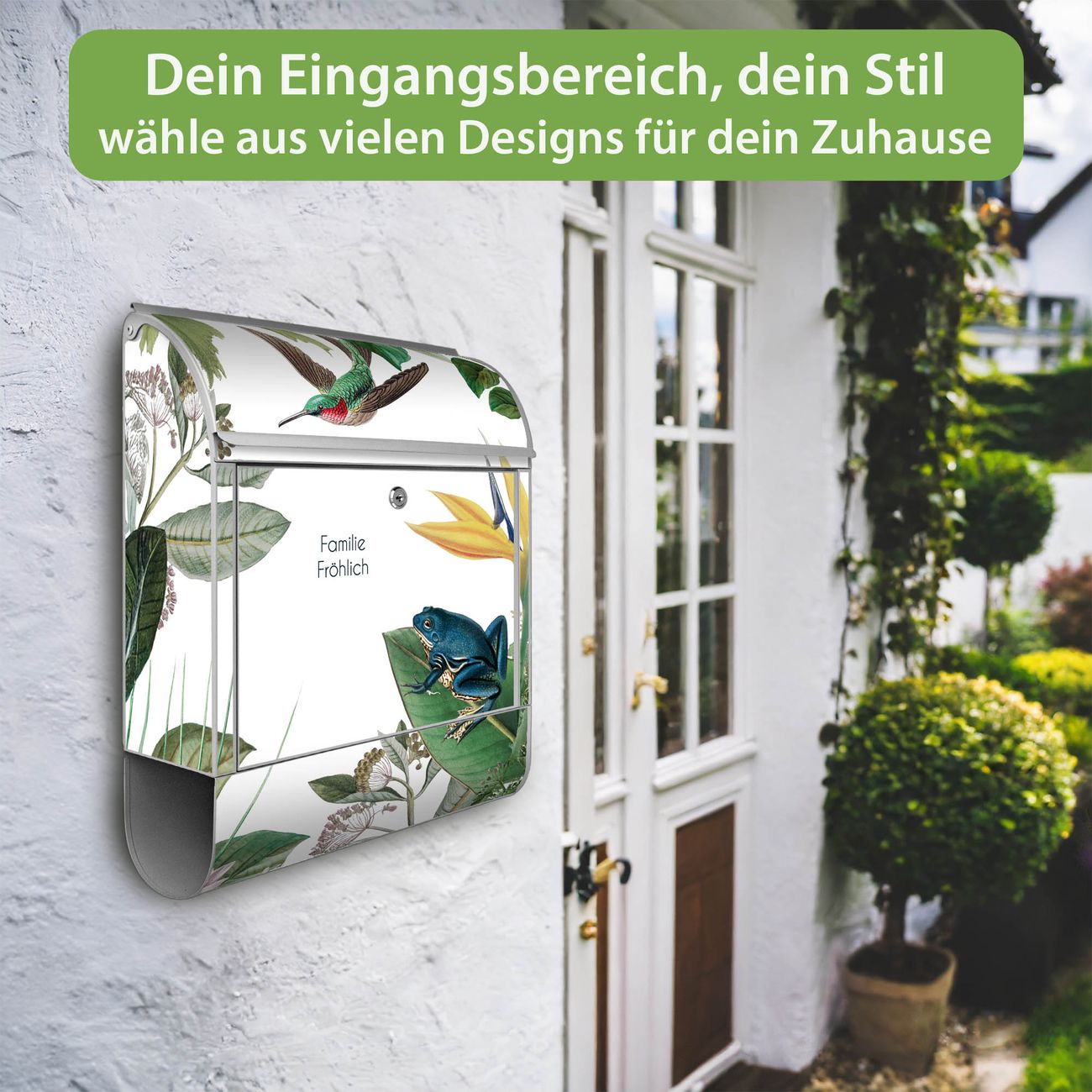 DESIGN: Der Postkasten mit Motiv Motiv Exotisches Paradies hat ein sehr ansprechendes und ausgefallenes Design, damit entlocken Sie Ihren Nachbarn und dem Postboten ein Lächeln. Heben Sie Sich von der tristen grauen Masse ab, ohne auf Funktionalität zu verzichten. DETAILS: Der Postkasten besteht aus pulverbeschichtetem Stahl. Er ist 38x46x12,5cm groß. Das Motiv besteht aus einer wetter- und UV-resistenten Folie, die mit einem Schutzlaminat überzogen ist, sodass der Briefkasten zusätzlich vor Kratzern geschützt ist. Der Briefkasten wird mit Montagematerial, zusätzlich zwei Schlüssel sowie einer Bohrschablone geliefert. NUTZEN: Sie können diesen Briefkasten sowohl als Wandbriefkasten montieren oder einen passenden Ständer kaufen und als Standbriefkasten einbetonieren. Die Größe bietet genügend Platz für Sendungen aller Art, der Einwurf fasst auch größere A4 Sendungen. BANJADO: Ihr Briefkasten wird in Sachsen in einer kleinen Manufaktur von Hand veredelt. Die Motivfolie ist lösungsmittelfrei und schutzlaminiert für einen langen Halt. Wir legen großen Wert auf die Verbindung von Funktionalität und Design. Sie erhalten Handarbeit aus Sachsen.