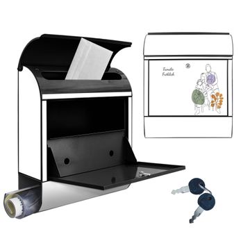 DESIGN: Der Postkasten mit Motiv Motiv Familienglück Lineart hat ein sehr ansprechendes und ausgefallenes Design, damit entlocken Sie Ihren Nachbarn und dem Postboten ein Lächeln. Heben Sie Sich von der tristen grauen Masse ab, ohne auf Funktionalität zu verzichten. DETAILS: Der Postkasten besteht aus pulverbeschichtetem Stahl. Er ist 38x46x12,5cm groß. Das Motiv besteht aus einer wetter- und UV-resistenten Folie, die mit einem Schutzlaminat überzogen ist, sodass der Briefkasten zusätzlich vor Kratzern geschützt ist. Der Briefkasten wird mit Montagematerial, zusätzlich zwei Schlüssel sowie einer Bohrschablone geliefert. NUTZEN: Sie können diesen Briefkasten sowohl als Wandbriefkasten montieren oder einen passenden Ständer kaufen und als Standbriefkasten einbetonieren. Die Größe bietet genügend Platz für Sendungen aller Art, der Einwurf fasst auch größere A4 Sendungen. BANJADO: Ihr Briefkasten wird in Sachsen in einer kleinen Manufaktur von Hand veredelt. Die Motivfolie ist lösungsmittelfrei und schutzlaminiert für einen langen Halt. Wir legen großen Wert auf die Verbindung von Funktionalität und Design. Sie erhalten Handarbeit aus Sachsen.