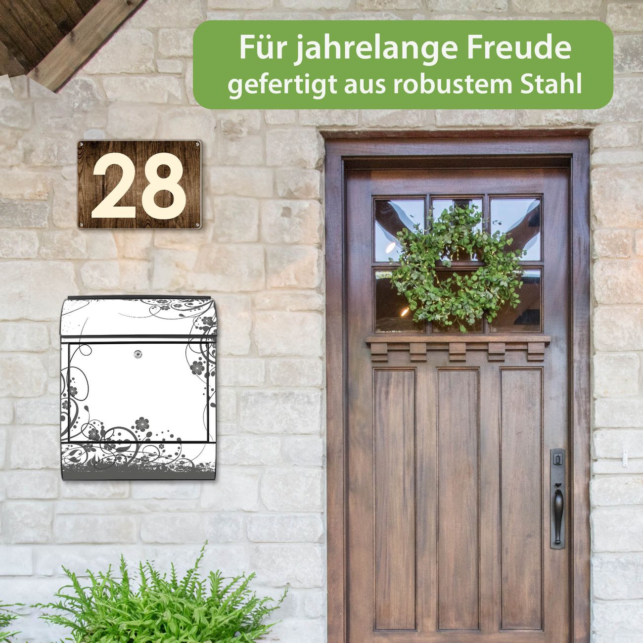 DESIGN: Der Postkasten mit Motiv Motiv Florales Schwarz-Weiß Muster hat ein sehr ansprechendes und ausgefallenes Design, damit entlocken Sie Ihren Nachbarn und dem Postboten ein Lächeln. Heben Sie Sich von der tristen grauen Masse ab, ohne auf Funktionalität zu verzichten. DETAILS: Der Postkasten besteht aus pulverbeschichtetem Stahl. Er ist 38x46x12,5cm groß. Das Motiv besteht aus einer wetter- und UV-resistenten Folie, die mit einem Schutzlaminat überzogen ist, sodass der Briefkasten zusätzlich vor Kratzern geschützt ist. Der Briefkasten wird mit Montagematerial, zusätzlich zwei Schlüssel sowie einer Bohrschablone geliefert. NUTZEN: Sie können diesen Briefkasten sowohl als Wandbriefkasten montieren oder einen passenden Ständer kaufen und als Standbriefkasten einbetonieren. Die Größe bietet genügend Platz für Sendungen aller Art, der Einwurf fasst auch größere A4 Sendungen. BANJADO: Ihr Briefkasten wird in Sachsen in einer kleinen Manufaktur von Hand veredelt. Die Motivfolie ist lösungsmittelfrei und schutzlaminiert für einen langen Halt. Wir legen großen Wert auf die Verbindung von Funktionalität und Design. Sie erhalten Handarbeit aus Sachsen.