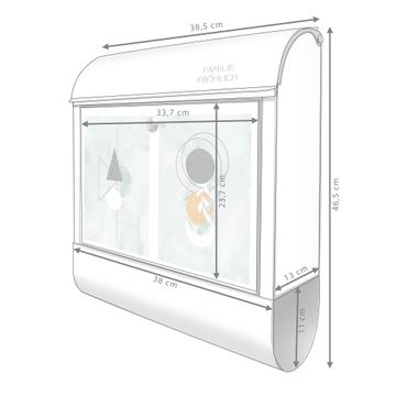 DESIGN: Der Postkasten mit Motiv Motiv Geometrische Komposition hat ein sehr ansprechendes und ausgefallenes Design, damit entlocken Sie Ihren Nachbarn und dem Postboten ein Lächeln. Heben Sie Sich von der tristen grauen Masse ab, ohne auf Funktionalität zu verzichten. DETAILS: Der Postkasten besteht aus pulverbeschichtetem Stahl. Er ist 38x46x12,5cm groß. Das Motiv besteht aus einer wetter- und UV-resistenten Folie, die mit einem Schutzlaminat überzogen ist, sodass der Briefkasten zusätzlich vor Kratzern geschützt ist. Der Briefkasten wird mit Montagematerial, zusätzlich zwei Schlüssel sowie einer Bohrschablone geliefert. NUTZEN: Sie können diesen Briefkasten sowohl als Wandbriefkasten montieren oder einen passenden Ständer kaufen und als Standbriefkasten einbetonieren. Die Größe bietet genügend Platz für Sendungen aller Art, der Einwurf fasst auch größere A4 Sendungen. BANJADO: Ihr Briefkasten wird in Sachsen in einer kleinen Manufaktur von Hand veredelt. Die Motivfolie ist lösungsmittelfrei und schutzlaminiert für einen langen Halt. Wir legen großen Wert auf die Verbindung von Funktionalität und Design. Sie erhalten Handarbeit aus Sachsen.