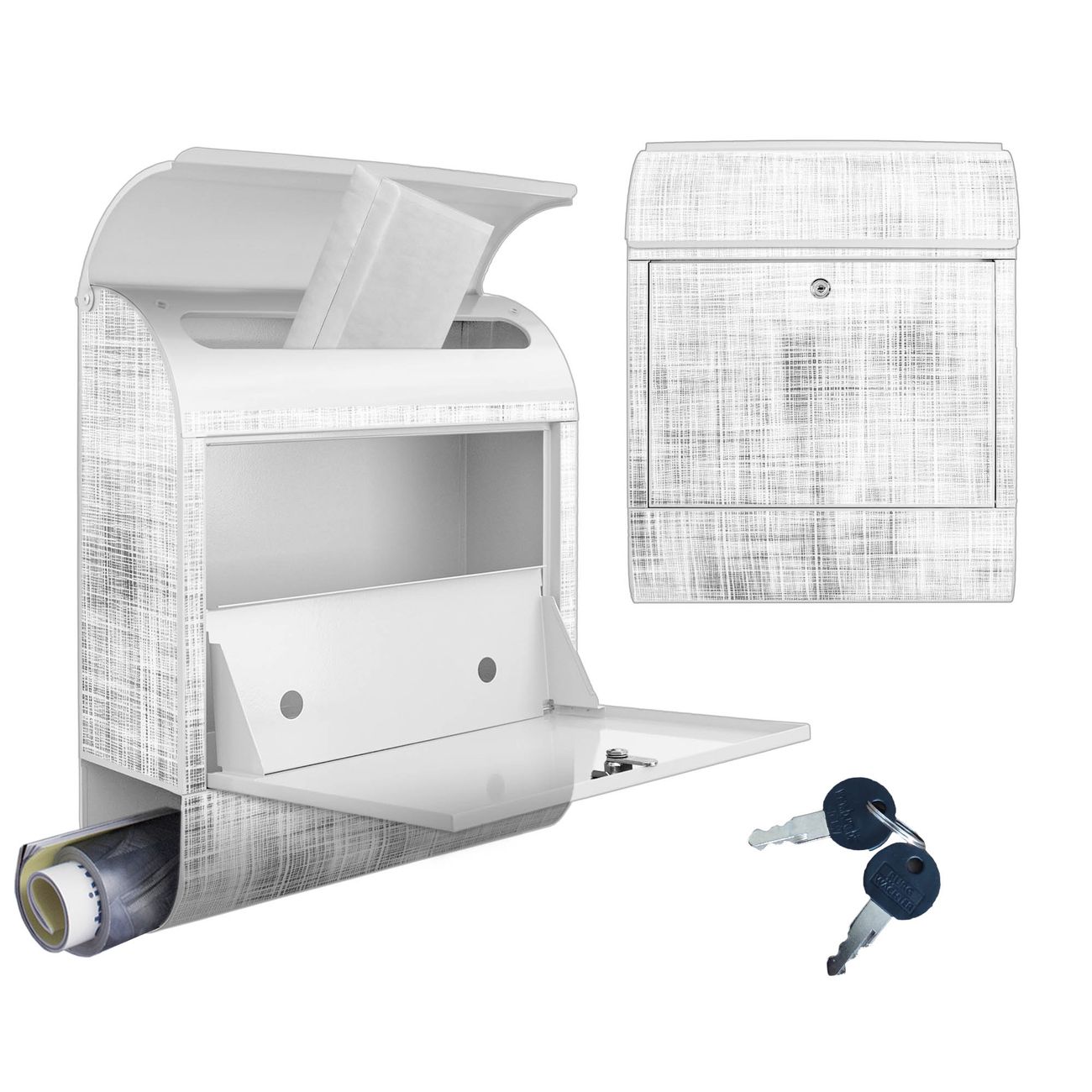 DESIGN: Der Postkasten mit Motiv Motiv Gewebtes Gitter Grau hat ein sehr ansprechendes und ausgefallenes Design, damit entlocken Sie Ihren Nachbarn und dem Postboten ein Lächeln. Heben Sie Sich von der tristen grauen Masse ab, ohne auf Funktionalität zu verzichten. DETAILS: Der Postkasten besteht aus pulverbeschichtetem Stahl. Er ist 38x46x12,5cm groß. Das Motiv besteht aus einer wetter- und UV-resistenten Folie, die mit einem Schutzlaminat überzogen ist, sodass der Briefkasten zusätzlich vor Kratzern geschützt ist. Der Briefkasten wird mit Montagematerial, zusätzlich zwei Schlüssel sowie einer Bohrschablone geliefert. NUTZEN: Sie können diesen Briefkasten sowohl als Wandbriefkasten montieren oder einen passenden Ständer kaufen und als Standbriefkasten einbetonieren. Die Größe bietet genügend Platz für Sendungen aller Art, der Einwurf fasst auch größere A4 Sendungen. BANJADO: Ihr Briefkasten wird in Sachsen in einer kleinen Manufaktur von Hand veredelt. Die Motivfolie ist lösungsmittelfrei und schutzlaminiert für einen langen Halt. Wir legen großen Wert auf die Verbindung von Funktionalität und Design. Sie erhalten Handarbeit aus Sachsen.