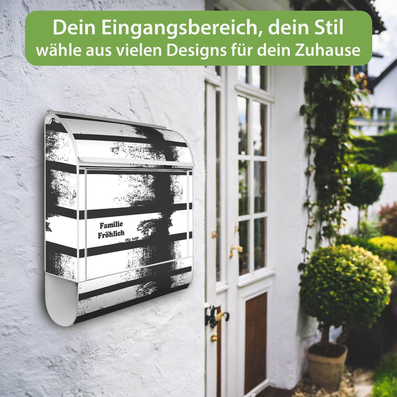 DESIGN: Der Postkasten mit Motiv Motiv Grunge Streifen hat ein sehr ansprechendes und ausgefallenes Design, damit entlocken Sie Ihren Nachbarn und dem Postboten ein Lächeln. Heben Sie Sich von der tristen grauen Masse ab, ohne auf Funktionalität zu verzichten. DETAILS: Der Postkasten besteht aus pulverbeschichtetem Stahl. Er ist 38x46x12,5cm groß. Das Motiv besteht aus einer wetter- und UV-resistenten Folie, die mit einem Schutzlaminat überzogen ist, sodass der Briefkasten zusätzlich vor Kratzern geschützt ist. Der Briefkasten wird mit Montagematerial, zusätzlich zwei Schlüssel sowie einer Bohrschablone geliefert. NUTZEN: Sie können diesen Briefkasten sowohl als Wandbriefkasten montieren oder einen passenden Ständer kaufen und als Standbriefkasten einbetonieren. Die Größe bietet genügend Platz für Sendungen aller Art, der Einwurf fasst auch größere A4 Sendungen. BANJADO: Ihr Briefkasten wird in Sachsen in einer kleinen Manufaktur von Hand veredelt. Die Motivfolie ist lösungsmittelfrei und schutzlaminiert für einen langen Halt. Wir legen großen Wert auf die Verbindung von Funktionalität und Design. Sie erhalten Handarbeit aus Sachsen.