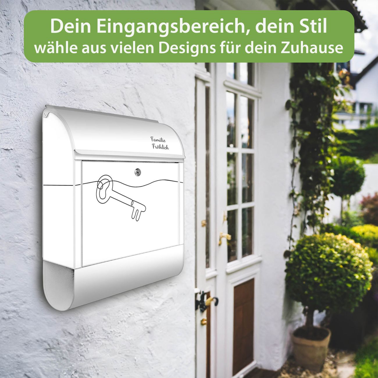 DESIGN: Der Postkasten mit Motiv Motiv Hausherr Schlüssel 2 hat ein sehr ansprechendes und ausgefallenes Design, damit entlocken Sie Ihren Nachbarn und dem Postboten ein Lächeln. Heben Sie Sich von der tristen grauen Masse ab, ohne auf Funktionalität zu verzichten. DETAILS: Der Postkasten besteht aus pulverbeschichtetem Stahl. Er ist 38x46x12,5cm groß. Das Motiv besteht aus einer wetter- und UV-resistenten Folie, die mit einem Schutzlaminat überzogen ist, sodass der Briefkasten zusätzlich vor Kratzern geschützt ist. Der Briefkasten wird mit Montagematerial, zusätzlich zwei Schlüssel sowie einer Bohrschablone geliefert. NUTZEN: Sie können diesen Briefkasten sowohl als Wandbriefkasten montieren oder einen passenden Ständer kaufen und als Standbriefkasten einbetonieren. Die Größe bietet genügend Platz für Sendungen aller Art, der Einwurf fasst auch größere A4 Sendungen. BANJADO: Ihr Briefkasten wird in Sachsen in einer kleinen Manufaktur von Hand veredelt. Die Motivfolie ist lösungsmittelfrei und schutzlaminiert für einen langen Halt. Wir legen großen Wert auf die Verbindung von Funktionalität und Design. Sie erhalten Handarbeit aus Sachsen.