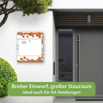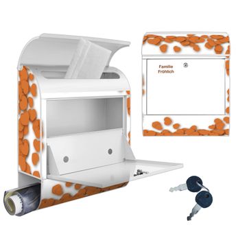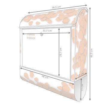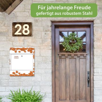 DESIGN: Der Postkasten mit Motiv Motiv Herzrahmen in Orange hat ein sehr ansprechendes und ausgefallenes Design, damit entlocken Sie Ihren Nachbarn und dem Postboten ein Lächeln. Heben Sie Sich von der tristen grauen Masse ab, ohne auf Funktionalität zu verzichten. DETAILS: Der Postkasten besteht aus pulverbeschichtetem Stahl. Er ist 38x46x12,5cm groß. Das Motiv besteht aus einer wetter- und UV-resistenten Folie, die mit einem Schutzlaminat überzogen ist, sodass der Briefkasten zusätzlich vor Kratzern geschützt ist. Der Briefkasten wird mit Montagematerial, zusätzlich zwei Schlüssel sowie einer Bohrschablone geliefert. NUTZEN: Sie können diesen Briefkasten sowohl als Wandbriefkasten montieren oder einen passenden Ständer kaufen und als Standbriefkasten einbetonieren. Die Größe bietet genügend Platz für Sendungen aller Art, der Einwurf fasst auch größere A4 Sendungen. BANJADO: Ihr Briefkasten wird in Sachsen in einer kleinen Manufaktur von Hand veredelt. Die Motivfolie ist lösungsmittelfrei und schutzlaminiert für einen langen Halt. Wir legen großen Wert auf die Verbindung von Funktionalität und Design. Sie erhalten Handarbeit aus Sachsen.
