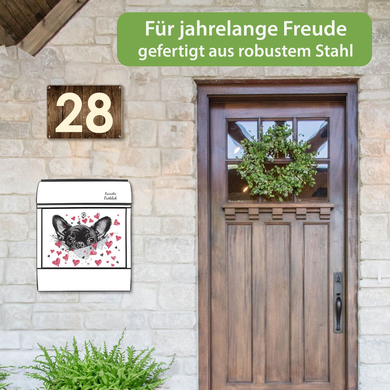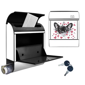DESIGN: Der Postkasten mit Motiv Motiv Hund mit Herzen hat ein sehr ansprechendes und ausgefallenes Design, damit entlocken Sie Ihren Nachbarn und dem Postboten ein Lächeln. Heben Sie Sich von der tristen grauen Masse ab, ohne auf Funktionalität zu verzichten. DETAILS: Der Postkasten besteht aus pulverbeschichtetem Stahl. Er ist 38x46x12,5cm groß. Das Motiv besteht aus einer wetter- und UV-resistenten Folie, die mit einem Schutzlaminat überzogen ist, sodass der Briefkasten zusätzlich vor Kratzern geschützt ist. Der Briefkasten wird mit Montagematerial, zusätzlich zwei Schlüssel sowie einer Bohrschablone geliefert. NUTZEN: Sie können diesen Briefkasten sowohl als Wandbriefkasten montieren oder einen passenden Ständer kaufen und als Standbriefkasten einbetonieren. Die Größe bietet genügend Platz für Sendungen aller Art, der Einwurf fasst auch größere A4 Sendungen. BANJADO: Ihr Briefkasten wird in Sachsen in einer kleinen Manufaktur von Hand veredelt. Die Motivfolie ist lösungsmittelfrei und schutzlaminiert für einen langen Halt. Wir legen großen Wert auf die Verbindung von Funktionalität und Design. Sie erhalten Handarbeit aus Sachsen.