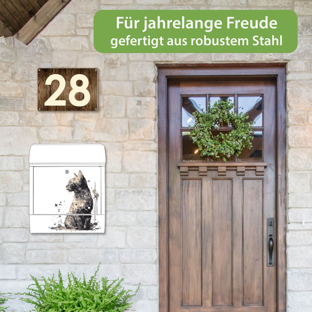 DESIGN: Der Postkasten mit Motiv Motiv Katzenportrait in Aquarell 4 hat ein sehr ansprechendes und ausgefallenes Design, damit entlocken Sie Ihren Nachbarn und dem Postboten ein Lächeln. Heben Sie Sich von der tristen grauen Masse ab, ohne auf Funktionalität zu verzichten. DETAILS: Der Postkasten besteht aus pulverbeschichtetem Stahl. Er ist 38x46x12,5cm groß. Das Motiv besteht aus einer wetter- und UV-resistenten Folie, die mit einem Schutzlaminat überzogen ist, sodass der Briefkasten zusätzlich vor Kratzern geschützt ist. Der Briefkasten wird mit Montagematerial, zusätzlich zwei Schlüssel sowie einer Bohrschablone geliefert. NUTZEN: Sie können diesen Briefkasten sowohl als Wandbriefkasten montieren oder einen passenden Ständer kaufen und als Standbriefkasten einbetonieren. Die Größe bietet genügend Platz für Sendungen aller Art, der Einwurf fasst auch größere A4 Sendungen. BANJADO: Ihr Briefkasten wird in Sachsen in einer kleinen Manufaktur von Hand veredelt. Die Motivfolie ist lösungsmittelfrei und schutzlaminiert für einen langen Halt. Wir legen großen Wert auf die Verbindung von Funktionalität und Design. Sie erhalten Handarbeit aus Sachsen.