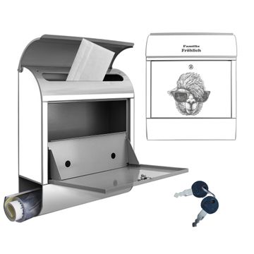 DESIGN: Der Postkasten mit Motiv Motiv Lama 2 hat ein sehr ansprechendes und ausgefallenes Design, damit entlocken Sie Ihren Nachbarn und dem Postboten ein Lächeln. Heben Sie Sich von der tristen grauen Masse ab, ohne auf Funktionalität zu verzichten. DETAILS: Der Postkasten besteht aus pulverbeschichtetem Stahl. Er ist 38x46x12,5cm groß. Das Motiv besteht aus einer wetter- und UV-resistenten Folie, die mit einem Schutzlaminat überzogen ist, sodass der Briefkasten zusätzlich vor Kratzern geschützt ist. Der Briefkasten wird mit Montagematerial, zusätzlich zwei Schlüssel sowie einer Bohrschablone geliefert. NUTZEN: Sie können diesen Briefkasten sowohl als Wandbriefkasten montieren oder einen passenden Ständer kaufen und als Standbriefkasten einbetonieren. Die Größe bietet genügend Platz für Sendungen aller Art, der Einwurf fasst auch größere A4 Sendungen. BANJADO: Ihr Briefkasten wird in Sachsen in einer kleinen Manufaktur von Hand veredelt. Die Motivfolie ist lösungsmittelfrei und schutzlaminiert für einen langen Halt. Wir legen großen Wert auf die Verbindung von Funktionalität und Design. Sie erhalten Handarbeit aus Sachsen.