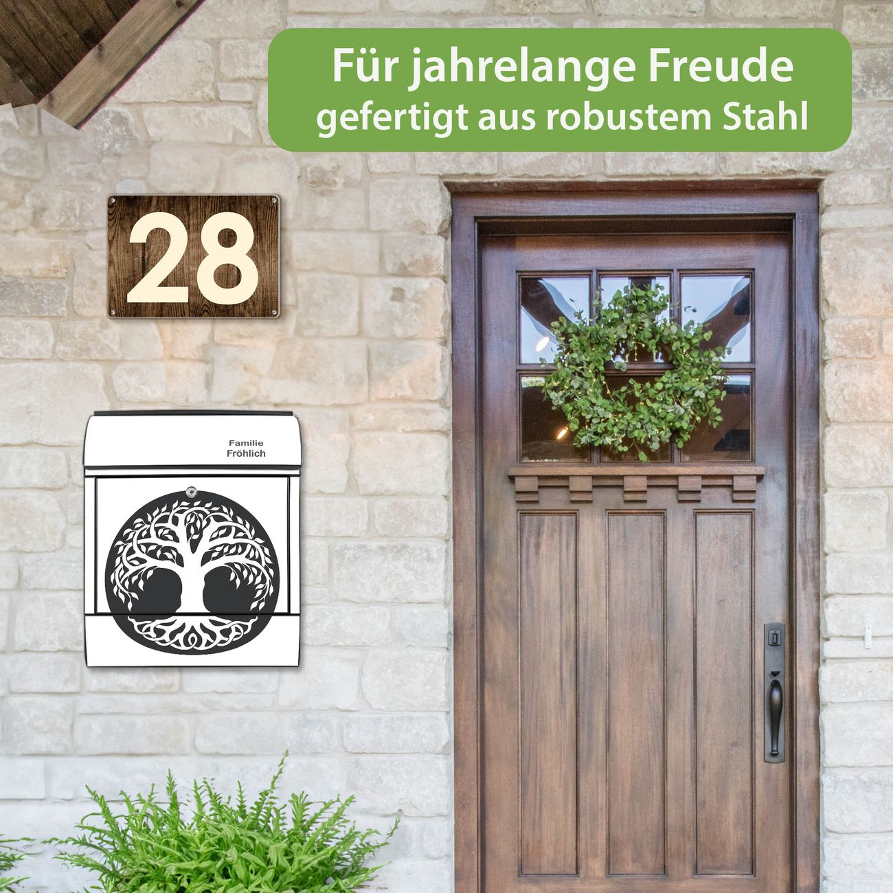 DESIGN: Der Postkasten mit Motiv Motiv Lebensbaum Silhouette hat ein sehr ansprechendes und ausgefallenes Design, damit entlocken Sie Ihren Nachbarn und dem Postboten ein Lächeln. Heben Sie Sich von der tristen grauen Masse ab, ohne auf Funktionalität zu verzichten. DETAILS: Der Postkasten besteht aus pulverbeschichtetem Stahl. Er ist 38x46x12,5cm groß. Das Motiv besteht aus einer wetter- und UV-resistenten Folie, die mit einem Schutzlaminat überzogen ist, sodass der Briefkasten zusätzlich vor Kratzern geschützt ist. Der Briefkasten wird mit Montagematerial, zusätzlich zwei Schlüssel sowie einer Bohrschablone geliefert. NUTZEN: Sie können diesen Briefkasten sowohl als Wandbriefkasten montieren oder einen passenden Ständer kaufen und als Standbriefkasten einbetonieren. Die Größe bietet genügend Platz für Sendungen aller Art, der Einwurf fasst auch größere A4 Sendungen. BANJADO: Ihr Briefkasten wird in Sachsen in einer kleinen Manufaktur von Hand veredelt. Die Motivfolie ist lösungsmittelfrei und schutzlaminiert für einen langen Halt. Wir legen großen Wert auf die Verbindung von Funktionalität und Design. Sie erhalten Handarbeit aus Sachsen.