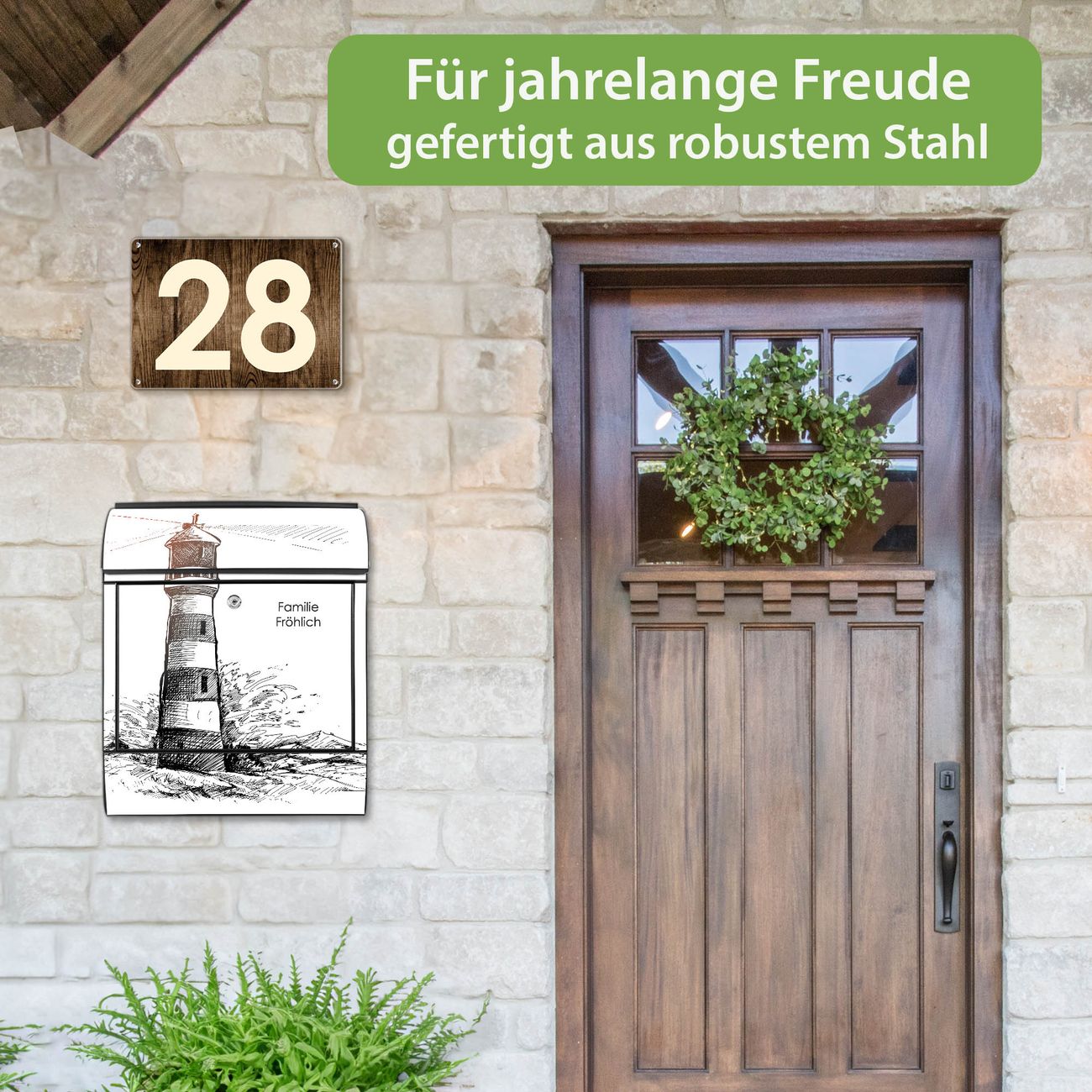 DESIGN: Der Postkasten mit Motiv Motiv Leuchtturm in der Brandung hat ein sehr ansprechendes und ausgefallenes Design, damit entlocken Sie Ihren Nachbarn und dem Postboten ein Lächeln. Heben Sie Sich von der tristen grauen Masse ab, ohne auf Funktionalität zu verzichten. DETAILS: Der Postkasten besteht aus pulverbeschichtetem Stahl. Er ist 38x46x12,5cm groß. Das Motiv besteht aus einer wetter- und UV-resistenten Folie, die mit einem Schutzlaminat überzogen ist, sodass der Briefkasten zusätzlich vor Kratzern geschützt ist. Der Briefkasten wird mit Montagematerial, zusätzlich zwei Schlüssel sowie einer Bohrschablone geliefert. NUTZEN: Sie können diesen Briefkasten sowohl als Wandbriefkasten montieren oder einen passenden Ständer kaufen und als Standbriefkasten einbetonieren. Die Größe bietet genügend Platz für Sendungen aller Art, der Einwurf fasst auch größere A4 Sendungen. BANJADO: Ihr Briefkasten wird in Sachsen in einer kleinen Manufaktur von Hand veredelt. Die Motivfolie ist lösungsmittelfrei und schutzlaminiert für einen langen Halt. Wir legen großen Wert auf die Verbindung von Funktionalität und Design. Sie erhalten Handarbeit aus Sachsen.