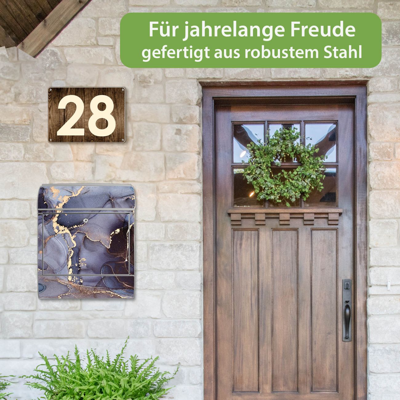 DESIGN: Der Postkasten mit Motiv Motiv Lila Marmor mit Gold 1 hat ein sehr ansprechendes und ausgefallenes Design, damit entlocken Sie Ihren Nachbarn und dem Postboten ein Lächeln. Heben Sie Sich von der tristen grauen Masse ab, ohne auf Funktionalität zu verzichten. DETAILS: Der Postkasten besteht aus pulverbeschichtetem Stahl. Er ist 38x46x12,5cm groß. Das Motiv besteht aus einer wetter- und UV-resistenten Folie, die mit einem Schutzlaminat überzogen ist, sodass der Briefkasten zusätzlich vor Kratzern geschützt ist. Der Briefkasten wird mit Montagematerial, zusätzlich zwei Schlüssel sowie einer Bohrschablone geliefert. NUTZEN: Sie können diesen Briefkasten sowohl als Wandbriefkasten montieren oder einen passenden Ständer kaufen und als Standbriefkasten einbetonieren. Die Größe bietet genügend Platz für Sendungen aller Art, der Einwurf fasst auch größere A4 Sendungen. BANJADO: Ihr Briefkasten wird in Sachsen in einer kleinen Manufaktur von Hand veredelt. Die Motivfolie ist lösungsmittelfrei und schutzlaminiert für einen langen Halt. Wir legen großen Wert auf die Verbindung von Funktionalität und Design. Sie erhalten Handarbeit aus Sachsen.