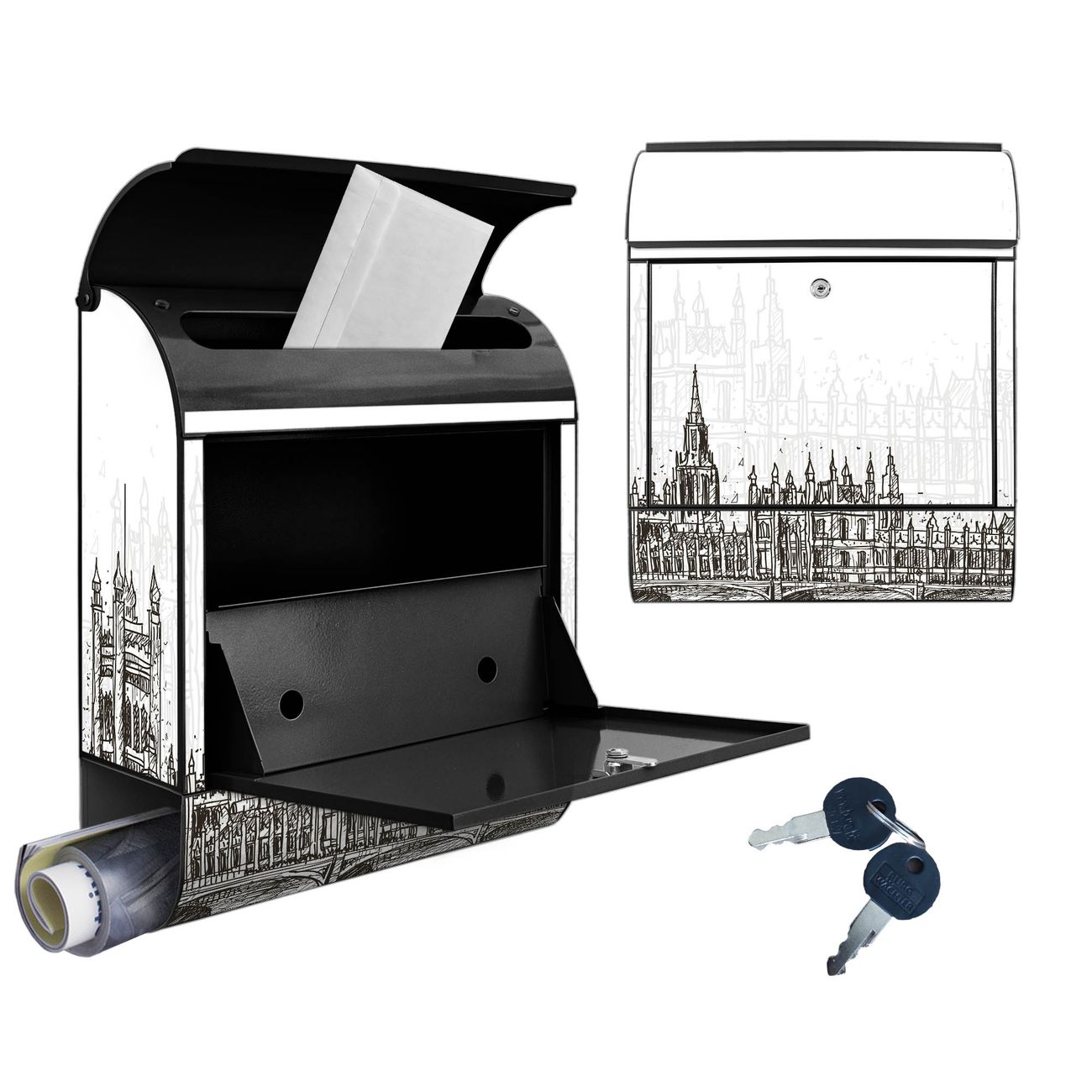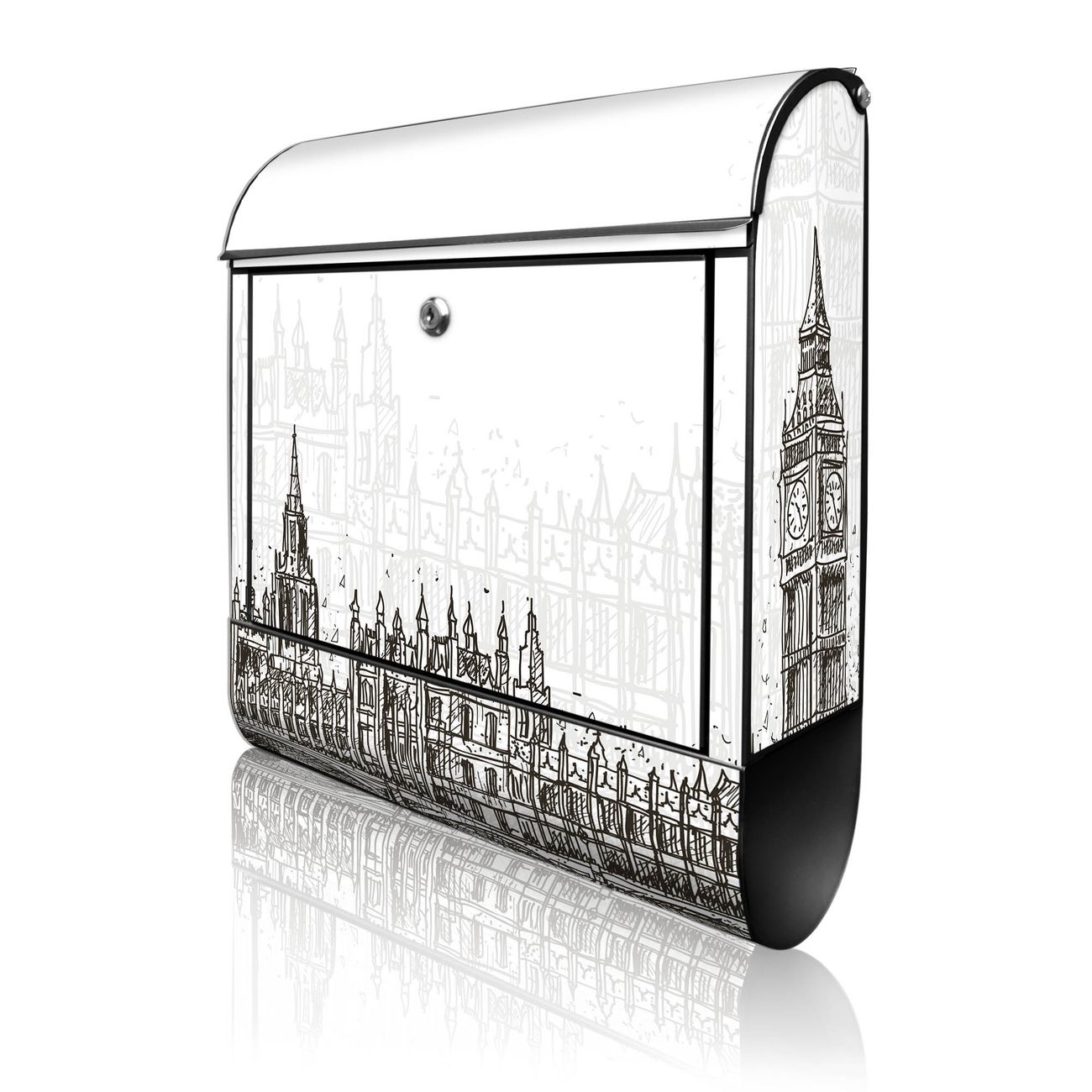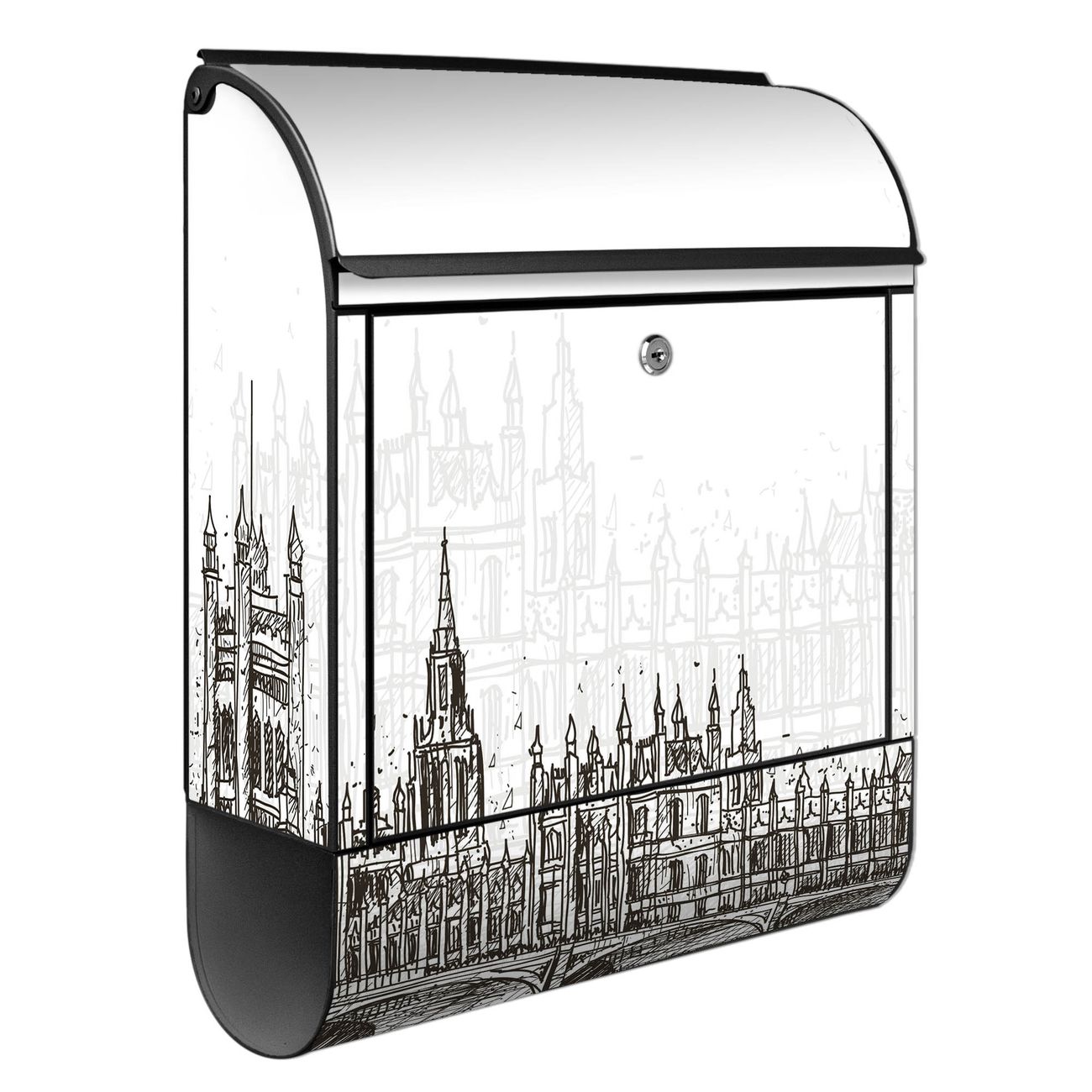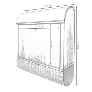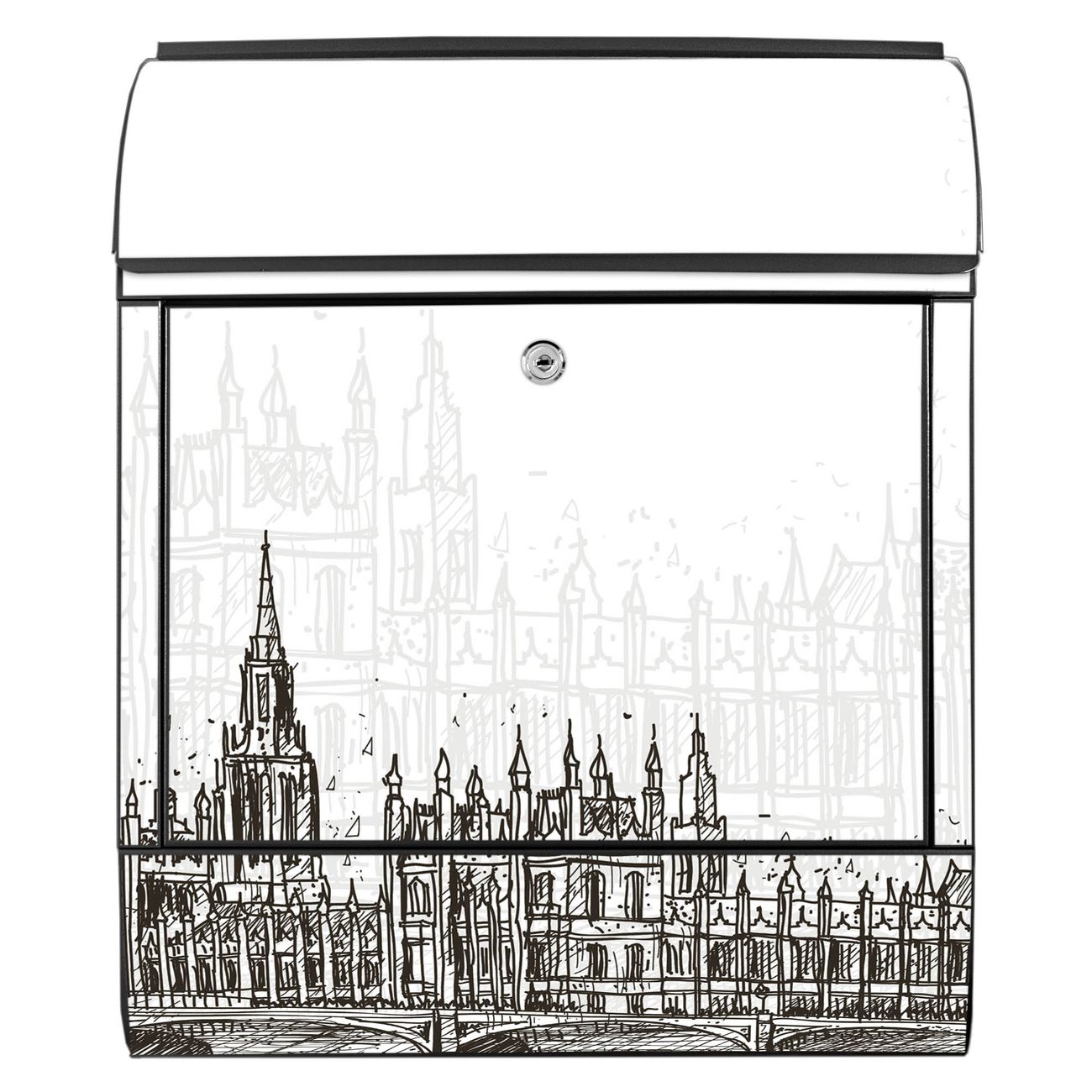 Großer Stahl Briefkasten Motiv London Skyline Skizze