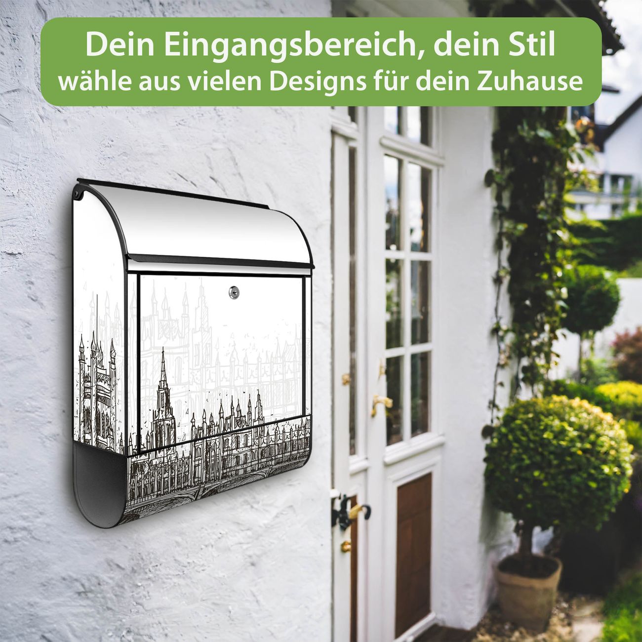 DESIGN: Der Postkasten mit Motiv Motiv London Skyline Skizze hat ein sehr ansprechendes und ausgefallenes Design, damit entlocken Sie Ihren Nachbarn und dem Postboten ein Lächeln. Heben Sie Sich von der tristen grauen Masse ab, ohne auf Funktionalität zu verzichten. DETAILS: Der Postkasten besteht aus pulverbeschichtetem Stahl. Er ist 38x46x12,5cm groß. Das Motiv besteht aus einer wetter- und UV-resistenten Folie, die mit einem Schutzlaminat überzogen ist, sodass der Briefkasten zusätzlich vor Kratzern geschützt ist. Der Briefkasten wird mit Montagematerial, zusätzlich zwei Schlüssel sowie einer Bohrschablone geliefert. NUTZEN: Sie können diesen Briefkasten sowohl als Wandbriefkasten montieren oder einen passenden Ständer kaufen und als Standbriefkasten einbetonieren. Die Größe bietet genügend Platz für Sendungen aller Art, der Einwurf fasst auch größere A4 Sendungen. BANJADO: Ihr Briefkasten wird in Sachsen in einer kleinen Manufaktur von Hand veredelt. Die Motivfolie ist lösungsmittelfrei und schutzlaminiert für einen langen Halt. Wir legen großen Wert auf die Verbindung von Funktionalität und Design. Sie erhalten Handarbeit aus Sachsen.
