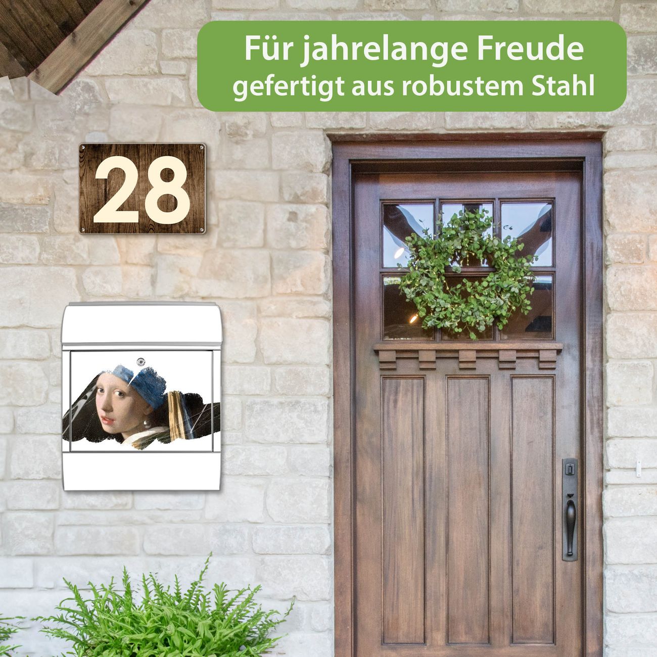 DESIGN: Der Postkasten mit Motiv Motiv Mädchen mit dem Perlenohrring hat ein sehr ansprechendes und ausgefallenes Design, damit entlocken Sie Ihren Nachbarn und dem Postboten ein Lächeln. Heben Sie Sich von der tristen grauen Masse ab, ohne auf Funktionalität zu verzichten. DETAILS: Der Postkasten besteht aus pulverbeschichtetem Stahl. Er ist 38x46x12,5cm groß. Das Motiv besteht aus einer wetter- und UV-resistenten Folie, die mit einem Schutzlaminat überzogen ist, sodass der Briefkasten zusätzlich vor Kratzern geschützt ist. Der Briefkasten wird mit Montagematerial, zusätzlich zwei Schlüssel sowie einer Bohrschablone geliefert. NUTZEN: Sie können diesen Briefkasten sowohl als Wandbriefkasten montieren oder einen passenden Ständer kaufen und als Standbriefkasten einbetonieren. Die Größe bietet genügend Platz für Sendungen aller Art, der Einwurf fasst auch größere A4 Sendungen. BANJADO: Ihr Briefkasten wird in Sachsen in einer kleinen Manufaktur von Hand veredelt. Die Motivfolie ist lösungsmittelfrei und schutzlaminiert für einen langen Halt. Wir legen großen Wert auf die Verbindung von Funktionalität und Design. Sie erhalten Handarbeit aus Sachsen.