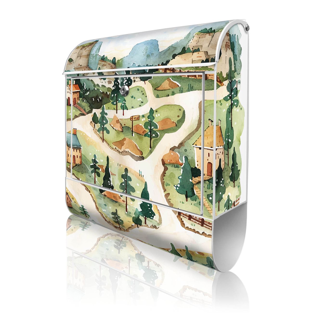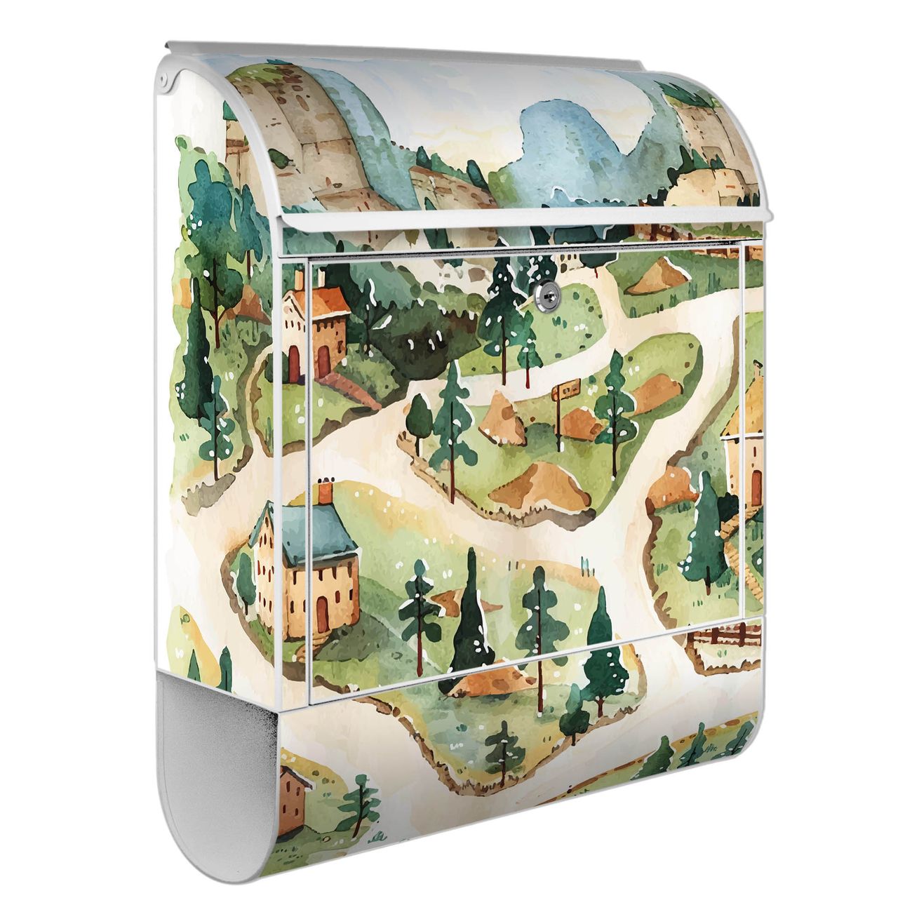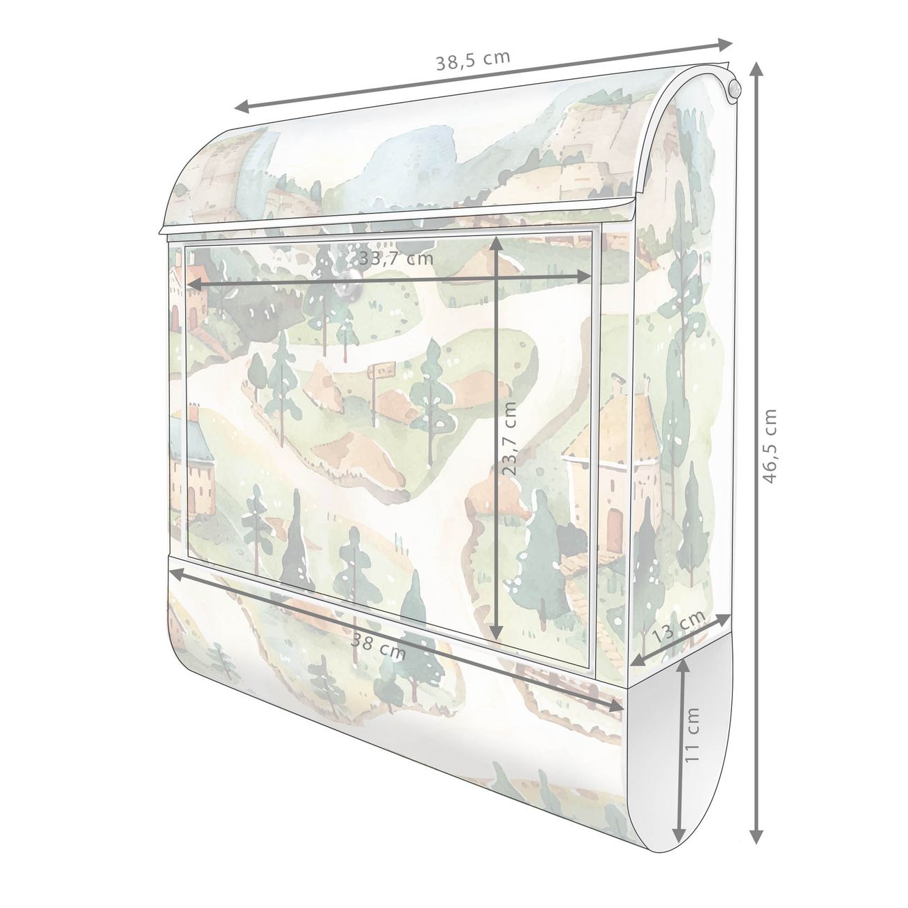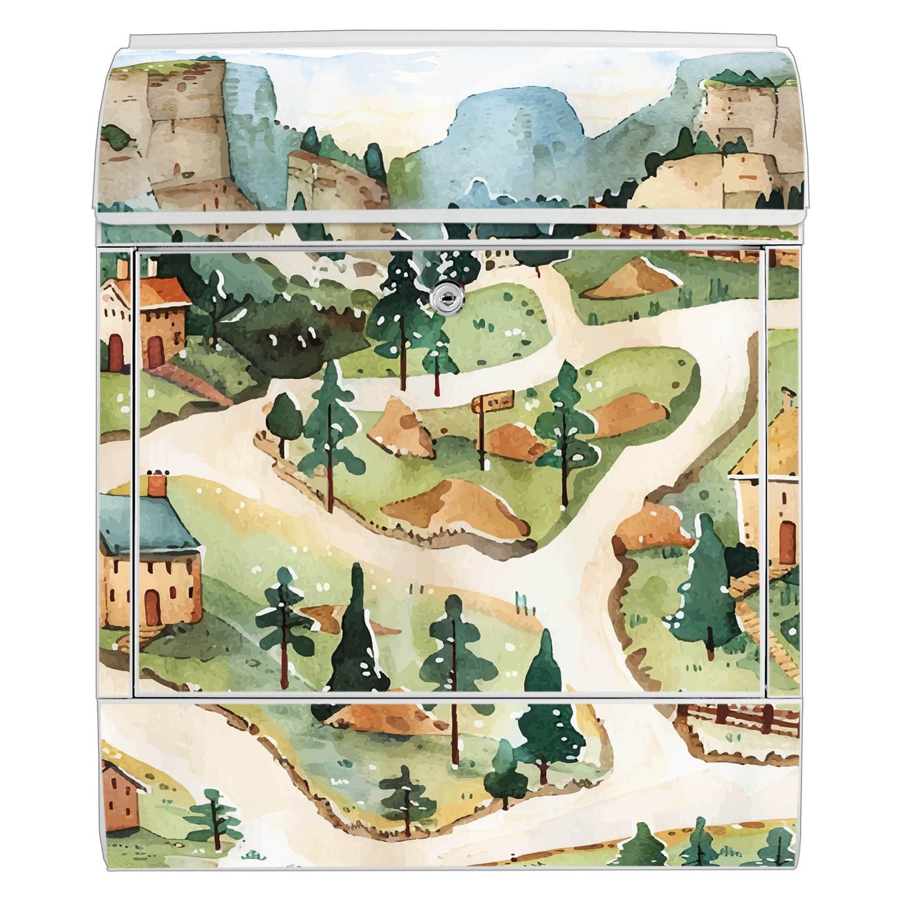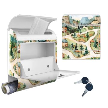 DESIGN: Der Postkasten mit Motiv Motiv Märchendorf 3 hat ein sehr ansprechendes und ausgefallenes Design, damit entlocken Sie Ihren Nachbarn und dem Postboten ein Lächeln. Heben Sie Sich von der tristen grauen Masse ab, ohne auf Funktionalität zu verzichten. DETAILS: Der Postkasten besteht aus pulverbeschichtetem Stahl. Er ist 38x46x12,5cm groß. Das Motiv besteht aus einer wetter- und UV-resistenten Folie, die mit einem Schutzlaminat überzogen ist, sodass der Briefkasten zusätzlich vor Kratzern geschützt ist. Der Briefkasten wird mit Montagematerial, zusätzlich zwei Schlüssel sowie einer Bohrschablone geliefert. NUTZEN: Sie können diesen Briefkasten sowohl als Wandbriefkasten montieren oder einen passenden Ständer kaufen und als Standbriefkasten einbetonieren. Die Größe bietet genügend Platz für Sendungen aller Art, der Einwurf fasst auch größere A4 Sendungen. BANJADO: Ihr Briefkasten wird in Sachsen in einer kleinen Manufaktur von Hand veredelt. Die Motivfolie ist lösungsmittelfrei und schutzlaminiert für einen langen Halt. Wir legen großen Wert auf die Verbindung von Funktionalität und Design. Sie erhalten Handarbeit aus Sachsen.