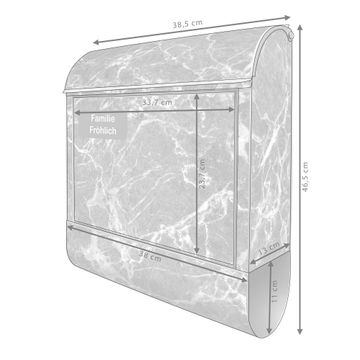 DESIGN: Der Postkasten mit Motiv Motiv Marmorstein hat ein sehr ansprechendes und ausgefallenes Design, damit entlocken Sie Ihren Nachbarn und dem Postboten ein Lächeln. Heben Sie Sich von der tristen grauen Masse ab, ohne auf Funktionalität zu verzichten. DETAILS: Der Postkasten besteht aus pulverbeschichtetem Stahl. Er ist 38x46x12,5cm groß. Das Motiv besteht aus einer wetter- und UV-resistenten Folie, die mit einem Schutzlaminat überzogen ist, sodass der Briefkasten zusätzlich vor Kratzern geschützt ist. Der Briefkasten wird mit Montagematerial, zusätzlich zwei Schlüssel sowie einer Bohrschablone geliefert. NUTZEN: Sie können diesen Briefkasten sowohl als Wandbriefkasten montieren oder einen passenden Ständer kaufen und als Standbriefkasten einbetonieren. Die Größe bietet genügend Platz für Sendungen aller Art, der Einwurf fasst auch größere A4 Sendungen. BANJADO: Ihr Briefkasten wird in Sachsen in einer kleinen Manufaktur von Hand veredelt. Die Motivfolie ist lösungsmittelfrei und schutzlaminiert für einen langen Halt. Wir legen großen Wert auf die Verbindung von Funktionalität und Design. Sie erhalten Handarbeit aus Sachsen.