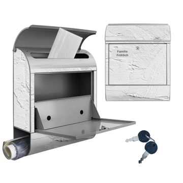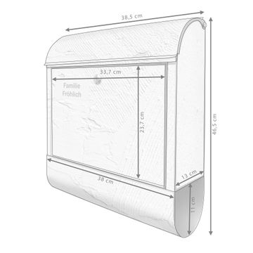 DESIGN: Der Postkasten mit Motiv Motiv Minimalistische Struktur Grau hat ein sehr ansprechendes und ausgefallenes Design, damit entlocken Sie Ihren Nachbarn und dem Postboten ein Lächeln. Heben Sie Sich von der tristen grauen Masse ab, ohne auf Funktionalität zu verzichten. DETAILS: Der Postkasten besteht aus pulverbeschichtetem Stahl. Er ist 38x46x12,5cm groß. Das Motiv besteht aus einer wetter- und UV-resistenten Folie, die mit einem Schutzlaminat überzogen ist, sodass der Briefkasten zusätzlich vor Kratzern geschützt ist. Der Briefkasten wird mit Montagematerial, zusätzlich zwei Schlüssel sowie einer Bohrschablone geliefert. NUTZEN: Sie können diesen Briefkasten sowohl als Wandbriefkasten montieren oder einen passenden Ständer kaufen und als Standbriefkasten einbetonieren. Die Größe bietet genügend Platz für Sendungen aller Art, der Einwurf fasst auch größere A4 Sendungen. BANJADO: Ihr Briefkasten wird in Sachsen in einer kleinen Manufaktur von Hand veredelt. Die Motivfolie ist lösungsmittelfrei und schutzlaminiert für einen langen Halt. Wir legen großen Wert auf die Verbindung von Funktionalität und Design. Sie erhalten Handarbeit aus Sachsen.