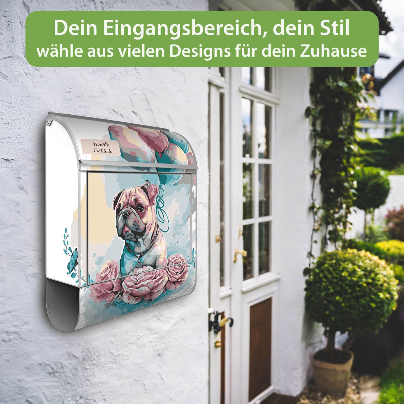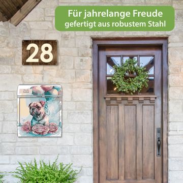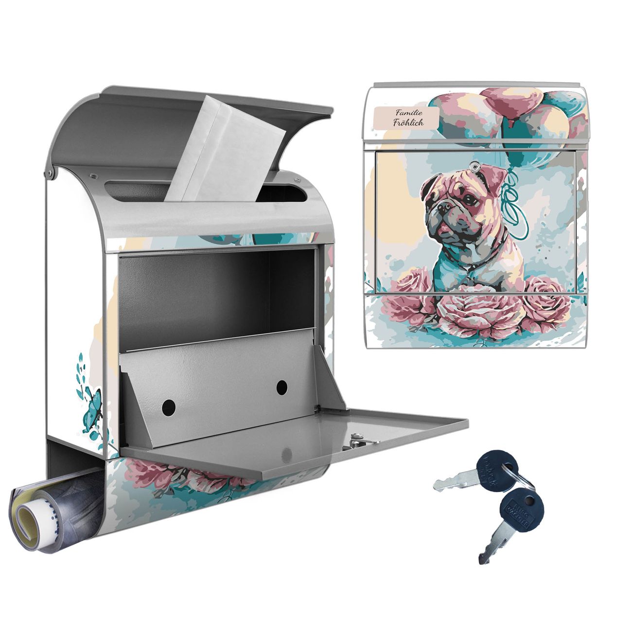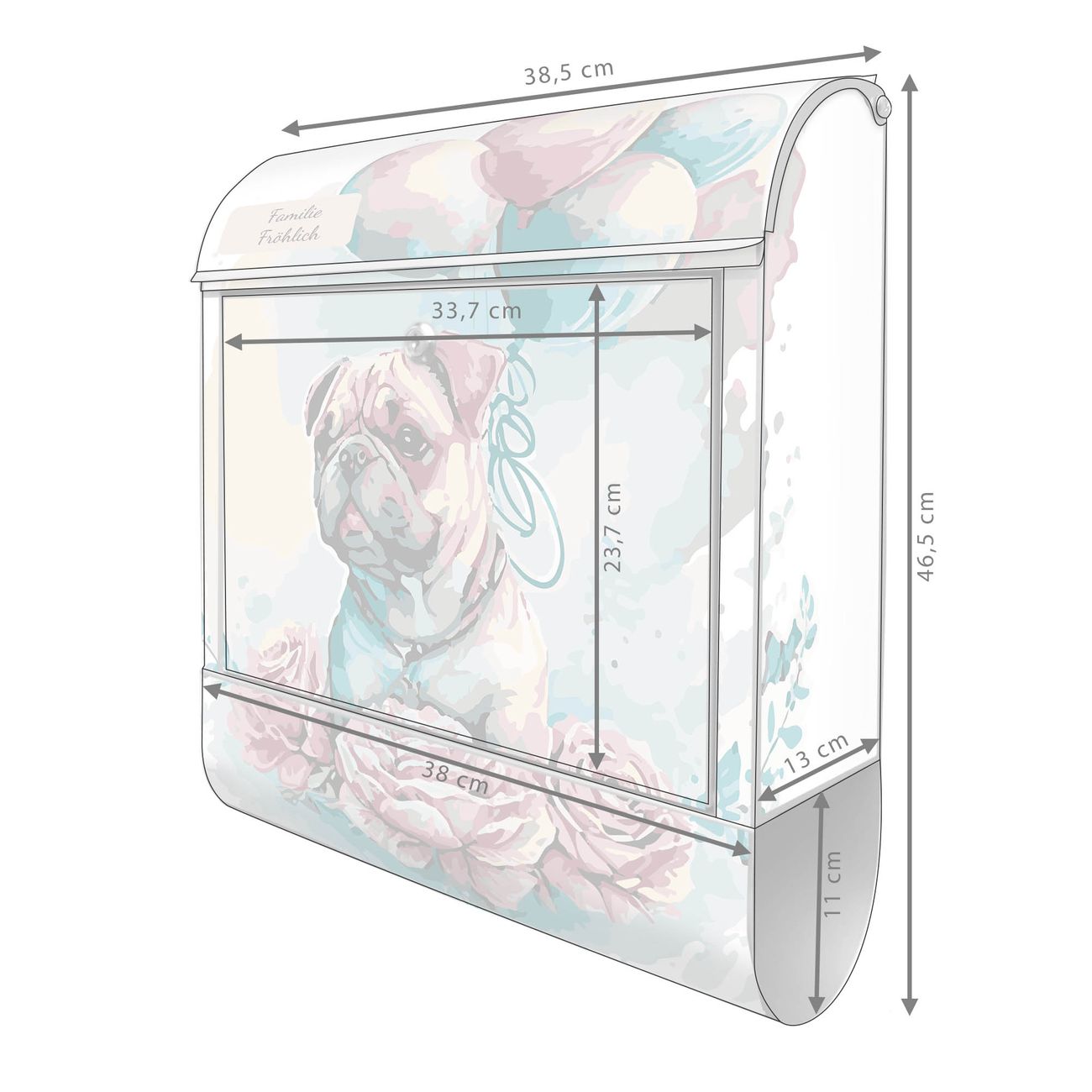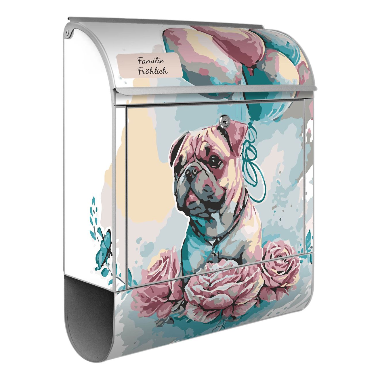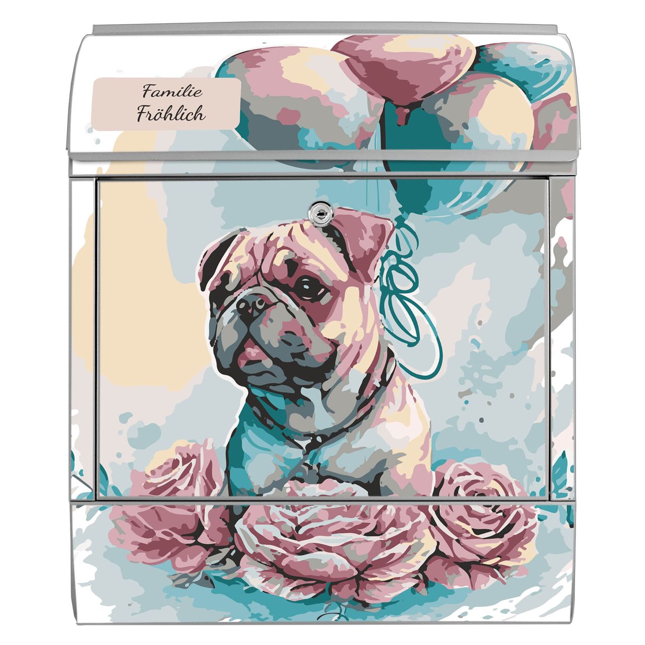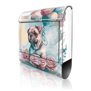 Großer Stahl Briefkasten Motiv Mops mit Ballons Aquarell