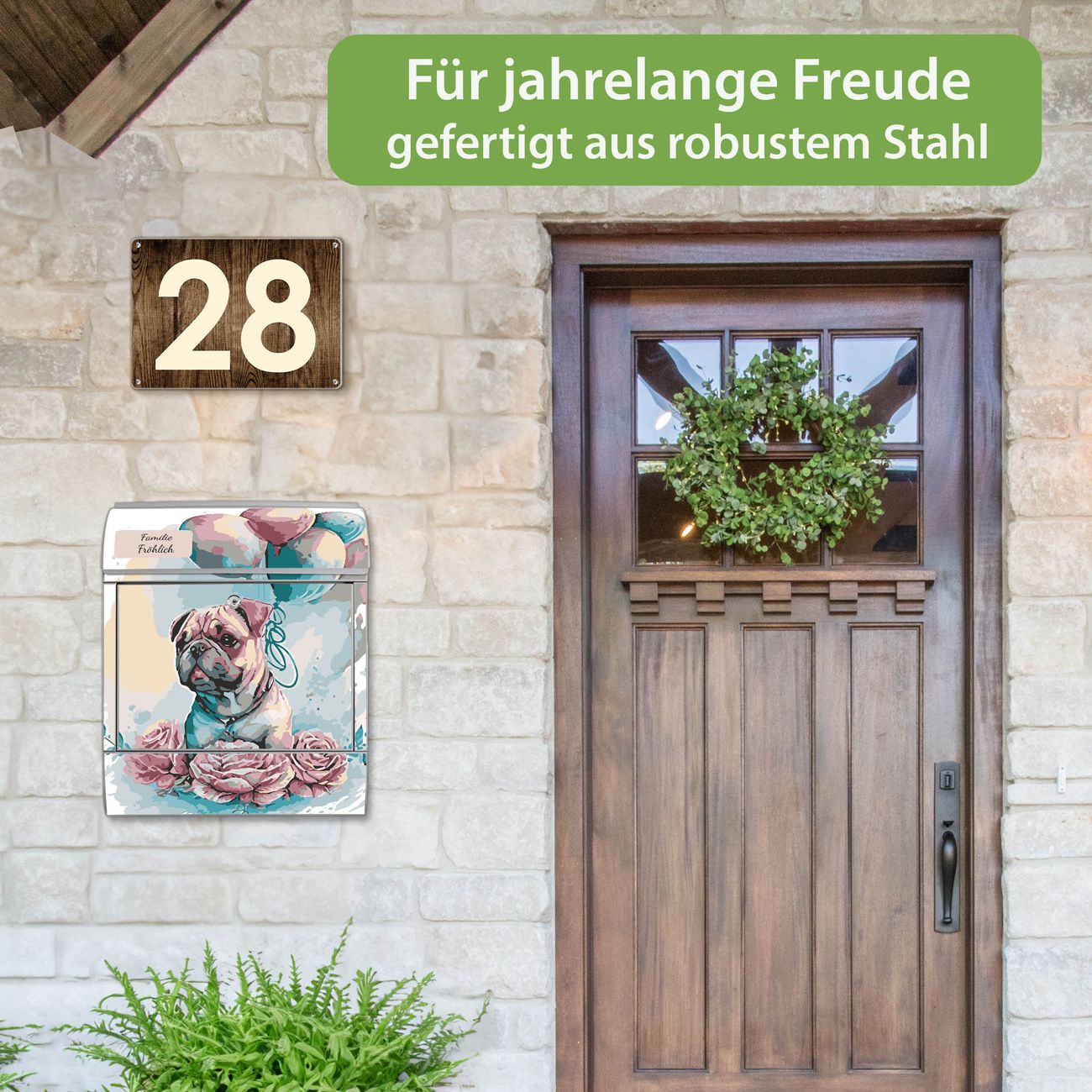 DESIGN: Der Postkasten mit Motiv Motiv Mops mit Ballons Aquarell hat ein sehr ansprechendes und ausgefallenes Design, damit entlocken Sie Ihren Nachbarn und dem Postboten ein Lächeln. Heben Sie Sich von der tristen grauen Masse ab, ohne auf Funktionalität zu verzichten. DETAILS: Der Postkasten besteht aus pulverbeschichtetem Stahl. Er ist 38x46x12,5cm groß. Das Motiv besteht aus einer wetter- und UV-resistenten Folie, die mit einem Schutzlaminat überzogen ist, sodass der Briefkasten zusätzlich vor Kratzern geschützt ist. Der Briefkasten wird mit Montagematerial, zusätzlich zwei Schlüssel sowie einer Bohrschablone geliefert. NUTZEN: Sie können diesen Briefkasten sowohl als Wandbriefkasten montieren oder einen passenden Ständer kaufen und als Standbriefkasten einbetonieren. Die Größe bietet genügend Platz für Sendungen aller Art, der Einwurf fasst auch größere A4 Sendungen. BANJADO: Ihr Briefkasten wird in Sachsen in einer kleinen Manufaktur von Hand veredelt. Die Motivfolie ist lösungsmittelfrei und schutzlaminiert für einen langen Halt. Wir legen großen Wert auf die Verbindung von Funktionalität und Design. Sie erhalten Handarbeit aus Sachsen.