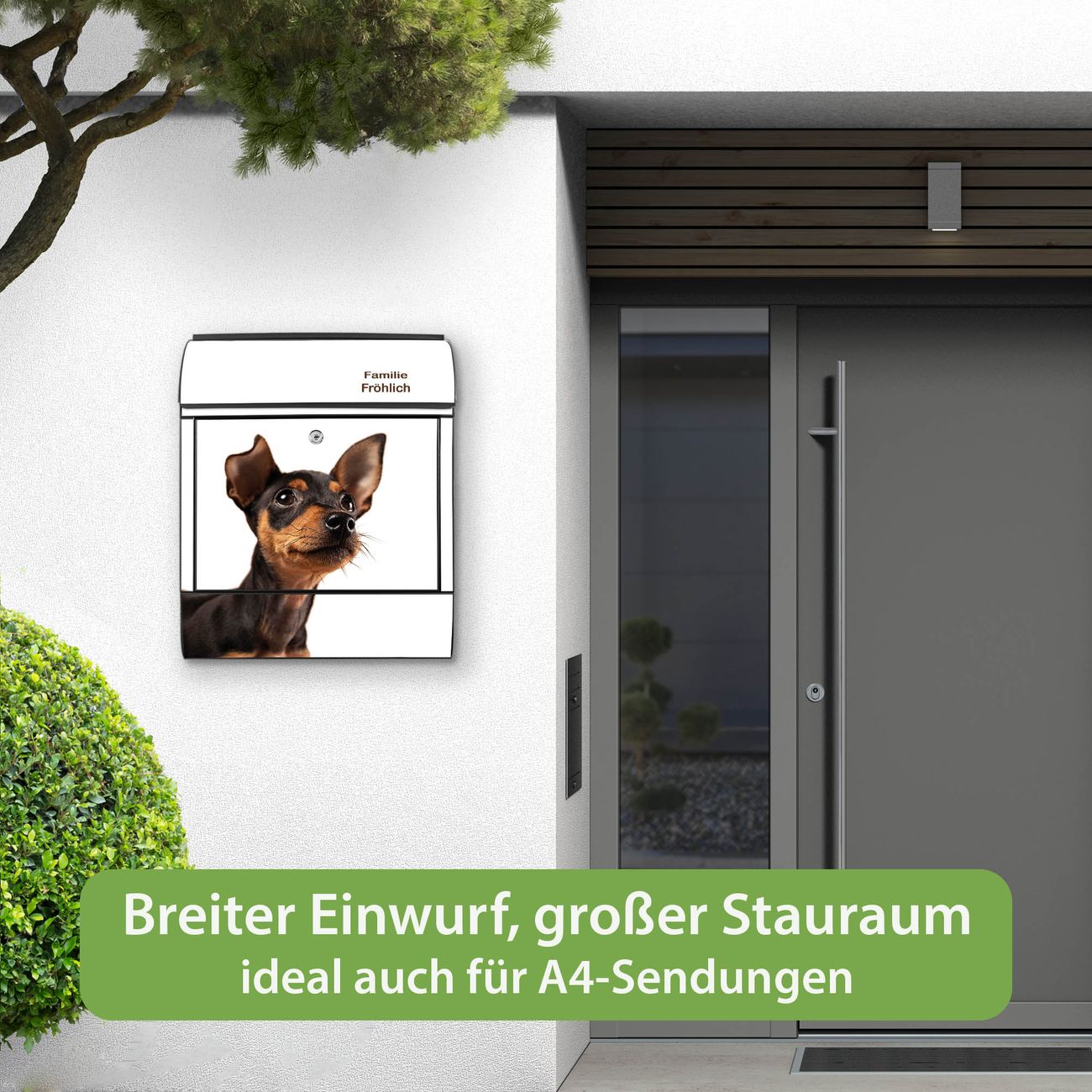 DESIGN: Der Postkasten mit Motiv Motiv Niedlicher Welpe hat ein sehr ansprechendes und ausgefallenes Design, damit entlocken Sie Ihren Nachbarn und dem Postboten ein Lächeln. Heben Sie Sich von der tristen grauen Masse ab, ohne auf Funktionalität zu verzichten. DETAILS: Der Postkasten besteht aus pulverbeschichtetem Stahl. Er ist 38x46x12,5cm groß. Das Motiv besteht aus einer wetter- und UV-resistenten Folie, die mit einem Schutzlaminat überzogen ist, sodass der Briefkasten zusätzlich vor Kratzern geschützt ist. Der Briefkasten wird mit Montagematerial, zusätzlich zwei Schlüssel sowie einer Bohrschablone geliefert. NUTZEN: Sie können diesen Briefkasten sowohl als Wandbriefkasten montieren oder einen passenden Ständer kaufen und als Standbriefkasten einbetonieren. Die Größe bietet genügend Platz für Sendungen aller Art, der Einwurf fasst auch größere A4 Sendungen. BANJADO: Ihr Briefkasten wird in Sachsen in einer kleinen Manufaktur von Hand veredelt. Die Motivfolie ist lösungsmittelfrei und schutzlaminiert für einen langen Halt. Wir legen großen Wert auf die Verbindung von Funktionalität und Design. Sie erhalten Handarbeit aus Sachsen.