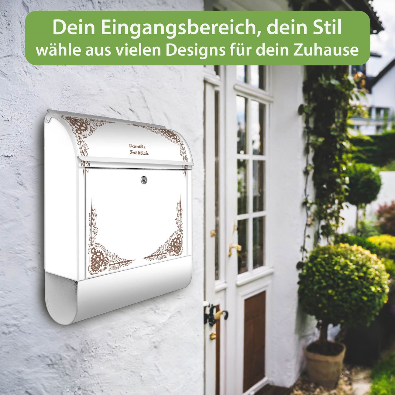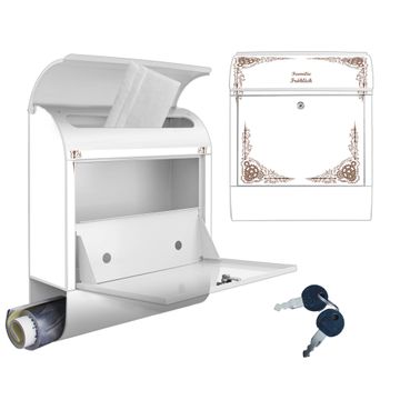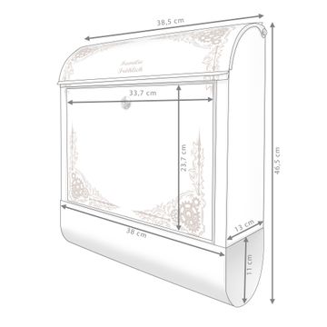 DESIGN: Der Postkasten mit Motiv Motiv Ornamentaler Zahnräderrahmen hat ein sehr ansprechendes und ausgefallenes Design, damit entlocken Sie Ihren Nachbarn und dem Postboten ein Lächeln. Heben Sie Sich von der tristen grauen Masse ab, ohne auf Funktionalität zu verzichten. DETAILS: Der Postkasten besteht aus pulverbeschichtetem Stahl. Er ist 38x46x12,5cm groß. Das Motiv besteht aus einer wetter- und UV-resistenten Folie, die mit einem Schutzlaminat überzogen ist, sodass der Briefkasten zusätzlich vor Kratzern geschützt ist. Der Briefkasten wird mit Montagematerial, zusätzlich zwei Schlüssel sowie einer Bohrschablone geliefert. NUTZEN: Sie können diesen Briefkasten sowohl als Wandbriefkasten montieren oder einen passenden Ständer kaufen und als Standbriefkasten einbetonieren. Die Größe bietet genügend Platz für Sendungen aller Art, der Einwurf fasst auch größere A4 Sendungen. BANJADO: Ihr Briefkasten wird in Sachsen in einer kleinen Manufaktur von Hand veredelt. Die Motivfolie ist lösungsmittelfrei und schutzlaminiert für einen langen Halt. Wir legen großen Wert auf die Verbindung von Funktionalität und Design. Sie erhalten Handarbeit aus Sachsen.