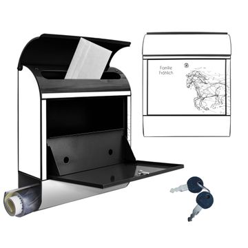 DESIGN: Der Postkasten mit Motiv Motiv Pferd abstrakt 2 hat ein sehr ansprechendes und ausgefallenes Design, damit entlocken Sie Ihren Nachbarn und dem Postboten ein Lächeln. Heben Sie Sich von der tristen grauen Masse ab, ohne auf Funktionalität zu verzichten. DETAILS: Der Postkasten besteht aus pulverbeschichtetem Stahl. Er ist 38x46x12,5cm groß. Das Motiv besteht aus einer wetter- und UV-resistenten Folie, die mit einem Schutzlaminat überzogen ist, sodass der Briefkasten zusätzlich vor Kratzern geschützt ist. Der Briefkasten wird mit Montagematerial, zusätzlich zwei Schlüssel sowie einer Bohrschablone geliefert. NUTZEN: Sie können diesen Briefkasten sowohl als Wandbriefkasten montieren oder einen passenden Ständer kaufen und als Standbriefkasten einbetonieren. Die Größe bietet genügend Platz für Sendungen aller Art, der Einwurf fasst auch größere A4 Sendungen. BANJADO: Ihr Briefkasten wird in Sachsen in einer kleinen Manufaktur von Hand veredelt. Die Motivfolie ist lösungsmittelfrei und schutzlaminiert für einen langen Halt. Wir legen großen Wert auf die Verbindung von Funktionalität und Design. Sie erhalten Handarbeit aus Sachsen.