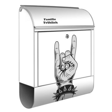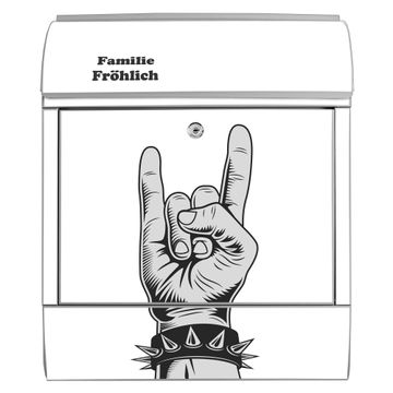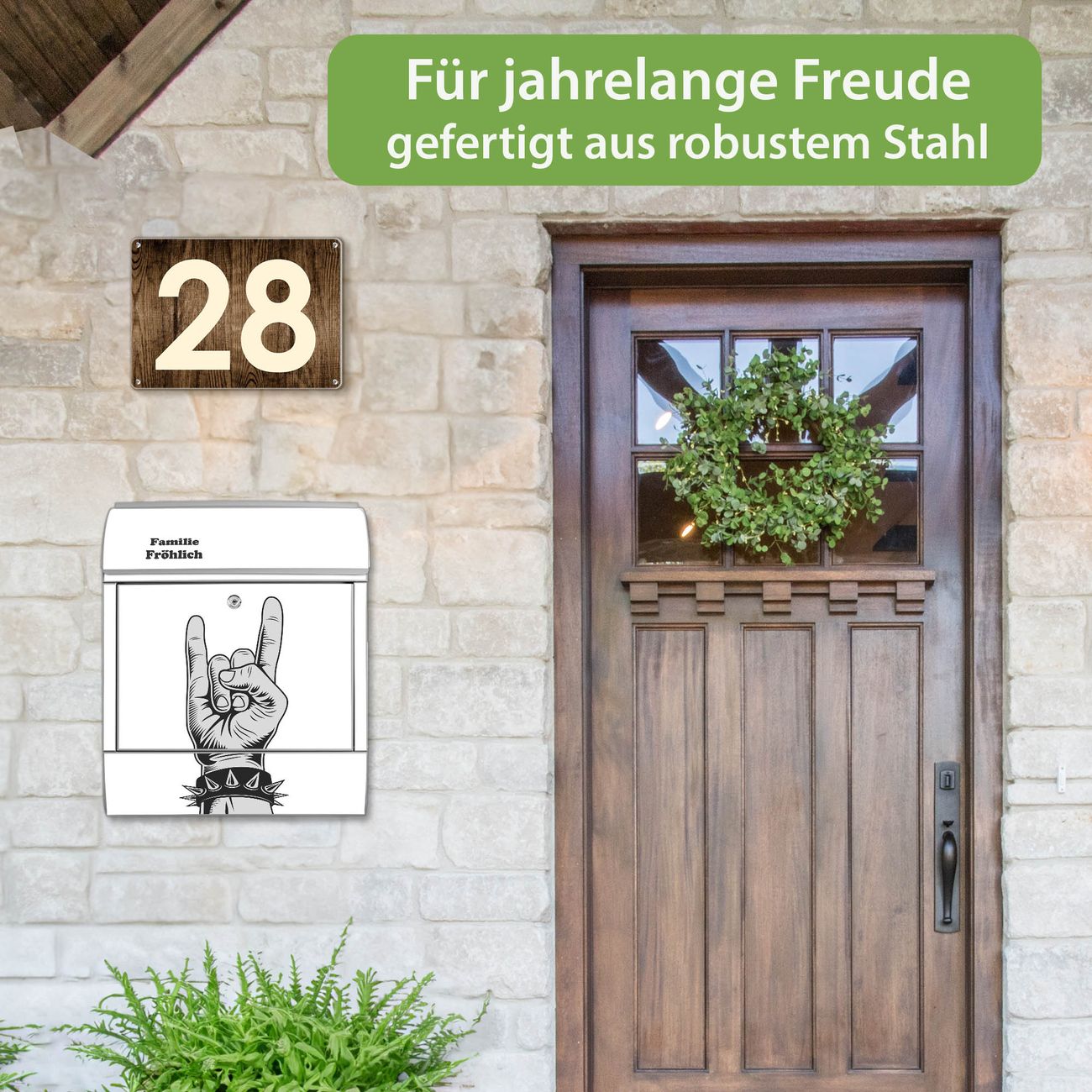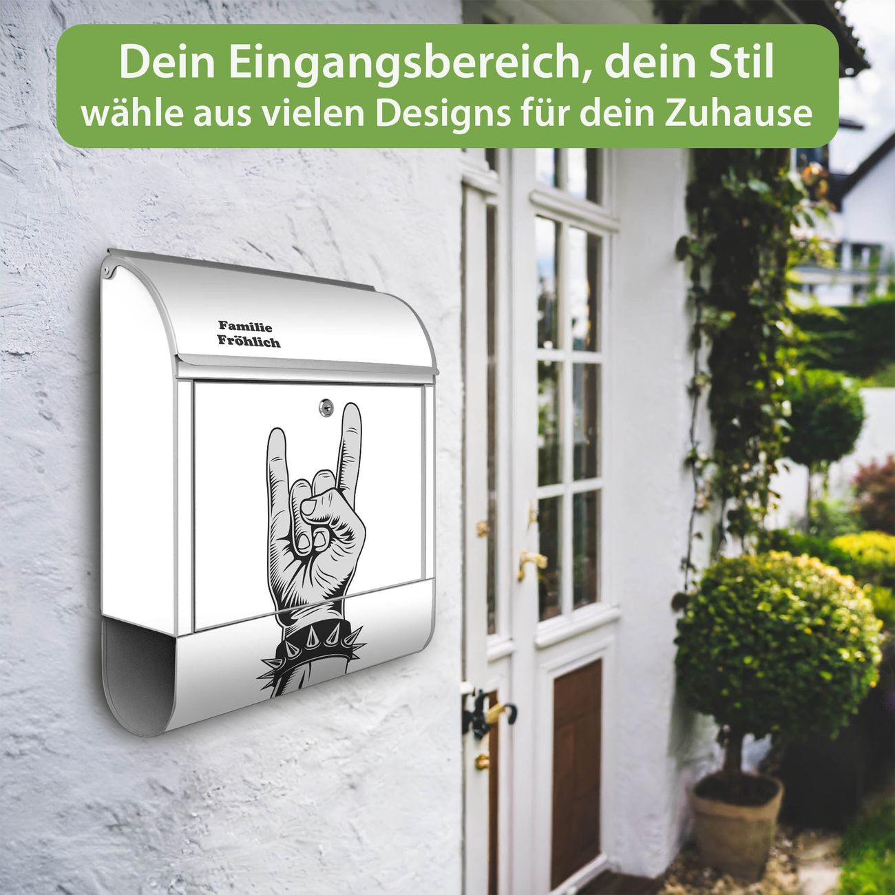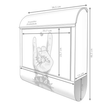 DESIGN: Der Postkasten mit Motiv Motiv Rockgruß hat ein sehr ansprechendes und ausgefallenes Design, damit entlocken Sie Ihren Nachbarn und dem Postboten ein Lächeln. Heben Sie Sich von der tristen grauen Masse ab, ohne auf Funktionalität zu verzichten. DETAILS: Der Postkasten besteht aus pulverbeschichtetem Stahl. Er ist 38x46x12,5cm groß. Das Motiv besteht aus einer wetter- und UV-resistenten Folie, die mit einem Schutzlaminat überzogen ist, sodass der Briefkasten zusätzlich vor Kratzern geschützt ist. Der Briefkasten wird mit Montagematerial, zusätzlich zwei Schlüssel sowie einer Bohrschablone geliefert. NUTZEN: Sie können diesen Briefkasten sowohl als Wandbriefkasten montieren oder einen passenden Ständer kaufen und als Standbriefkasten einbetonieren. Die Größe bietet genügend Platz für Sendungen aller Art, der Einwurf fasst auch größere A4 Sendungen. BANJADO: Ihr Briefkasten wird in Sachsen in einer kleinen Manufaktur von Hand veredelt. Die Motivfolie ist lösungsmittelfrei und schutzlaminiert für einen langen Halt. Wir legen großen Wert auf die Verbindung von Funktionalität und Design. Sie erhalten Handarbeit aus Sachsen.