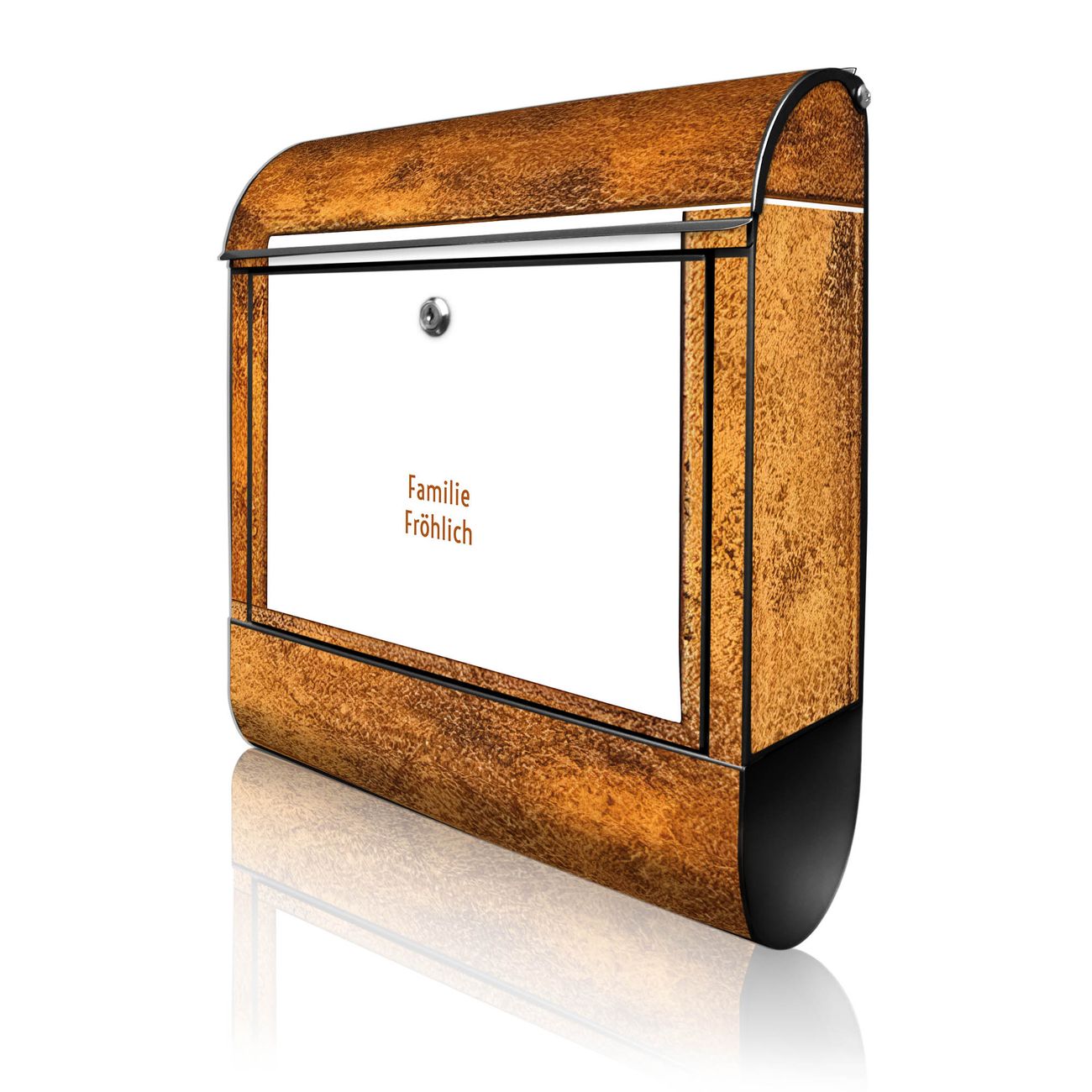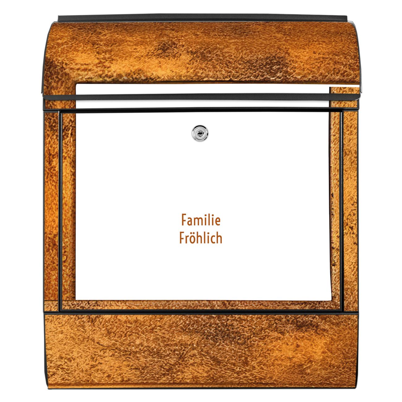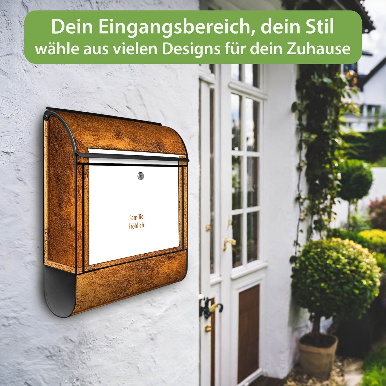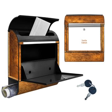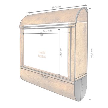 DESIGN: Der Postkasten mit Motiv Motiv Rustikaler Holzrahmen 2 hat ein sehr ansprechendes und ausgefallenes Design, damit entlocken Sie Ihren Nachbarn und dem Postboten ein Lächeln. Heben Sie Sich von der tristen grauen Masse ab, ohne auf Funktionalität zu verzichten. DETAILS: Der Postkasten besteht aus pulverbeschichtetem Stahl. Er ist 38x46x12,5cm groß. Das Motiv besteht aus einer wetter- und UV-resistenten Folie, die mit einem Schutzlaminat überzogen ist, sodass der Briefkasten zusätzlich vor Kratzern geschützt ist. Der Briefkasten wird mit Montagematerial, zusätzlich zwei Schlüssel sowie einer Bohrschablone geliefert. NUTZEN: Sie können diesen Briefkasten sowohl als Wandbriefkasten montieren oder einen passenden Ständer kaufen und als Standbriefkasten einbetonieren. Die Größe bietet genügend Platz für Sendungen aller Art, der Einwurf fasst auch größere A4 Sendungen. BANJADO: Ihr Briefkasten wird in Sachsen in einer kleinen Manufaktur von Hand veredelt. Die Motivfolie ist lösungsmittelfrei und schutzlaminiert für einen langen Halt. Wir legen großen Wert auf die Verbindung von Funktionalität und Design. Sie erhalten Handarbeit aus Sachsen.