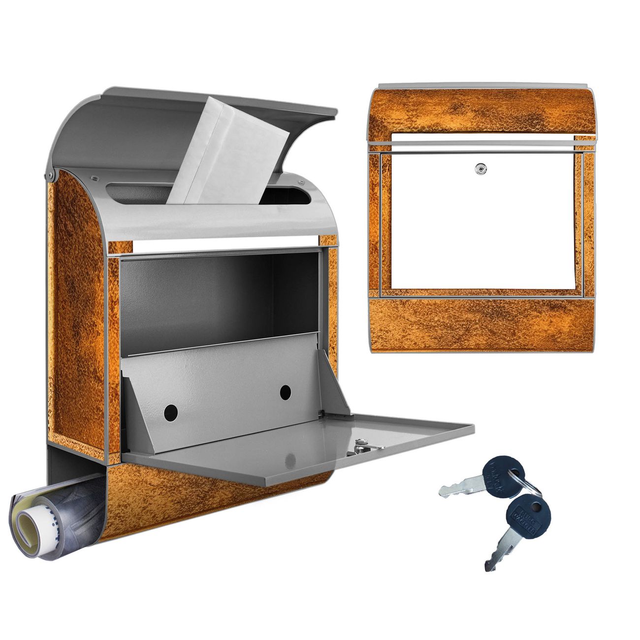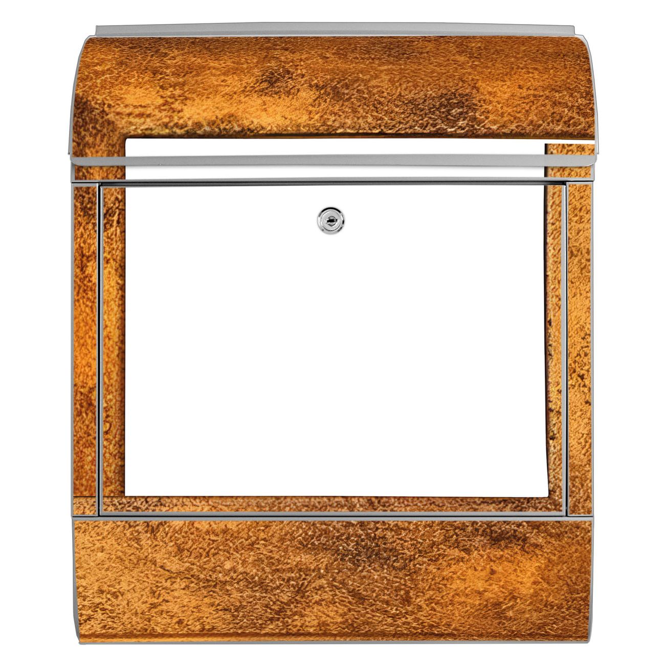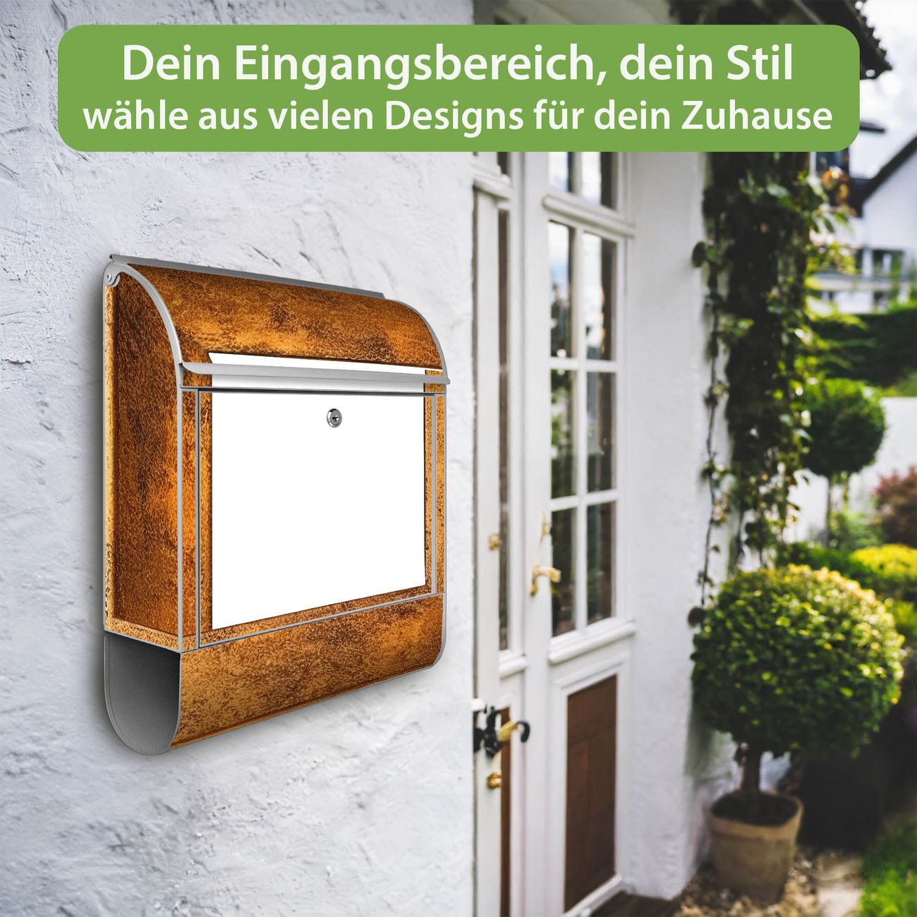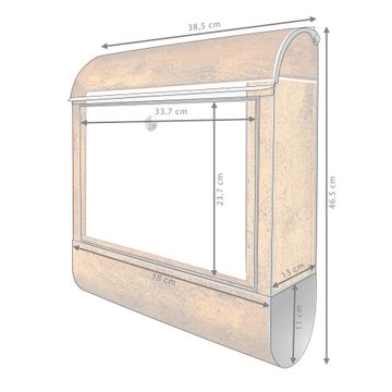 DESIGN: Der Postkasten mit Motiv Motiv Rustikaler Holzrahmen 2 hat ein sehr ansprechendes und ausgefallenes Design, damit entlocken Sie Ihren Nachbarn und dem Postboten ein Lächeln. Heben Sie Sich von der tristen grauen Masse ab, ohne auf Funktionalität zu verzichten. DETAILS: Der Postkasten besteht aus pulverbeschichtetem Stahl. Er ist 38x46x12,5cm groß. Das Motiv besteht aus einer wetter- und UV-resistenten Folie, die mit einem Schutzlaminat überzogen ist, sodass der Briefkasten zusätzlich vor Kratzern geschützt ist. Der Briefkasten wird mit Montagematerial, zusätzlich zwei Schlüssel sowie einer Bohrschablone geliefert. NUTZEN: Sie können diesen Briefkasten sowohl als Wandbriefkasten montieren oder einen passenden Ständer kaufen und als Standbriefkasten einbetonieren. Die Größe bietet genügend Platz für Sendungen aller Art, der Einwurf fasst auch größere A4 Sendungen. BANJADO: Ihr Briefkasten wird in Sachsen in einer kleinen Manufaktur von Hand veredelt. Die Motivfolie ist lösungsmittelfrei und schutzlaminiert für einen langen Halt. Wir legen großen Wert auf die Verbindung von Funktionalität und Design. Sie erhalten Handarbeit aus Sachsen.