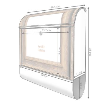 DESIGN: Der Postkasten mit Motiv Motiv Rustikaler Holzrahmen hat ein sehr ansprechendes und ausgefallenes Design, damit entlocken Sie Ihren Nachbarn und dem Postboten ein Lächeln. Heben Sie Sich von der tristen grauen Masse ab, ohne auf Funktionalität zu verzichten. DETAILS: Der Postkasten besteht aus pulverbeschichtetem Stahl. Er ist 38x46x12,5cm groß. Das Motiv besteht aus einer wetter- und UV-resistenten Folie, die mit einem Schutzlaminat überzogen ist, sodass der Briefkasten zusätzlich vor Kratzern geschützt ist. Der Briefkasten wird mit Montagematerial, zusätzlich zwei Schlüssel sowie einer Bohrschablone geliefert. NUTZEN: Sie können diesen Briefkasten sowohl als Wandbriefkasten montieren oder einen passenden Ständer kaufen und als Standbriefkasten einbetonieren. Die Größe bietet genügend Platz für Sendungen aller Art, der Einwurf fasst auch größere A4 Sendungen. BANJADO: Ihr Briefkasten wird in Sachsen in einer kleinen Manufaktur von Hand veredelt. Die Motivfolie ist lösungsmittelfrei und schutzlaminiert für einen langen Halt. Wir legen großen Wert auf die Verbindung von Funktionalität und Design. Sie erhalten Handarbeit aus Sachsen.