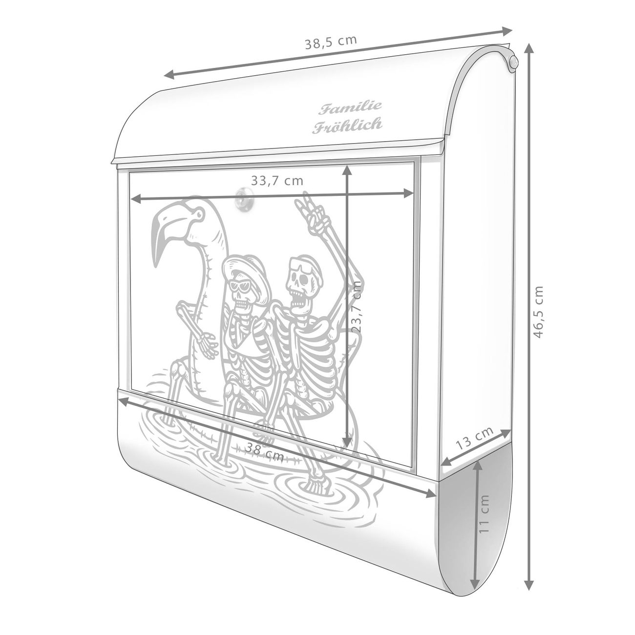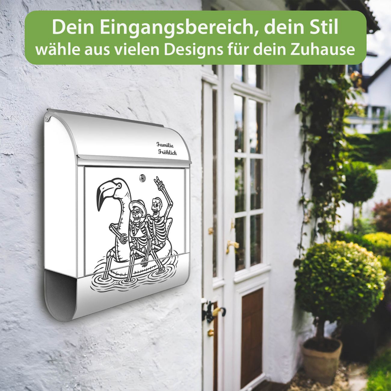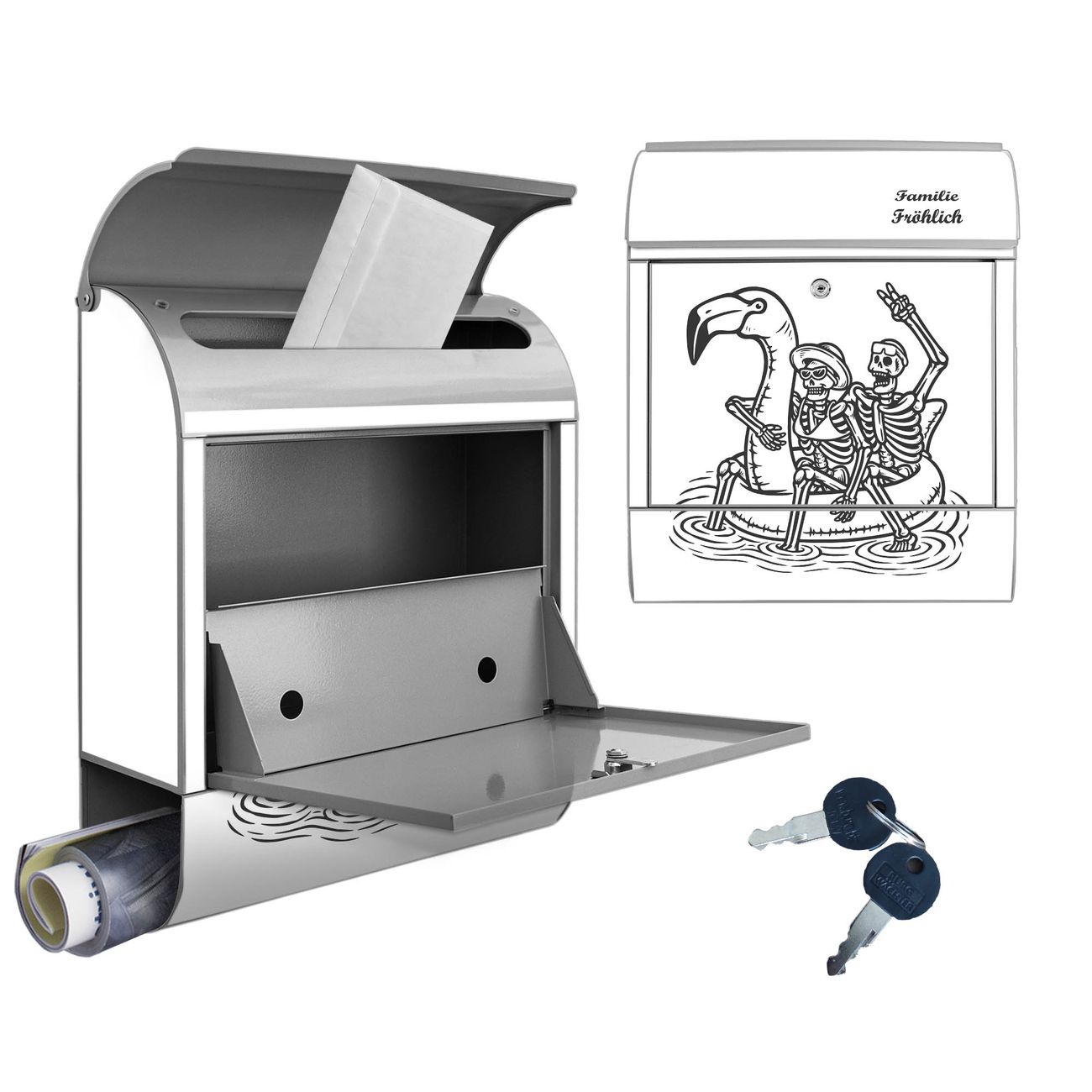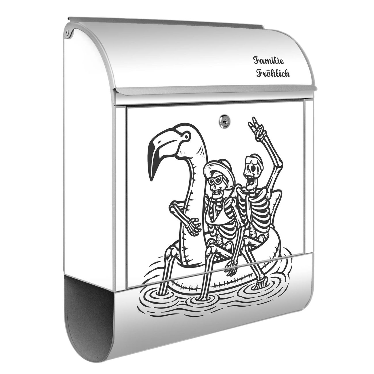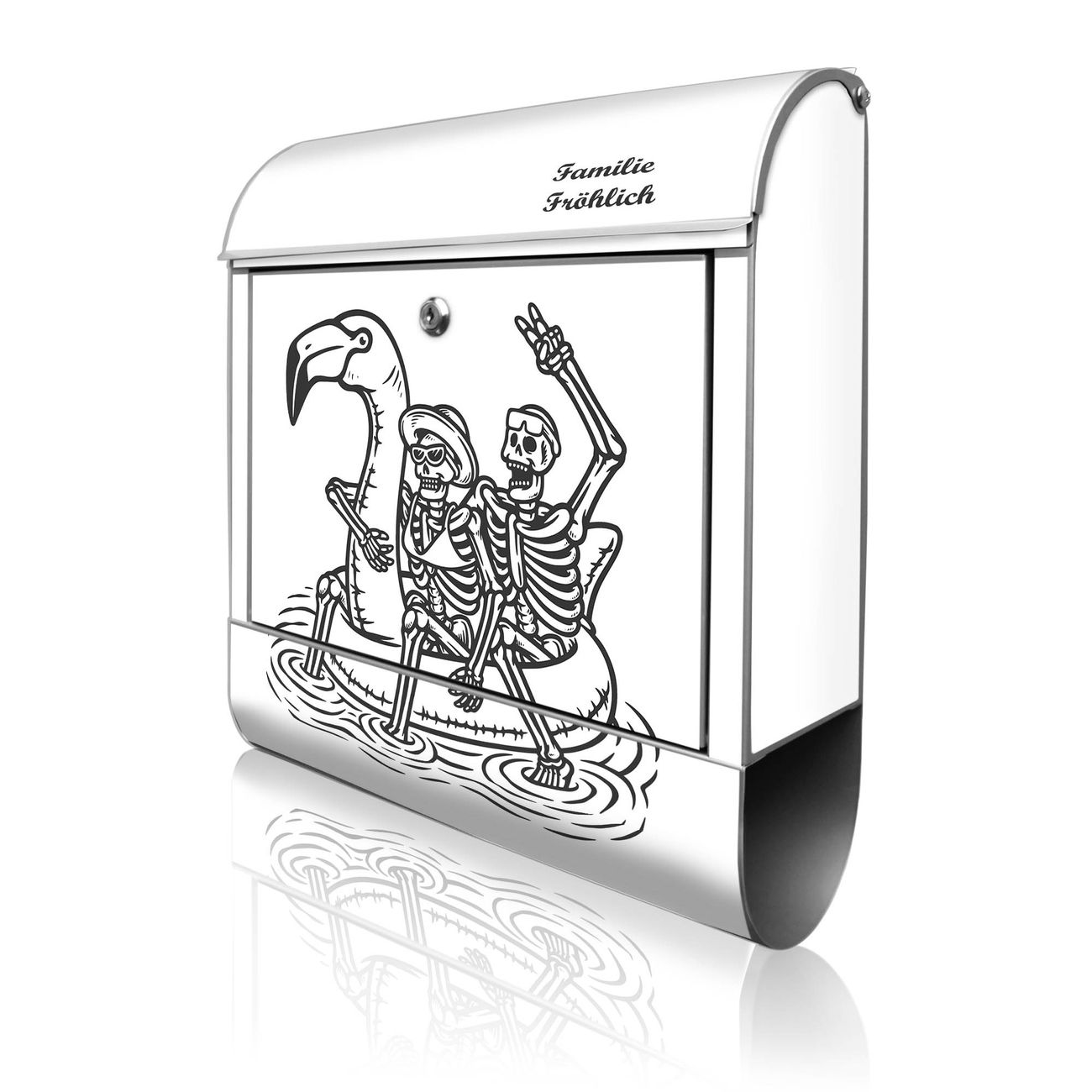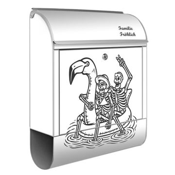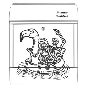 Großer Stahl Briefkasten Motiv Skelette mit Flamingoschwimmring 2