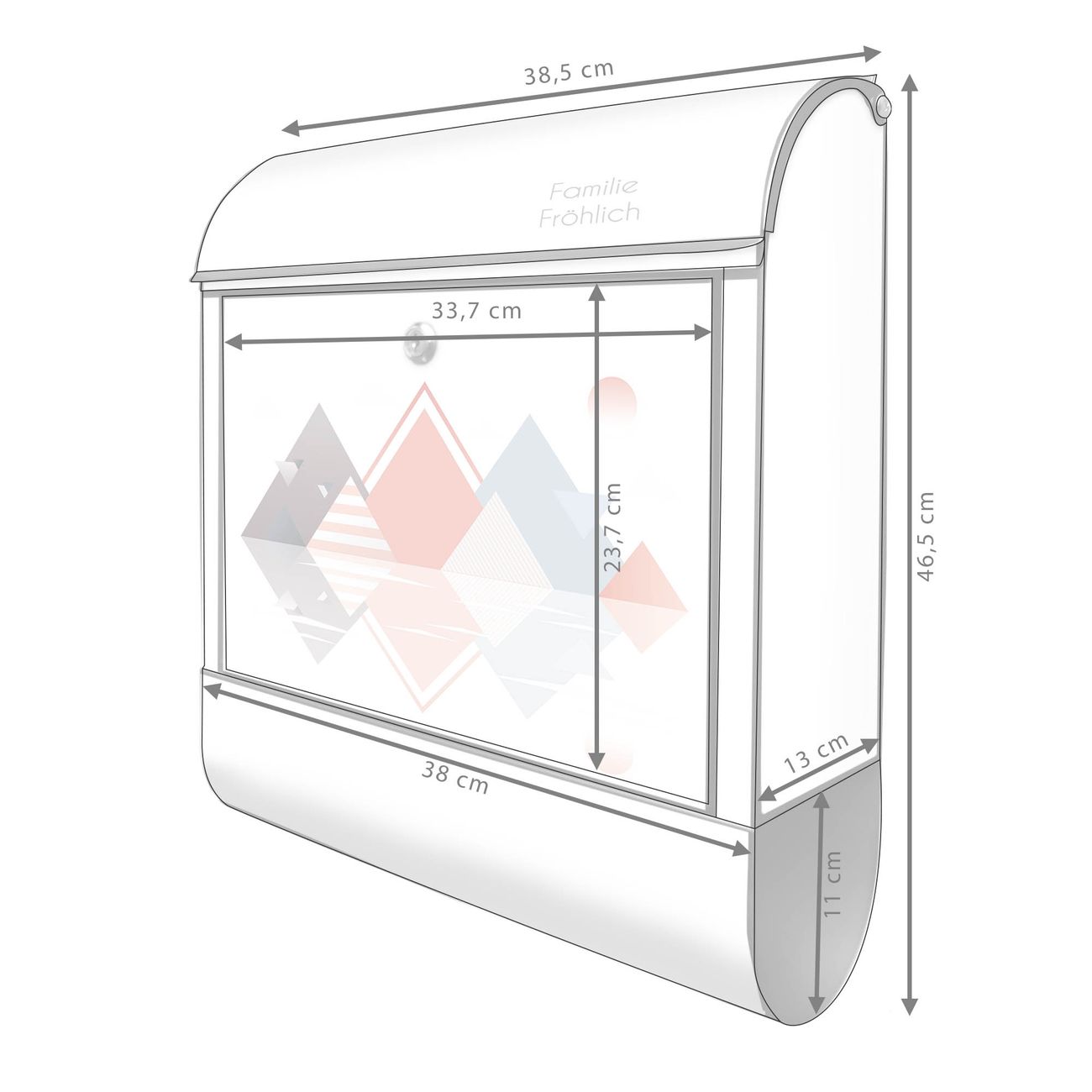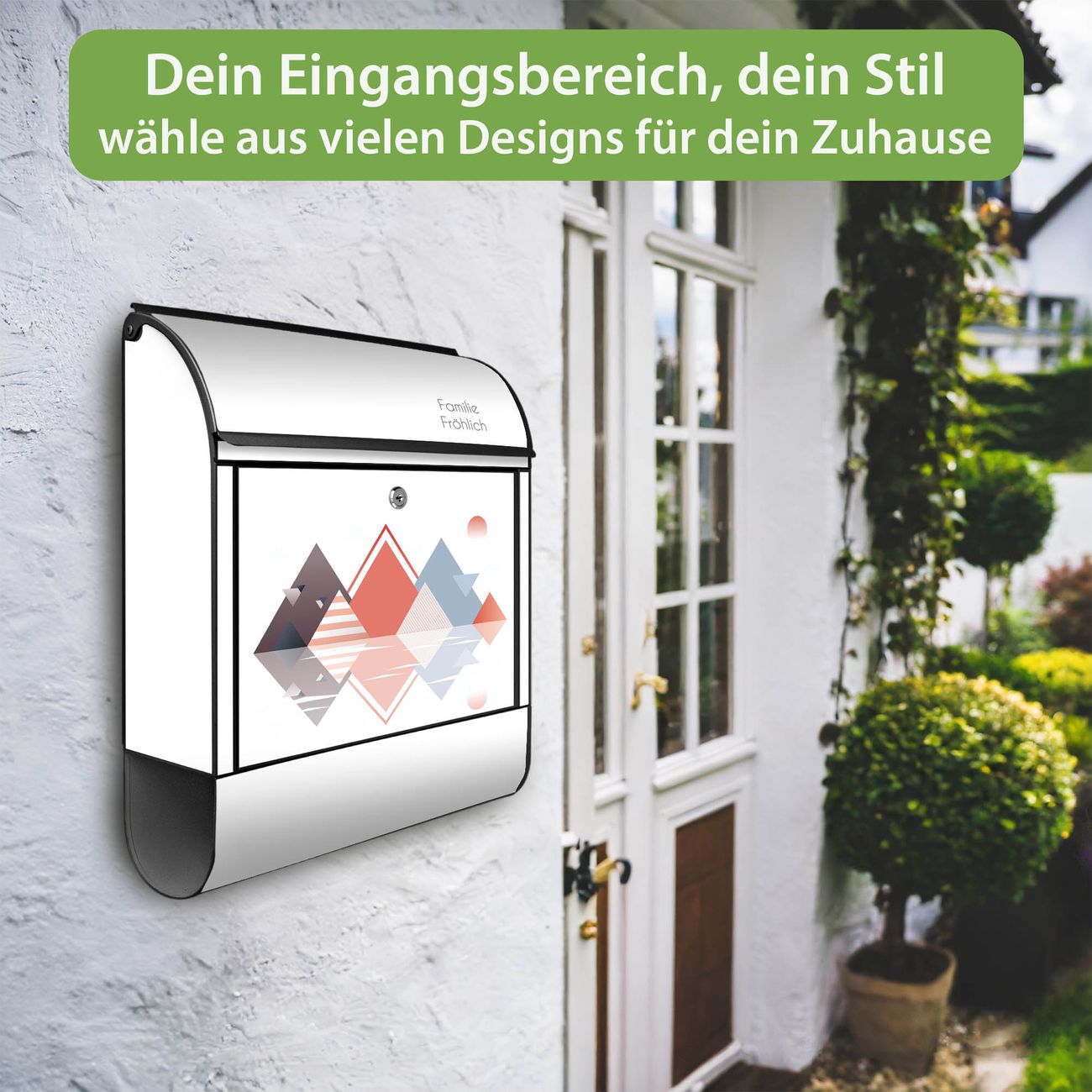 DESIGN: Der Postkasten mit Motiv Motiv Spiegelnde Geometrie hat ein sehr ansprechendes und ausgefallenes Design, damit entlocken Sie Ihren Nachbarn und dem Postboten ein Lächeln. Heben Sie Sich von der tristen grauen Masse ab, ohne auf Funktionalität zu verzichten. DETAILS: Der Postkasten besteht aus pulverbeschichtetem Stahl. Er ist 38x46x12,5cm groß. Das Motiv besteht aus einer wetter- und UV-resistenten Folie, die mit einem Schutzlaminat überzogen ist, sodass der Briefkasten zusätzlich vor Kratzern geschützt ist. Der Briefkasten wird mit Montagematerial, zusätzlich zwei Schlüssel sowie einer Bohrschablone geliefert. NUTZEN: Sie können diesen Briefkasten sowohl als Wandbriefkasten montieren oder einen passenden Ständer kaufen und als Standbriefkasten einbetonieren. Die Größe bietet genügend Platz für Sendungen aller Art, der Einwurf fasst auch größere A4 Sendungen. BANJADO: Ihr Briefkasten wird in Sachsen in einer kleinen Manufaktur von Hand veredelt. Die Motivfolie ist lösungsmittelfrei und schutzlaminiert für einen langen Halt. Wir legen großen Wert auf die Verbindung von Funktionalität und Design. Sie erhalten Handarbeit aus Sachsen.