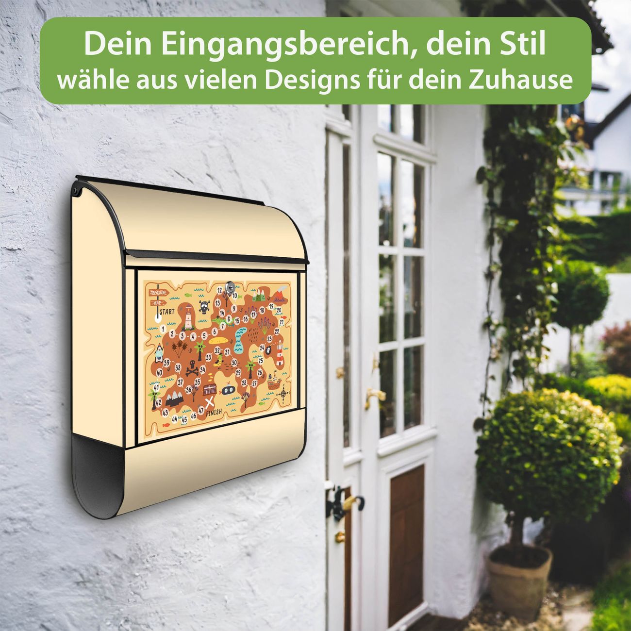DESIGN: Der Postkasten mit Motiv Motiv Spielbrett 6 hat ein sehr ansprechendes und ausgefallenes Design, damit entlocken Sie Ihren Nachbarn und dem Postboten ein Lächeln. Heben Sie Sich von der tristen grauen Masse ab, ohne auf Funktionalität zu verzichten. DETAILS: Der Postkasten besteht aus pulverbeschichtetem Stahl. Er ist 38x46x12,5cm groß. Das Motiv besteht aus einer wetter- und UV-resistenten Folie, die mit einem Schutzlaminat überzogen ist, sodass der Briefkasten zusätzlich vor Kratzern geschützt ist. Der Briefkasten wird mit Montagematerial, zusätzlich zwei Schlüssel sowie einer Bohrschablone geliefert. NUTZEN: Sie können diesen Briefkasten sowohl als Wandbriefkasten montieren oder einen passenden Ständer kaufen und als Standbriefkasten einbetonieren. Die Größe bietet genügend Platz für Sendungen aller Art, der Einwurf fasst auch größere A4 Sendungen. BANJADO: Ihr Briefkasten wird in Sachsen in einer kleinen Manufaktur von Hand veredelt. Die Motivfolie ist lösungsmittelfrei und schutzlaminiert für einen langen Halt. Wir legen großen Wert auf die Verbindung von Funktionalität und Design. Sie erhalten Handarbeit aus Sachsen.