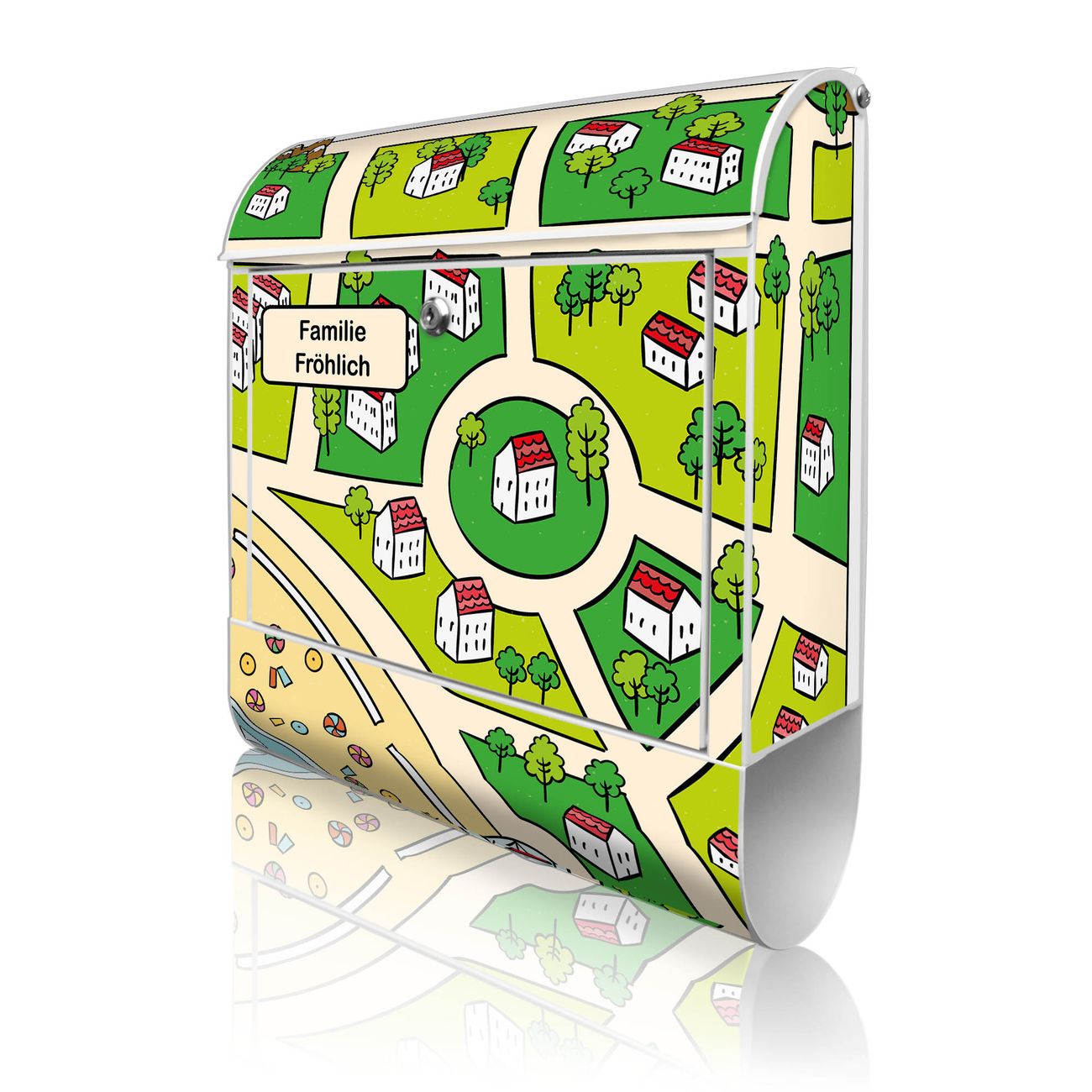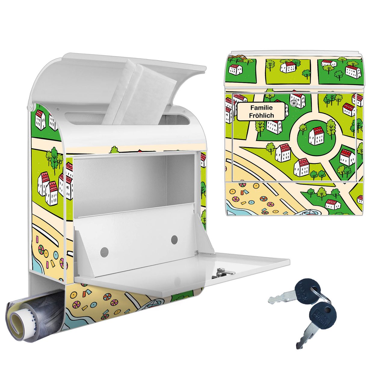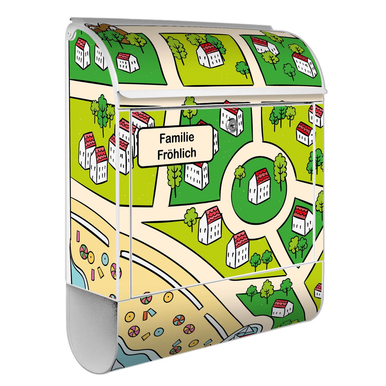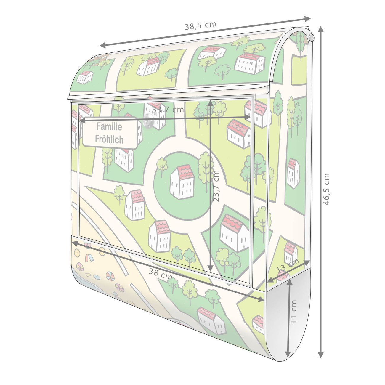 DESIGN: Der Postkasten mit Motiv Motiv Spielstraße 5 hat ein sehr ansprechendes und ausgefallenes Design, damit entlocken Sie Ihren Nachbarn und dem Postboten ein Lächeln. Heben Sie Sich von der tristen grauen Masse ab, ohne auf Funktionalität zu verzichten. DETAILS: Der Postkasten besteht aus pulverbeschichtetem Stahl. Er ist 38x46x12,5cm groß. Das Motiv besteht aus einer wetter- und UV-resistenten Folie, die mit einem Schutzlaminat überzogen ist, sodass der Briefkasten zusätzlich vor Kratzern geschützt ist. Der Briefkasten wird mit Montagematerial, zusätzlich zwei Schlüssel sowie einer Bohrschablone geliefert. NUTZEN: Sie können diesen Briefkasten sowohl als Wandbriefkasten montieren oder einen passenden Ständer kaufen und als Standbriefkasten einbetonieren. Die Größe bietet genügend Platz für Sendungen aller Art, der Einwurf fasst auch größere A4 Sendungen. BANJADO: Ihr Briefkasten wird in Sachsen in einer kleinen Manufaktur von Hand veredelt. Die Motivfolie ist lösungsmittelfrei und schutzlaminiert für einen langen Halt. Wir legen großen Wert auf die Verbindung von Funktionalität und Design. Sie erhalten Handarbeit aus Sachsen.
