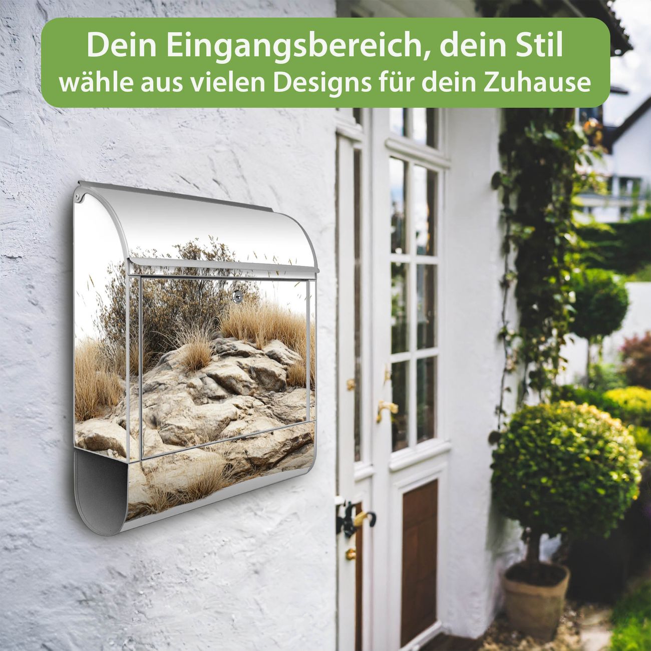 DESIGN: Der Postkasten mit Motiv Motiv Steinige Landschaft hat ein sehr ansprechendes und ausgefallenes Design, damit entlocken Sie Ihren Nachbarn und dem Postboten ein Lächeln. Heben Sie Sich von der tristen grauen Masse ab, ohne auf Funktionalität zu verzichten. DETAILS: Der Postkasten besteht aus pulverbeschichtetem Stahl. Er ist 38x46x12,5cm groß. Das Motiv besteht aus einer wetter- und UV-resistenten Folie, die mit einem Schutzlaminat überzogen ist, sodass der Briefkasten zusätzlich vor Kratzern geschützt ist. Der Briefkasten wird mit Montagematerial, zusätzlich zwei Schlüssel sowie einer Bohrschablone geliefert. NUTZEN: Sie können diesen Briefkasten sowohl als Wandbriefkasten montieren oder einen passenden Ständer kaufen und als Standbriefkasten einbetonieren. Die Größe bietet genügend Platz für Sendungen aller Art, der Einwurf fasst auch größere A4 Sendungen. BANJADO: Ihr Briefkasten wird in Sachsen in einer kleinen Manufaktur von Hand veredelt. Die Motivfolie ist lösungsmittelfrei und schutzlaminiert für einen langen Halt. Wir legen großen Wert auf die Verbindung von Funktionalität und Design. Sie erhalten Handarbeit aus Sachsen.