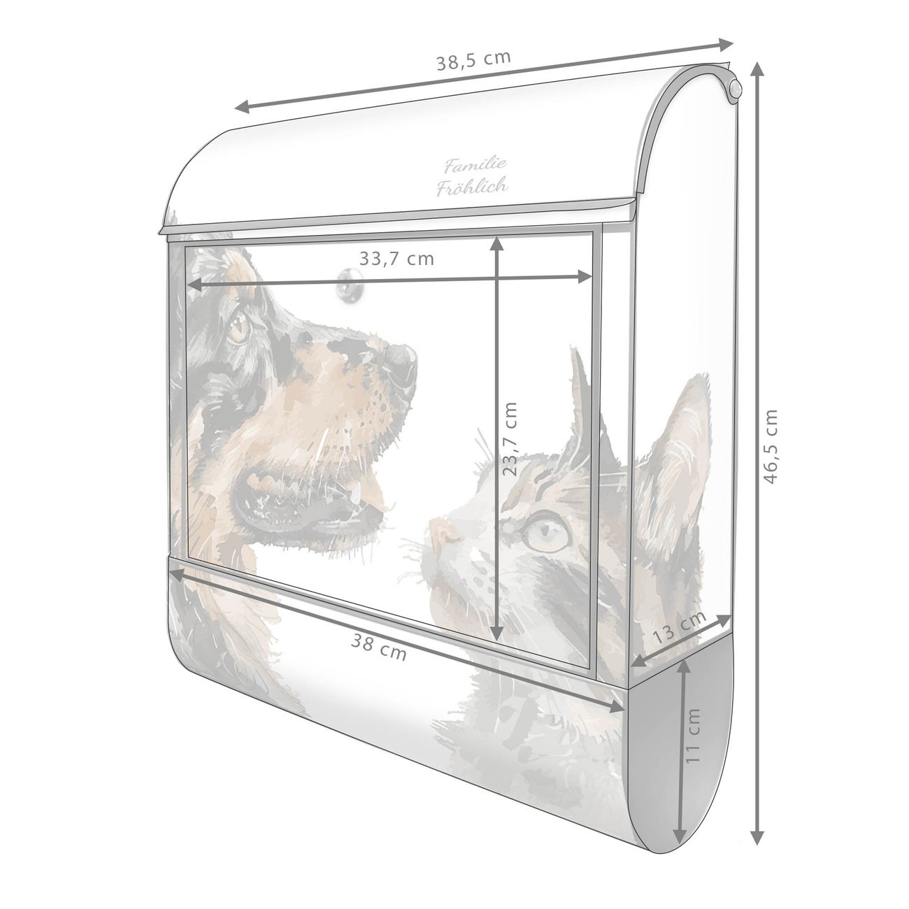 DESIGN: Der Postkasten mit Motiv Motiv Tierische Begegnung hat ein sehr ansprechendes und ausgefallenes Design, damit entlocken Sie Ihren Nachbarn und dem Postboten ein Lächeln. Heben Sie Sich von der tristen grauen Masse ab, ohne auf Funktionalität zu verzichten. DETAILS: Der Postkasten besteht aus pulverbeschichtetem Stahl. Er ist 38x46x12,5cm groß. Das Motiv besteht aus einer wetter- und UV-resistenten Folie, die mit einem Schutzlaminat überzogen ist, sodass der Briefkasten zusätzlich vor Kratzern geschützt ist. Der Briefkasten wird mit Montagematerial, zusätzlich zwei Schlüssel sowie einer Bohrschablone geliefert. NUTZEN: Sie können diesen Briefkasten sowohl als Wandbriefkasten montieren oder einen passenden Ständer kaufen und als Standbriefkasten einbetonieren. Die Größe bietet genügend Platz für Sendungen aller Art, der Einwurf fasst auch größere A4 Sendungen. BANJADO: Ihr Briefkasten wird in Sachsen in einer kleinen Manufaktur von Hand veredelt. Die Motivfolie ist lösungsmittelfrei und schutzlaminiert für einen langen Halt. Wir legen großen Wert auf die Verbindung von Funktionalität und Design. Sie erhalten Handarbeit aus Sachsen.