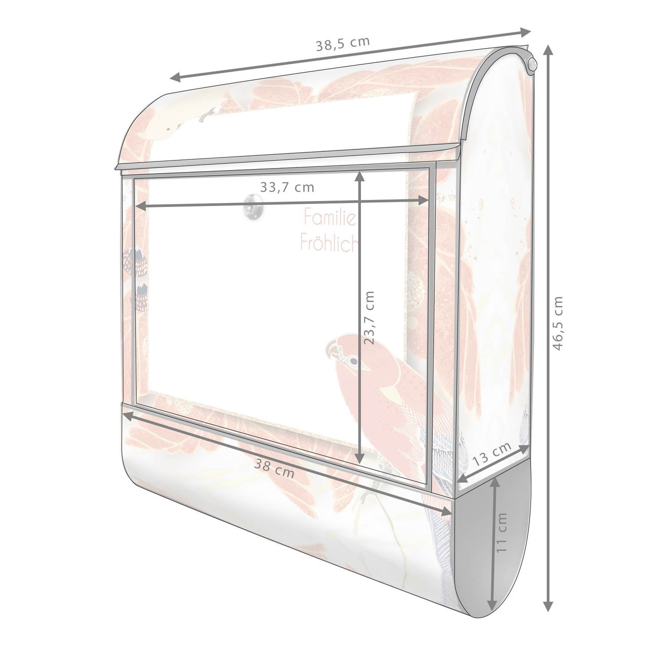 DESIGN: Der Postkasten mit Motiv Motiv Vogelrahmen hat ein sehr ansprechendes und ausgefallenes Design, damit entlocken Sie Ihren Nachbarn und dem Postboten ein Lächeln. Heben Sie Sich von der tristen grauen Masse ab, ohne auf Funktionalität zu verzichten. DETAILS: Der Postkasten besteht aus pulverbeschichtetem Stahl. Er ist 38x46x12,5cm groß. Das Motiv besteht aus einer wetter- und UV-resistenten Folie, die mit einem Schutzlaminat überzogen ist, sodass der Briefkasten zusätzlich vor Kratzern geschützt ist. Der Briefkasten wird mit Montagematerial, zusätzlich zwei Schlüssel sowie einer Bohrschablone geliefert. NUTZEN: Sie können diesen Briefkasten sowohl als Wandbriefkasten montieren oder einen passenden Ständer kaufen und als Standbriefkasten einbetonieren. Die Größe bietet genügend Platz für Sendungen aller Art, der Einwurf fasst auch größere A4 Sendungen. BANJADO: Ihr Briefkasten wird in Sachsen in einer kleinen Manufaktur von Hand veredelt. Die Motivfolie ist lösungsmittelfrei und schutzlaminiert für einen langen Halt. Wir legen großen Wert auf die Verbindung von Funktionalität und Design. Sie erhalten Handarbeit aus Sachsen.