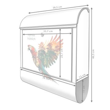 DESIGN: Der Postkasten mit Motiv Motiv Wald und Vogel Silhouette hat ein sehr ansprechendes und ausgefallenes Design, damit entlocken Sie Ihren Nachbarn und dem Postboten ein Lächeln. Heben Sie Sich von der tristen grauen Masse ab, ohne auf Funktionalität zu verzichten. DETAILS: Der Postkasten besteht aus pulverbeschichtetem Stahl. Er ist 38x46x12,5cm groß. Das Motiv besteht aus einer wetter- und UV-resistenten Folie, die mit einem Schutzlaminat überzogen ist, sodass der Briefkasten zusätzlich vor Kratzern geschützt ist. Der Briefkasten wird mit Montagematerial, zusätzlich zwei Schlüssel sowie einer Bohrschablone geliefert. NUTZEN: Sie können diesen Briefkasten sowohl als Wandbriefkasten montieren oder einen passenden Ständer kaufen und als Standbriefkasten einbetonieren. Die Größe bietet genügend Platz für Sendungen aller Art, der Einwurf fasst auch größere A4 Sendungen. BANJADO: Ihr Briefkasten wird in Sachsen in einer kleinen Manufaktur von Hand veredelt. Die Motivfolie ist lösungsmittelfrei und schutzlaminiert für einen langen Halt. Wir legen großen Wert auf die Verbindung von Funktionalität und Design. Sie erhalten Handarbeit aus Sachsen.