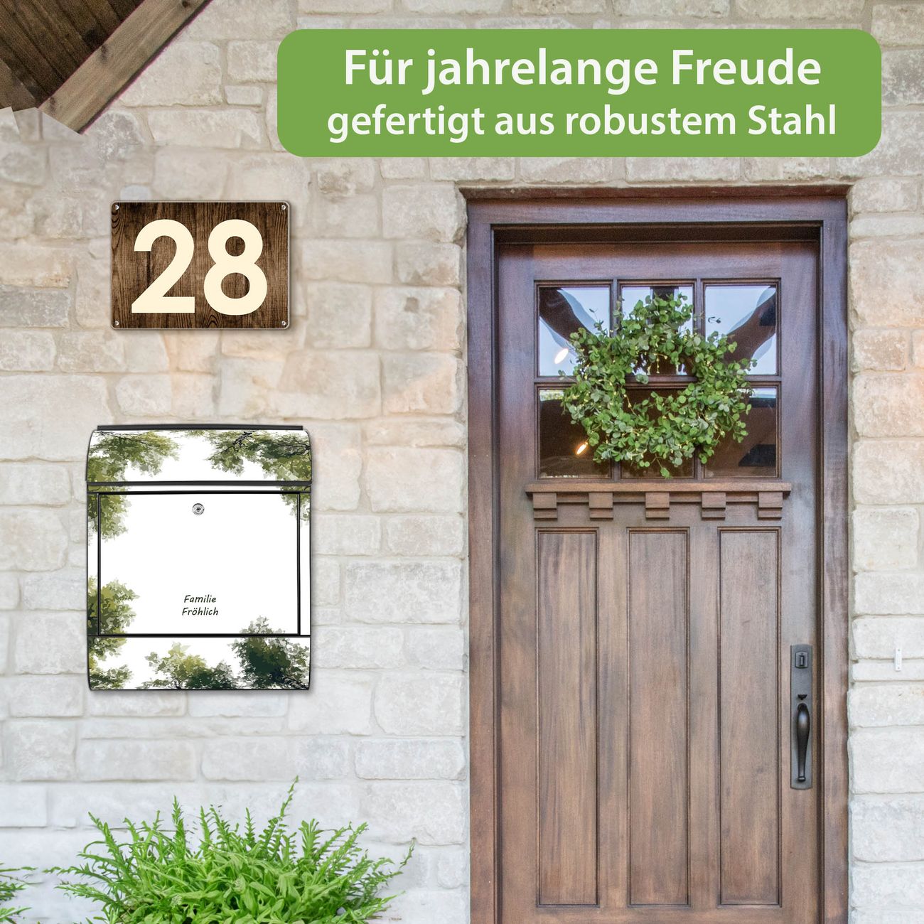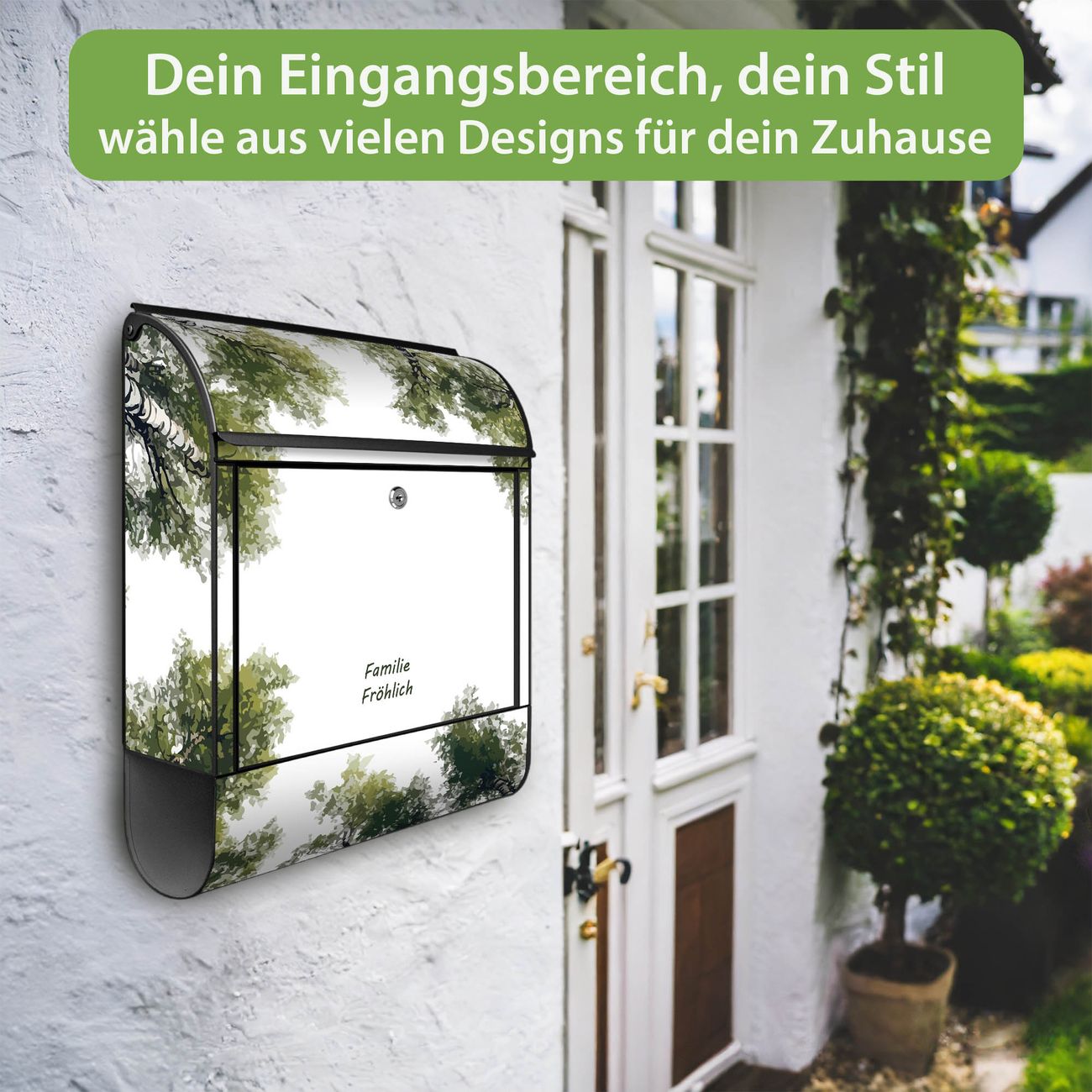 DESIGN: Der Postkasten mit Motiv Motiv Waldhimmel hat ein sehr ansprechendes und ausgefallenes Design, damit entlocken Sie Ihren Nachbarn und dem Postboten ein Lächeln. Heben Sie Sich von der tristen grauen Masse ab, ohne auf Funktionalität zu verzichten. DETAILS: Der Postkasten besteht aus pulverbeschichtetem Stahl. Er ist 38x46x12,5cm groß. Das Motiv besteht aus einer wetter- und UV-resistenten Folie, die mit einem Schutzlaminat überzogen ist, sodass der Briefkasten zusätzlich vor Kratzern geschützt ist. Der Briefkasten wird mit Montagematerial, zusätzlich zwei Schlüssel sowie einer Bohrschablone geliefert. NUTZEN: Sie können diesen Briefkasten sowohl als Wandbriefkasten montieren oder einen passenden Ständer kaufen und als Standbriefkasten einbetonieren. Die Größe bietet genügend Platz für Sendungen aller Art, der Einwurf fasst auch größere A4 Sendungen. BANJADO: Ihr Briefkasten wird in Sachsen in einer kleinen Manufaktur von Hand veredelt. Die Motivfolie ist lösungsmittelfrei und schutzlaminiert für einen langen Halt. Wir legen großen Wert auf die Verbindung von Funktionalität und Design. Sie erhalten Handarbeit aus Sachsen.