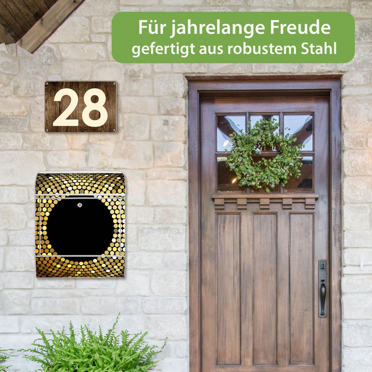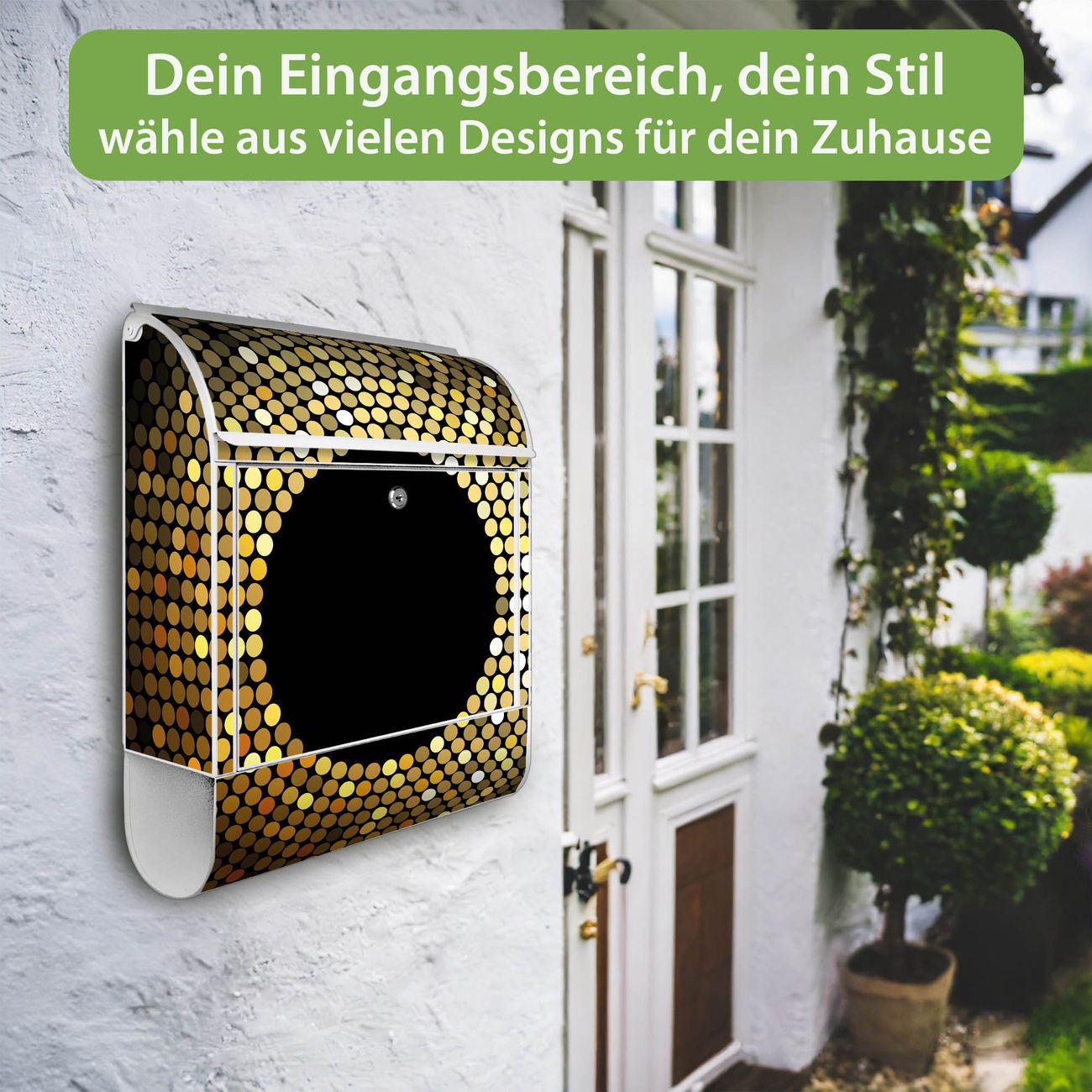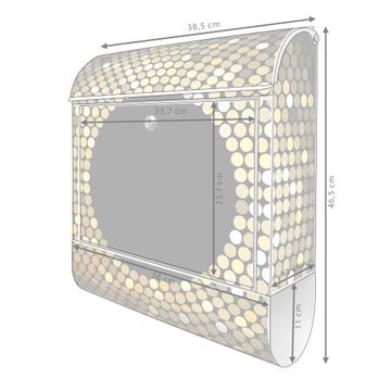 DESIGN: Der Postkasten mit Motiv Motiv WT Gold Disco hat ein sehr ansprechendes und ausgefallenes Design, damit entlocken Sie Ihren Nachbarn und dem Postboten ein Lächeln. Heben Sie Sich von der tristen grauen Masse ab, ohne auf Funktionalität zu verzichten. DETAILS: Der Postkasten besteht aus pulverbeschichtetem Stahl. Er ist 38x46x12,5cm groß. Das Motiv besteht aus einer wetter- und UV-resistenten Folie, die mit einem Schutzlaminat überzogen ist, sodass der Briefkasten zusätzlich vor Kratzern geschützt ist. Der Briefkasten wird mit Montagematerial, zusätzlich zwei Schlüssel sowie einer Bohrschablone geliefert. NUTZEN: Sie können diesen Briefkasten sowohl als Wandbriefkasten montieren oder einen passenden Ständer kaufen und als Standbriefkasten einbetonieren. Die Größe bietet genügend Platz für Sendungen aller Art, der Einwurf fasst auch größere A4 Sendungen. BANJADO: Ihr Briefkasten wird in Sachsen in einer kleinen Manufaktur von Hand veredelt. Die Motivfolie ist lösungsmittelfrei und schutzlaminiert für einen langen Halt. Wir legen großen Wert auf die Verbindung von Funktionalität und Design. Sie erhalten Handarbeit aus Sachsen.