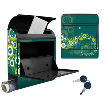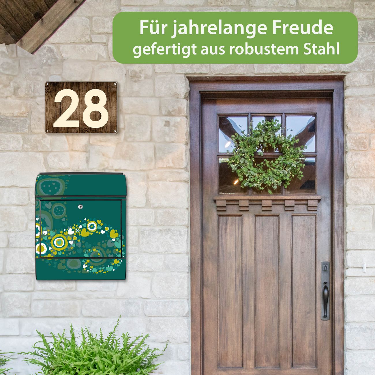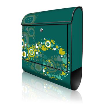 DESIGN: Der Postkasten mit Motiv Motiv WT Strömende Herzen hat ein sehr ansprechendes und ausgefallenes Design, damit entlocken Sie Ihren Nachbarn und dem Postboten ein Lächeln. Heben Sie Sich von der tristen grauen Masse ab, ohne auf Funktionalität zu verzichten. DETAILS: Der Postkasten besteht aus pulverbeschichtetem Stahl. Er ist 38x46x12,5cm groß. Das Motiv besteht aus einer wetter- und UV-resistenten Folie, die mit einem Schutzlaminat überzogen ist, sodass der Briefkasten zusätzlich vor Kratzern geschützt ist. Der Briefkasten wird mit Montagematerial, zusätzlich zwei Schlüssel sowie einer Bohrschablone geliefert. NUTZEN: Sie können diesen Briefkasten sowohl als Wandbriefkasten montieren oder einen passenden Ständer kaufen und als Standbriefkasten einbetonieren. Die Größe bietet genügend Platz für Sendungen aller Art, der Einwurf fasst auch größere A4 Sendungen. BANJADO: Ihr Briefkasten wird in Sachsen in einer kleinen Manufaktur von Hand veredelt. Die Motivfolie ist lösungsmittelfrei und schutzlaminiert für einen langen Halt. Wir legen großen Wert auf die Verbindung von Funktionalität und Design. Sie erhalten Handarbeit aus Sachsen.