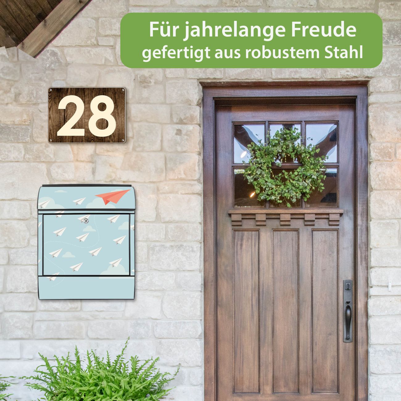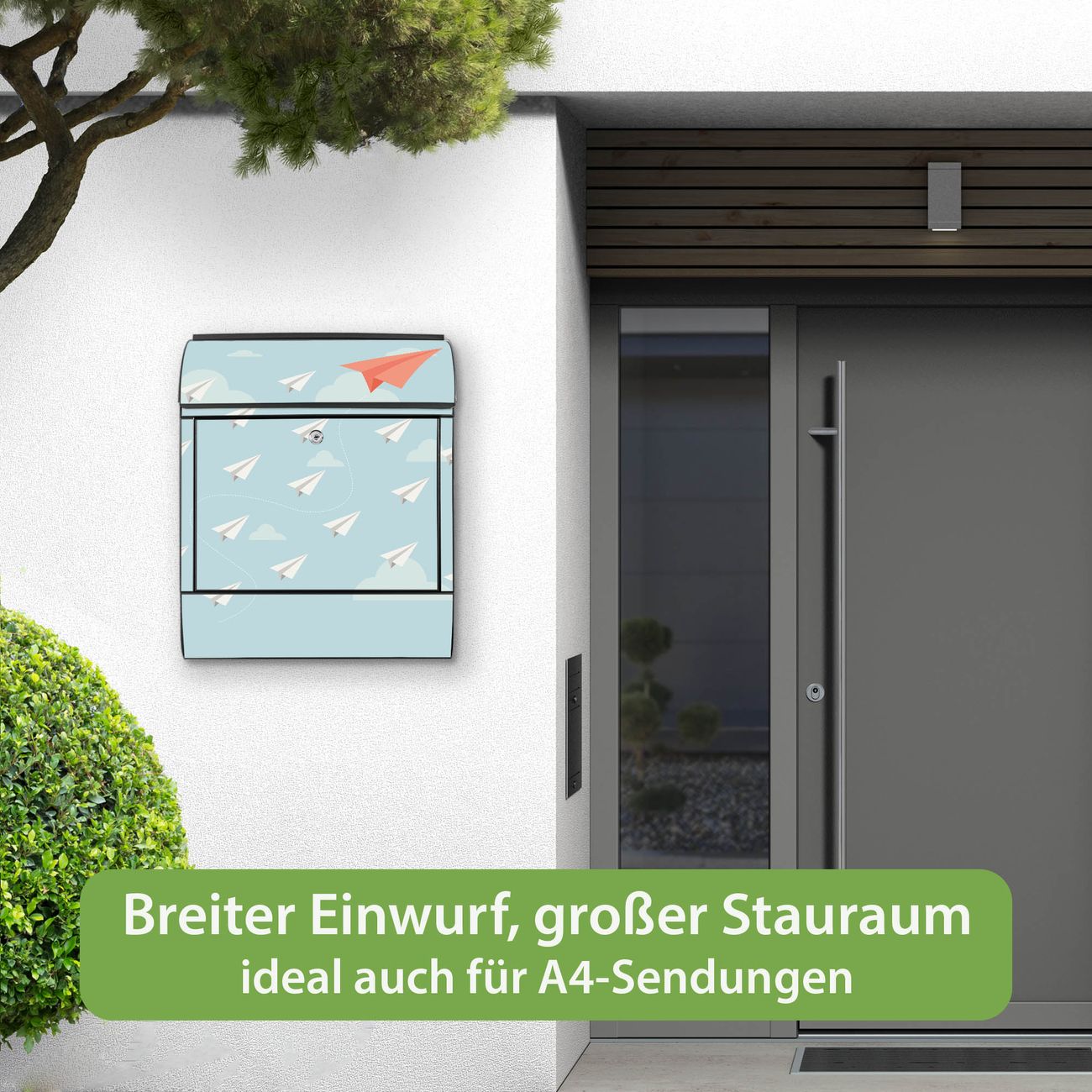 DESIGN: Der Postkasten mit Motiv Motiv WT Wolken hat ein sehr ansprechendes und ausgefallenes Design, damit entlocken Sie Ihren Nachbarn und dem Postboten ein Lächeln. Heben Sie Sich von der tristen grauen Masse ab, ohne auf Funktionalität zu verzichten. DETAILS: Der Postkasten besteht aus pulverbeschichtetem Stahl. Er ist 38x46x12,5cm groß. Das Motiv besteht aus einer wetter- und UV-resistenten Folie, die mit einem Schutzlaminat überzogen ist, sodass der Briefkasten zusätzlich vor Kratzern geschützt ist. Der Briefkasten wird mit Montagematerial, zusätzlich zwei Schlüssel sowie einer Bohrschablone geliefert. NUTZEN: Sie können diesen Briefkasten sowohl als Wandbriefkasten montieren oder einen passenden Ständer kaufen und als Standbriefkasten einbetonieren. Die Größe bietet genügend Platz für Sendungen aller Art, der Einwurf fasst auch größere A4 Sendungen. BANJADO: Ihr Briefkasten wird in Sachsen in einer kleinen Manufaktur von Hand veredelt. Die Motivfolie ist lösungsmittelfrei und schutzlaminiert für einen langen Halt. Wir legen großen Wert auf die Verbindung von Funktionalität und Design. Sie erhalten Handarbeit aus Sachsen.