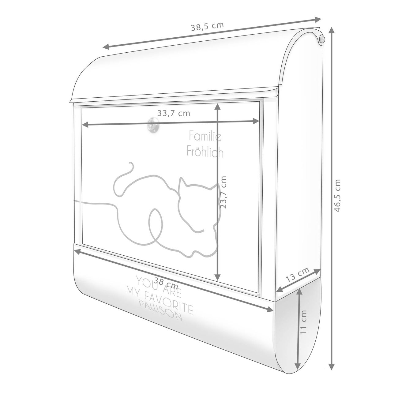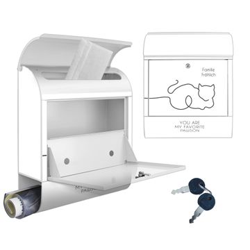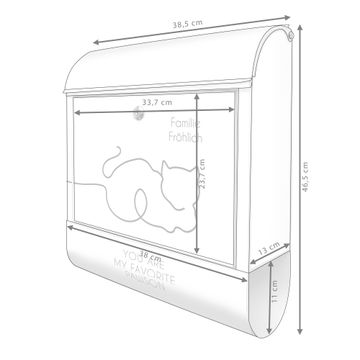 DESIGN: Der Postkasten mit Motiv Motiv You are my favourite Pawson hat ein sehr ansprechendes und ausgefallenes Design, damit entlocken Sie Ihren Nachbarn und dem Postboten ein Lächeln. Heben Sie Sich von der tristen grauen Masse ab, ohne auf Funktionalität zu verzichten. DETAILS: Der Postkasten besteht aus pulverbeschichtetem Stahl. Er ist 38x46x12,5cm groß. Das Motiv besteht aus einer wetter- und UV-resistenten Folie, die mit einem Schutzlaminat überzogen ist, sodass der Briefkasten zusätzlich vor Kratzern geschützt ist. Der Briefkasten wird mit Montagematerial, zusätzlich zwei Schlüssel sowie einer Bohrschablone geliefert. NUTZEN: Sie können diesen Briefkasten sowohl als Wandbriefkasten montieren oder einen passenden Ständer kaufen und als Standbriefkasten einbetonieren. Die Größe bietet genügend Platz für Sendungen aller Art, der Einwurf fasst auch größere A4 Sendungen. BANJADO: Ihr Briefkasten wird in Sachsen in einer kleinen Manufaktur von Hand veredelt. Die Motivfolie ist lösungsmittelfrei und schutzlaminiert für einen langen Halt. Wir legen großen Wert auf die Verbindung von Funktionalität und Design. Sie erhalten Handarbeit aus Sachsen.