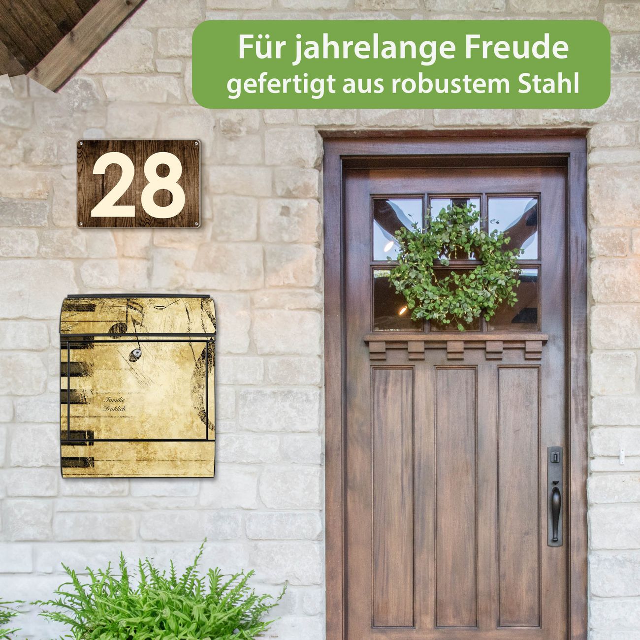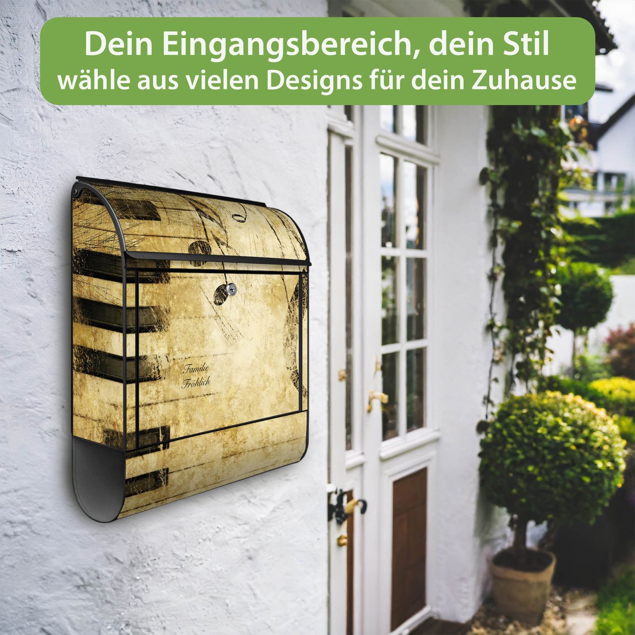 DESIGN: Der Postkasten mit Motiv Motiv Music hat ein sehr ansprechendes und ausgefallenes Design, damit entlocken Sie Ihren Nachbarn und dem Postboten ein Lächeln. Heben Sie Sich von der tristen grauen Masse ab, ohne auf Funktionalität zu verzichten. DETAILS: Der Postkasten besteht aus pulverbeschichtetem Stahl. Er ist 38x46x12,5cm groß. Das Motiv besteht aus einer wetter- und UV-resistenten Folie, die mit einem Schutzlaminat überzogen ist, sodass der Briefkasten zusätzlich vor Kratzern geschützt ist. Der Briefkasten wird mit Montagematerial, zusätzlich zwei Schlüssel sowie einer Bohrschablone geliefert. NUTZEN: Sie können diesen Briefkasten sowohl als Wandbriefkasten montieren oder einen passenden Ständer kaufen und als Standbriefkasten einbetonieren. Die Größe bietet genügend Platz für Sendungen aller Art, der Einwurf fasst auch größere A4 Sendungen. BANJADO: Ihr Briefkasten wird in Sachsen in einer kleinen Manufaktur von Hand veredelt. Die Motivfolie ist lösungsmittelfrei und schutzlaminiert für einen langen Halt. Wir legen großen Wert auf die Verbindung von Funktionalität und Design. Sie erhalten Handarbeit aus Sachsen.
