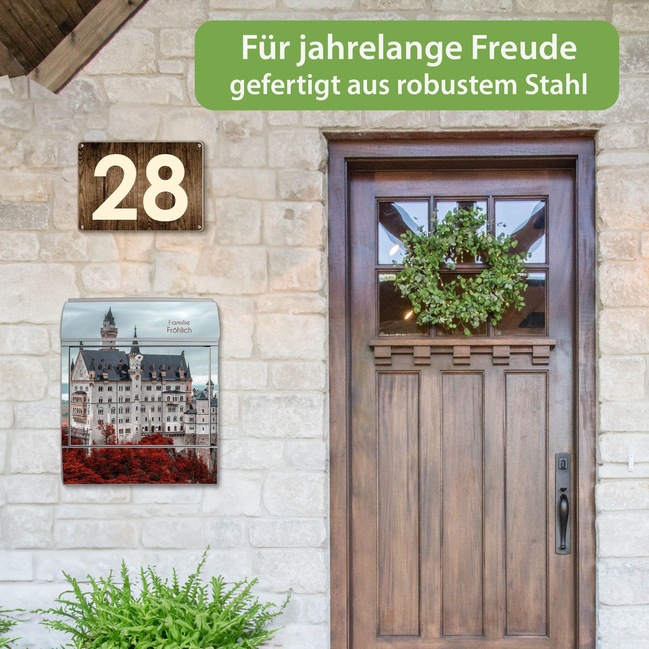 DESIGN: Der Postkasten mit Motiv Motiv Neuschwanstein hat ein sehr ansprechendes und ausgefallenes Design, damit entlocken Sie Ihren Nachbarn und dem Postboten ein Lächeln. Heben Sie Sich von der tristen grauen Masse ab, ohne auf Funktionalität zu verzichten. DETAILS: Der Postkasten besteht aus pulverbeschichtetem Stahl. Er ist 38x46x12,5cm groß. Das Motiv besteht aus einer wetter- und UV-resistenten Folie, die mit einem Schutzlaminat überzogen ist, sodass der Briefkasten zusätzlich vor Kratzern geschützt ist. Der Briefkasten wird mit Montagematerial, zusätzlich zwei Schlüssel sowie einer Bohrschablone geliefert. NUTZEN: Sie können diesen Briefkasten sowohl als Wandbriefkasten montieren oder einen passenden Ständer kaufen und als Standbriefkasten einbetonieren. Die Größe bietet genügend Platz für Sendungen aller Art, der Einwurf fasst auch größere A4 Sendungen. BANJADO: Ihr Briefkasten wird in Sachsen in einer kleinen Manufaktur von Hand veredelt. Die Motivfolie ist lösungsmittelfrei und schutzlaminiert für einen langen Halt. Wir legen großen Wert auf die Verbindung von Funktionalität und Design. Sie erhalten Handarbeit aus Sachsen.