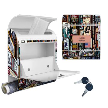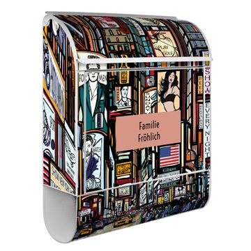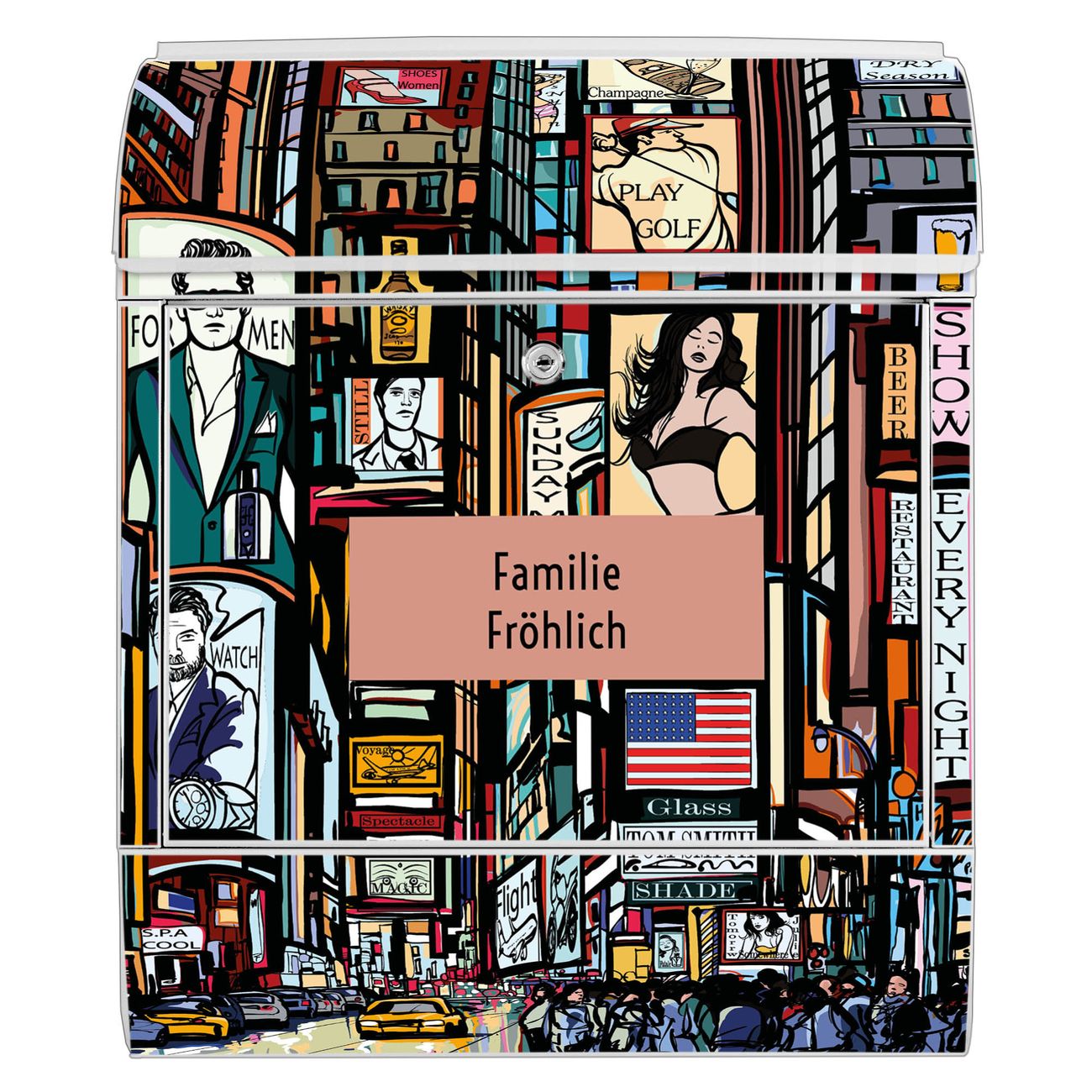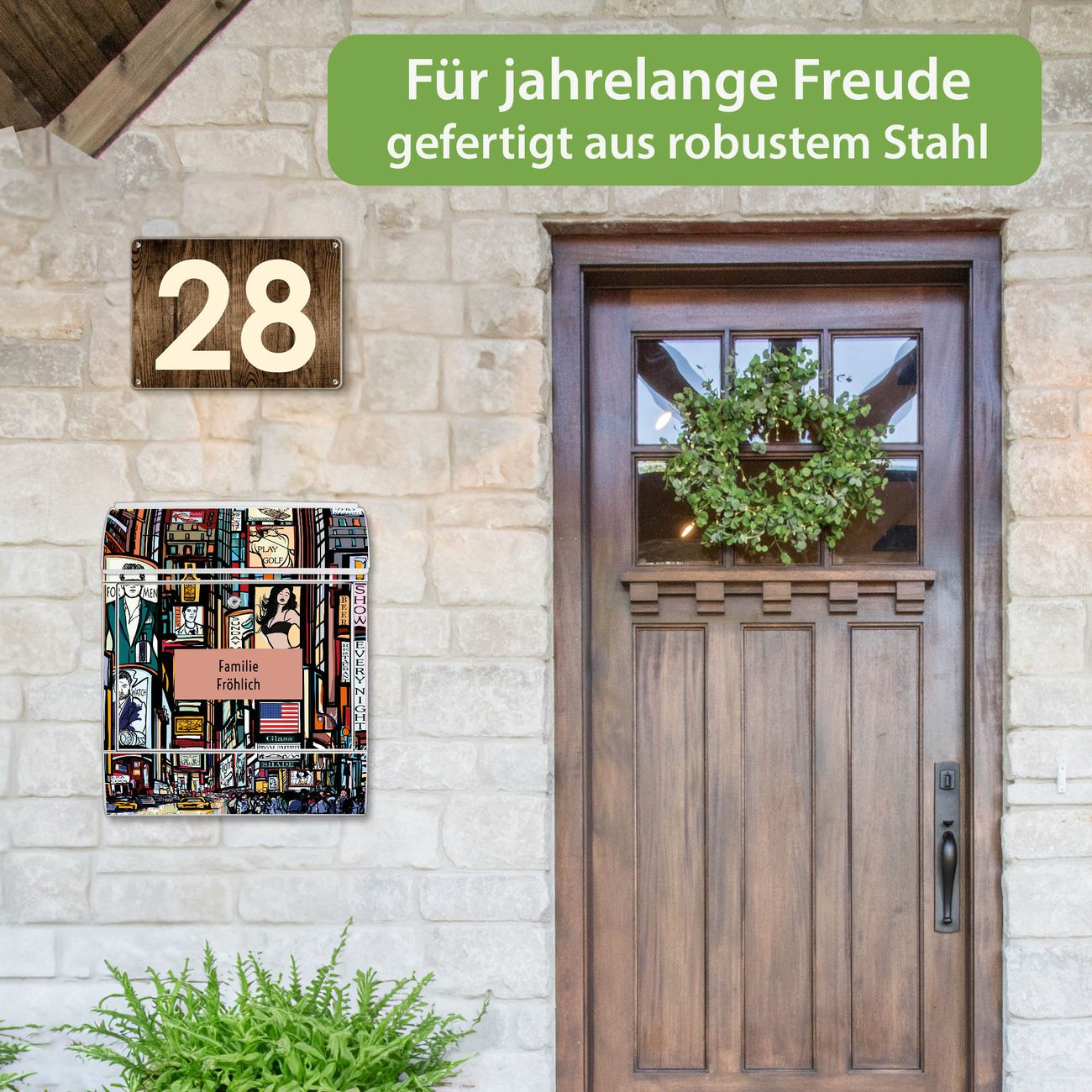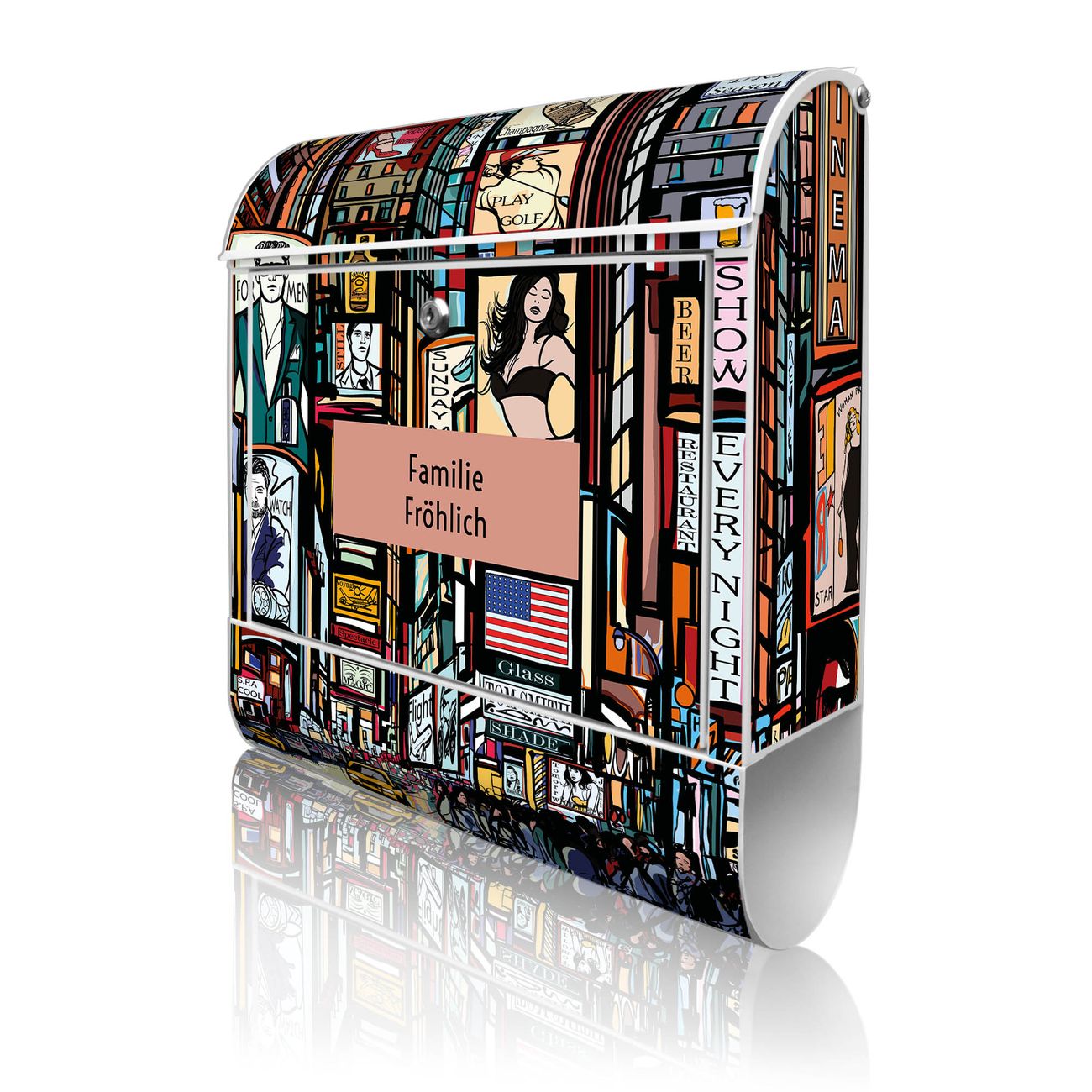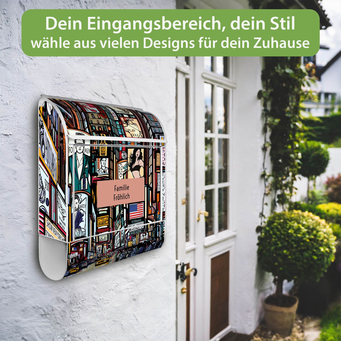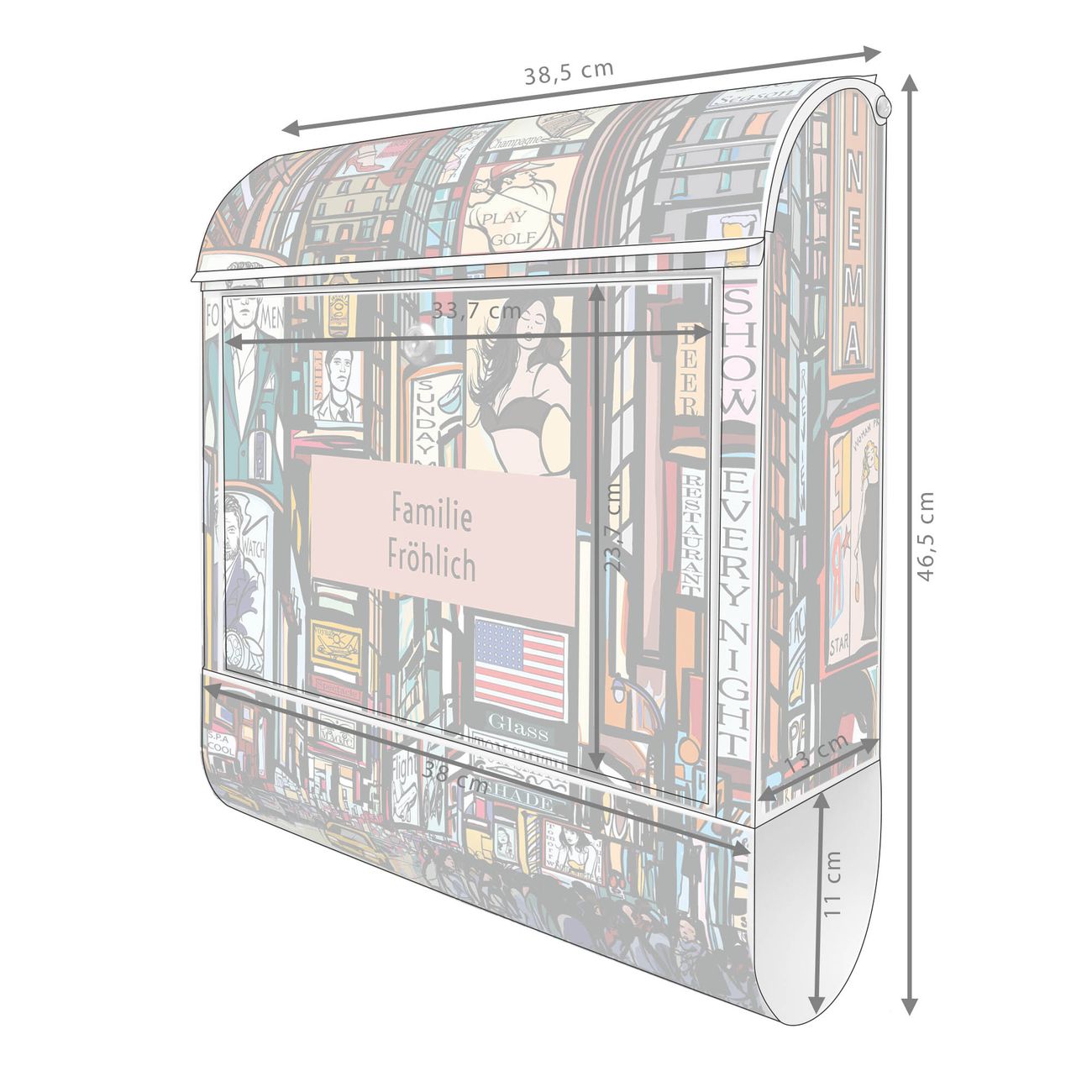 DESIGN: Der Postkasten mit Motiv Motiv New York Show hat ein sehr ansprechendes und ausgefallenes Design, damit entlocken Sie Ihren Nachbarn und dem Postboten ein Lächeln. Heben Sie Sich von der tristen grauen Masse ab, ohne auf Funktionalität zu verzichten. DETAILS: Der Postkasten besteht aus pulverbeschichtetem Stahl. Er ist 38x46x12,5cm groß. Das Motiv besteht aus einer wetter- und UV-resistenten Folie, die mit einem Schutzlaminat überzogen ist, sodass der Briefkasten zusätzlich vor Kratzern geschützt ist. Der Briefkasten wird mit Montagematerial, zusätzlich zwei Schlüssel sowie einer Bohrschablone geliefert. NUTZEN: Sie können diesen Briefkasten sowohl als Wandbriefkasten montieren oder einen passenden Ständer kaufen und als Standbriefkasten einbetonieren. Die Größe bietet genügend Platz für Sendungen aller Art, der Einwurf fasst auch größere A4 Sendungen. BANJADO: Ihr Briefkasten wird in Sachsen in einer kleinen Manufaktur von Hand veredelt. Die Motivfolie ist lösungsmittelfrei und schutzlaminiert für einen langen Halt. Wir legen großen Wert auf die Verbindung von Funktionalität und Design. Sie erhalten Handarbeit aus Sachsen.