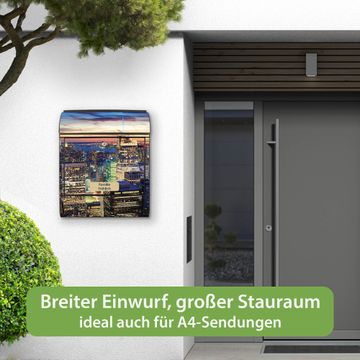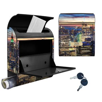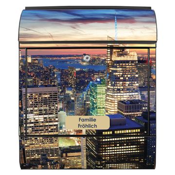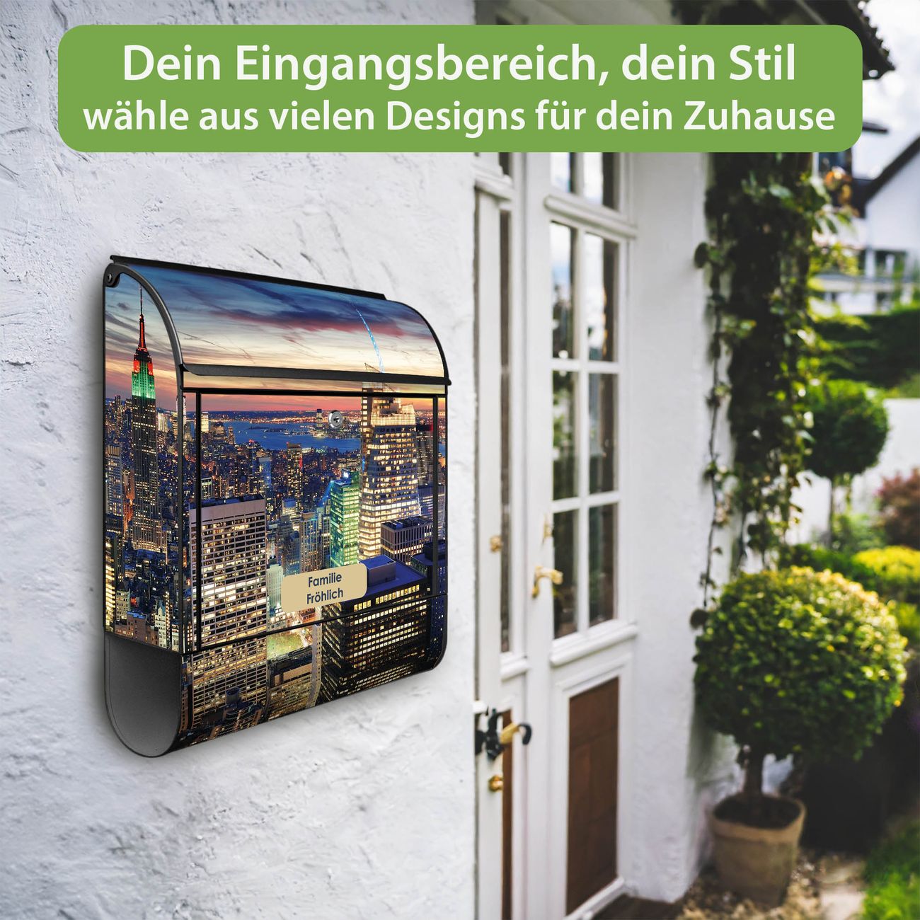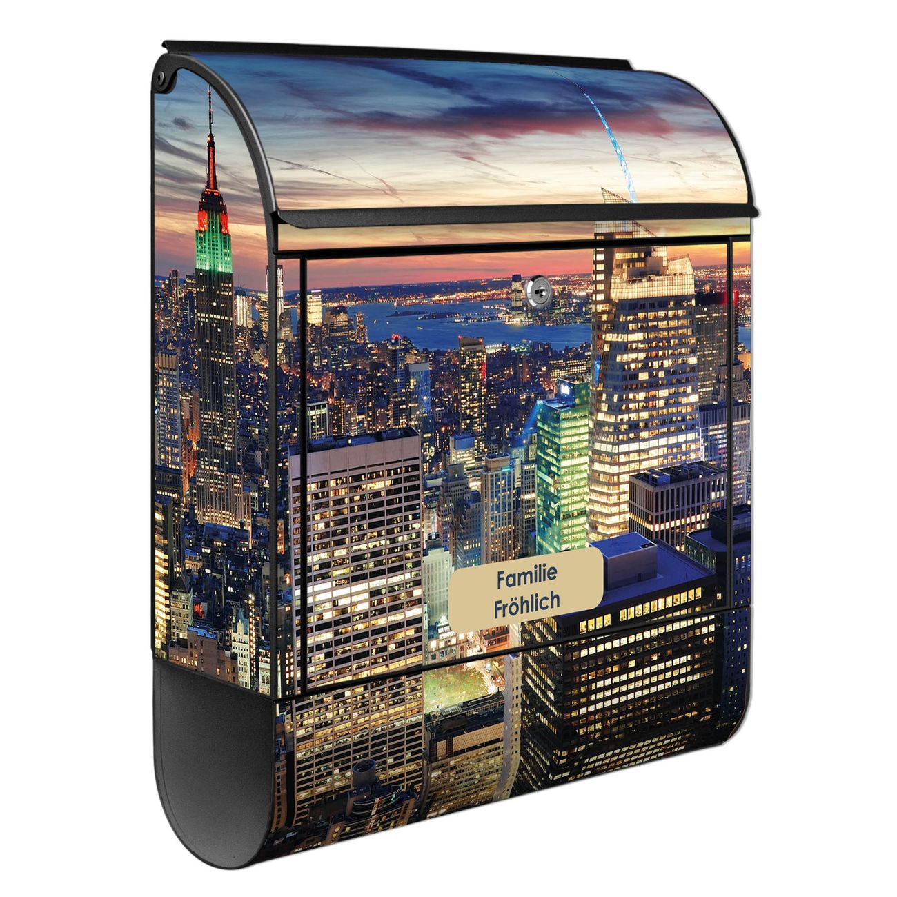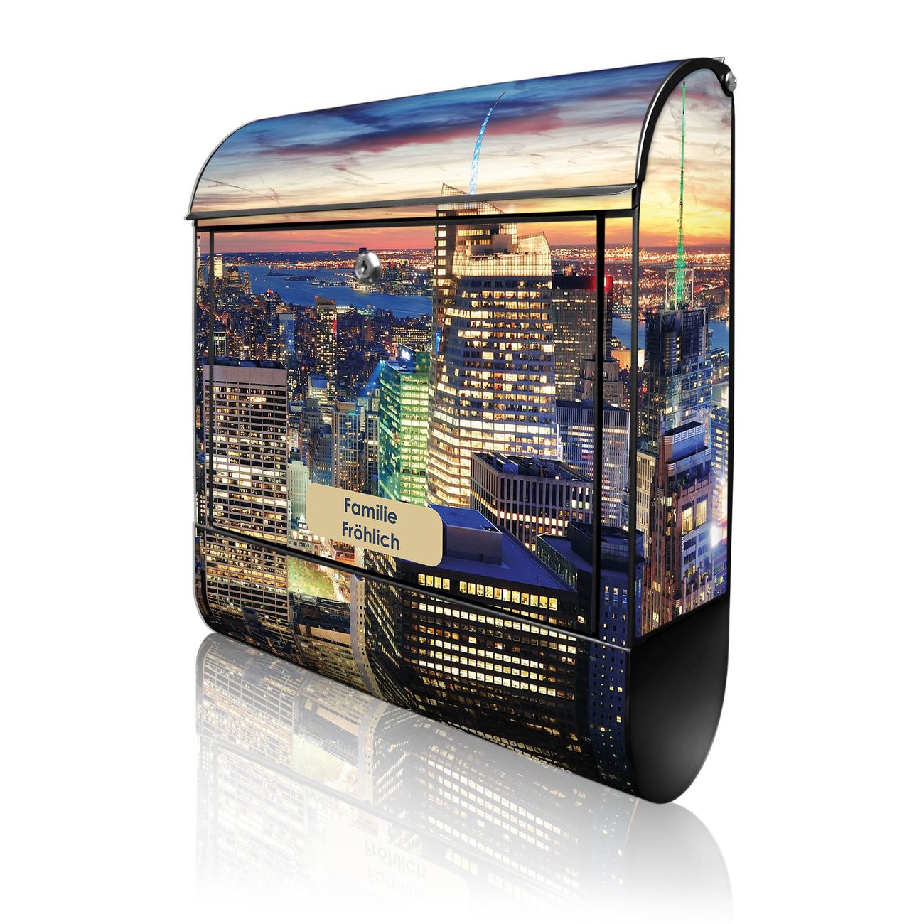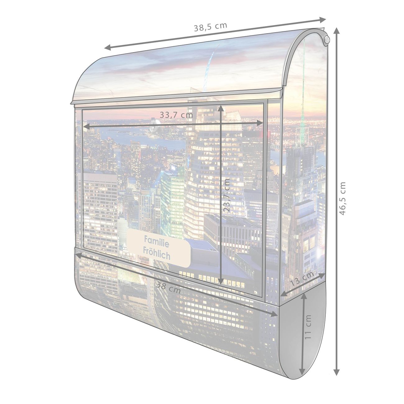 DESIGN: Der Postkasten mit Motiv Motiv New York Sunset hat ein sehr ansprechendes und ausgefallenes Design, damit entlocken Sie Ihren Nachbarn und dem Postboten ein Lächeln. Heben Sie Sich von der tristen grauen Masse ab, ohne auf Funktionalität zu verzichten. DETAILS: Der Postkasten besteht aus pulverbeschichtetem Stahl. Er ist 38x46x12,5cm groß. Das Motiv besteht aus einer wetter- und UV-resistenten Folie, die mit einem Schutzlaminat überzogen ist, sodass der Briefkasten zusätzlich vor Kratzern geschützt ist. Der Briefkasten wird mit Montagematerial, zusätzlich zwei Schlüssel sowie einer Bohrschablone geliefert. NUTZEN: Sie können diesen Briefkasten sowohl als Wandbriefkasten montieren oder einen passenden Ständer kaufen und als Standbriefkasten einbetonieren. Die Größe bietet genügend Platz für Sendungen aller Art, der Einwurf fasst auch größere A4 Sendungen. BANJADO: Ihr Briefkasten wird in Sachsen in einer kleinen Manufaktur von Hand veredelt. Die Motivfolie ist lösungsmittelfrei und schutzlaminiert für einen langen Halt. Wir legen großen Wert auf die Verbindung von Funktionalität und Design. Sie erhalten Handarbeit aus Sachsen.