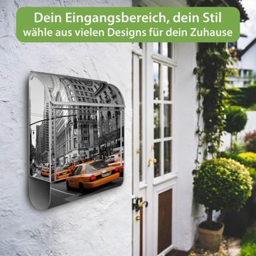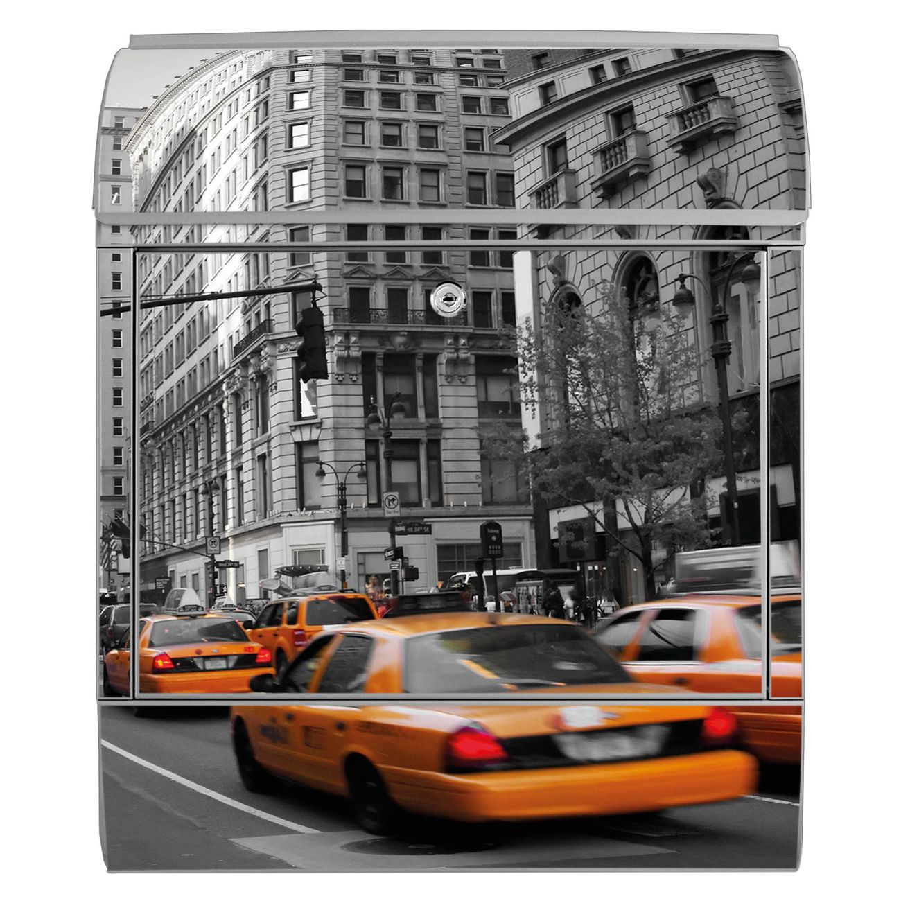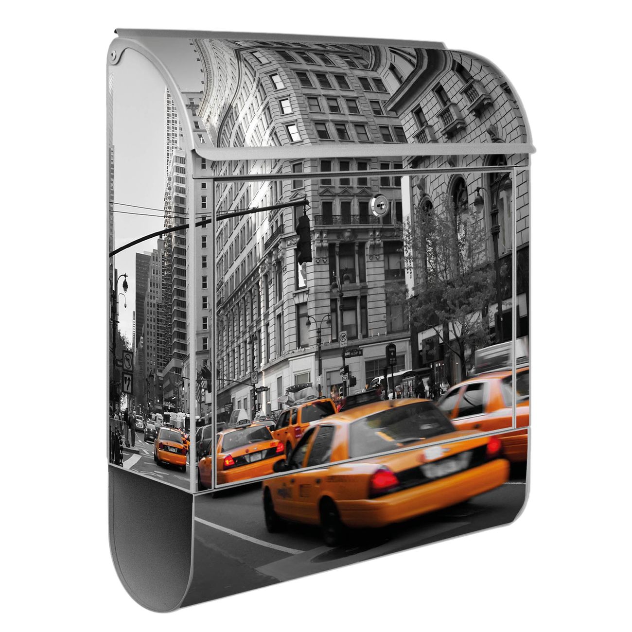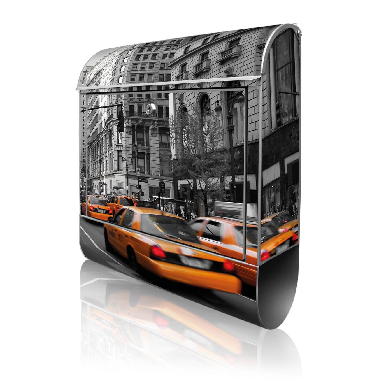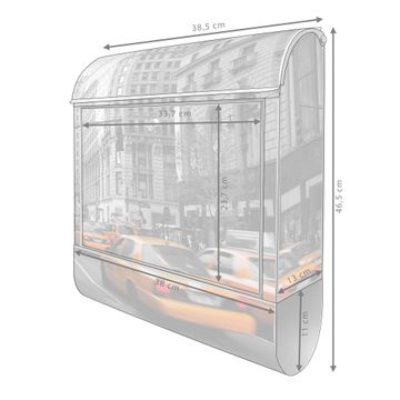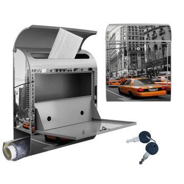DESIGN: Der Postkasten mit Motiv Motiv New York Taxi hat ein sehr ansprechendes und ausgefallenes Design, damit entlocken Sie Ihren Nachbarn und dem Postboten ein Lächeln. Heben Sie Sich von der tristen grauen Masse ab, ohne auf Funktionalität zu verzichten. DETAILS: Der Postkasten besteht aus pulverbeschichtetem Stahl. Er ist 38x46x12,5cm groß. Das Motiv besteht aus einer wetter- und UV-resistenten Folie, die mit einem Schutzlaminat überzogen ist, sodass der Briefkasten zusätzlich vor Kratzern geschützt ist. Der Briefkasten wird mit Montagematerial, zusätzlich zwei Schlüssel sowie einer Bohrschablone geliefert. NUTZEN: Sie können diesen Briefkasten sowohl als Wandbriefkasten montieren oder einen passenden Ständer kaufen und als Standbriefkasten einbetonieren. Die Größe bietet genügend Platz für Sendungen aller Art, der Einwurf fasst auch größere A4 Sendungen. BANJADO: Ihr Briefkasten wird in Sachsen in einer kleinen Manufaktur von Hand veredelt. Die Motivfolie ist lösungsmittelfrei und schutzlaminiert für einen langen Halt. Wir legen großen Wert auf die Verbindung von Funktionalität und Design. Sie erhalten Handarbeit aus Sachsen.